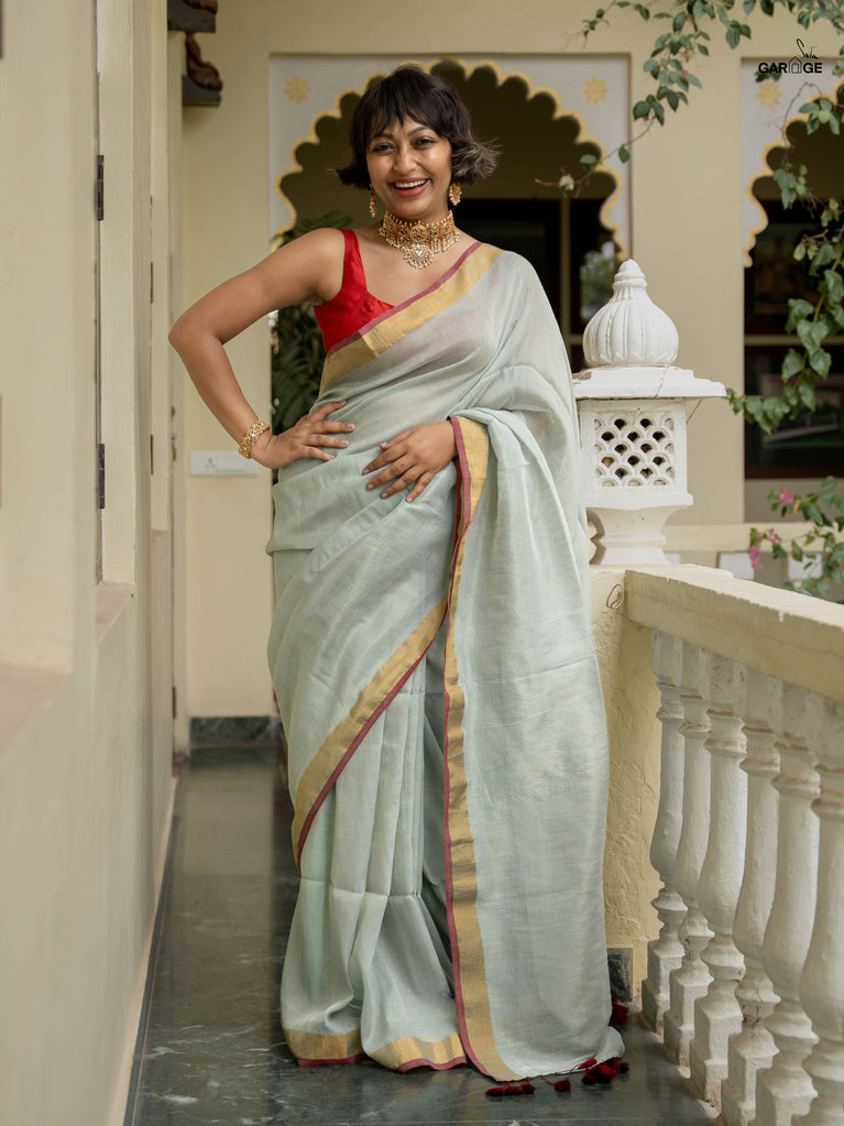 Imagine styling yourself in the mesmerizing Aasmani Mehfil Saree in light blue, crafted with a cotton slub fabric that’s lightweight yet rich. Perfect for celebrations, this festive saree features a red and gold border with intricate zari details and zari stripes throughout the saree.