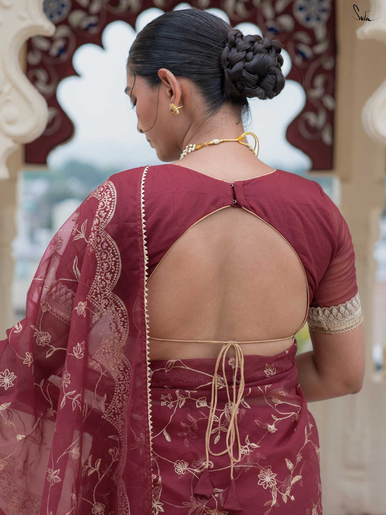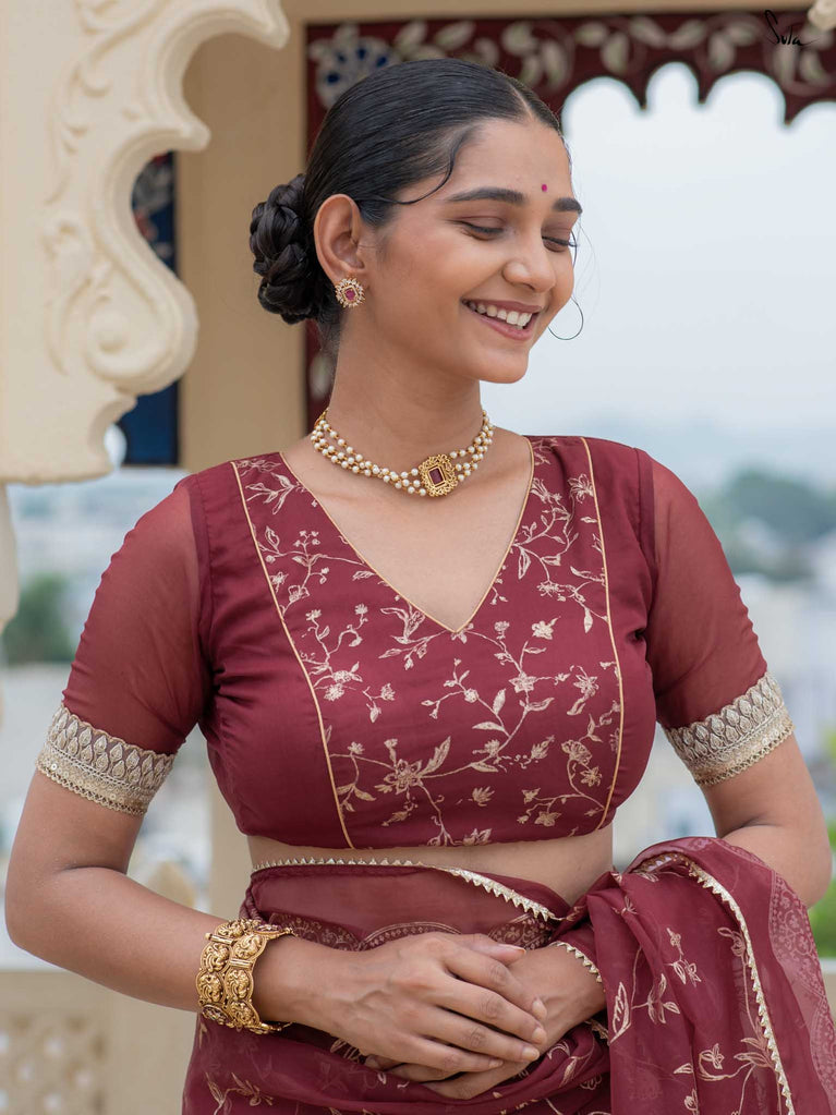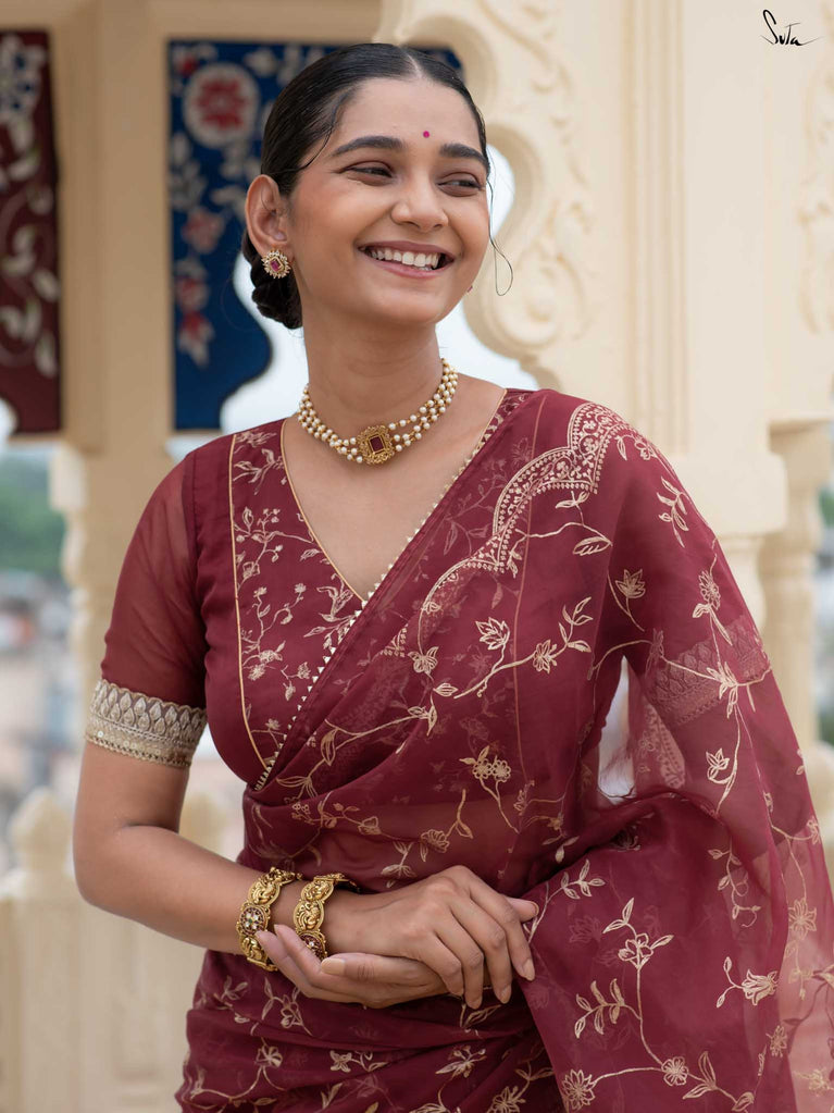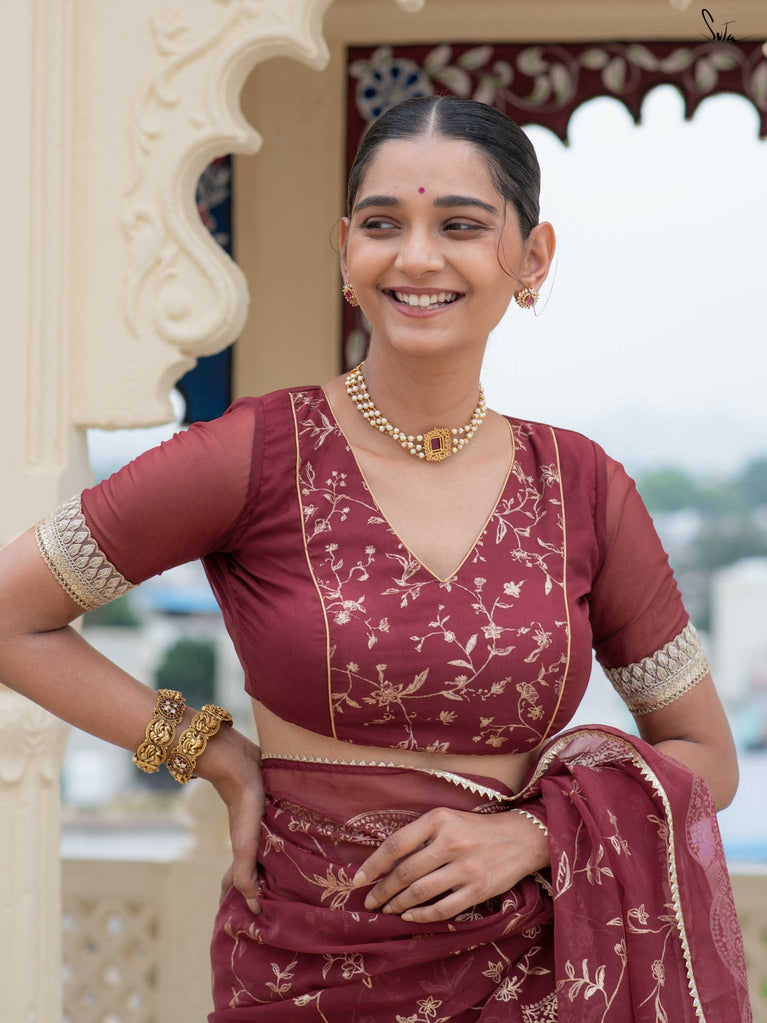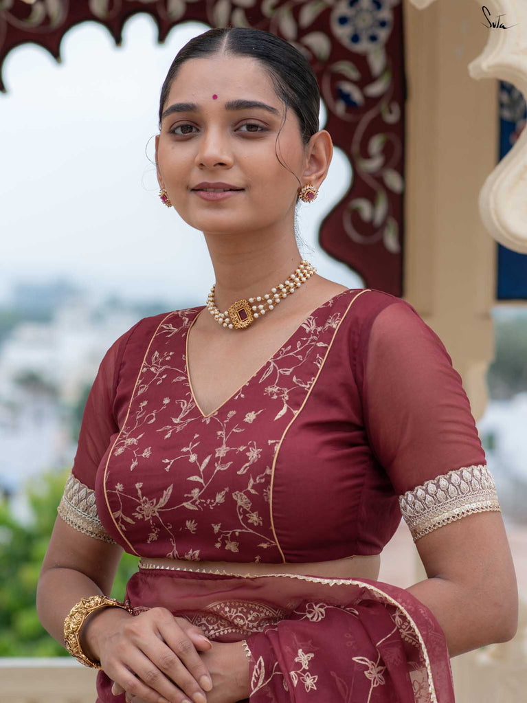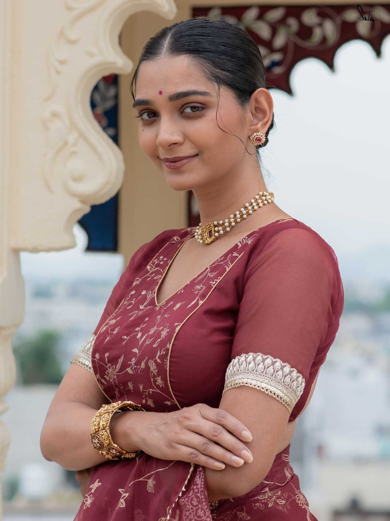 Step into festive celebrations with Aalta Twist, a half-sleeve blouse in rich maroon foil organza. Featuring a V-neckline and delicate golden floral foil prints with intricate lace detailing, it’s perfect for bridesmaids, weddings, or Diwali festivities.