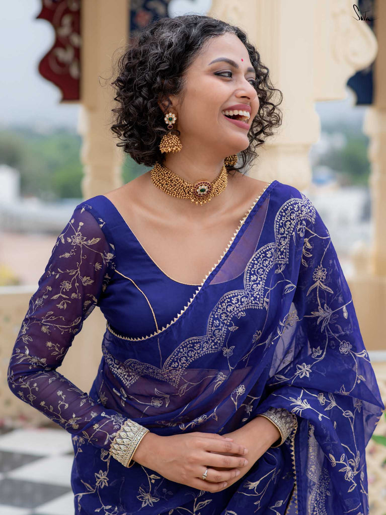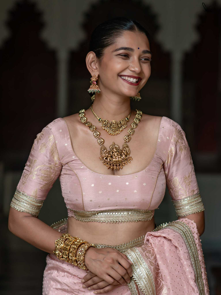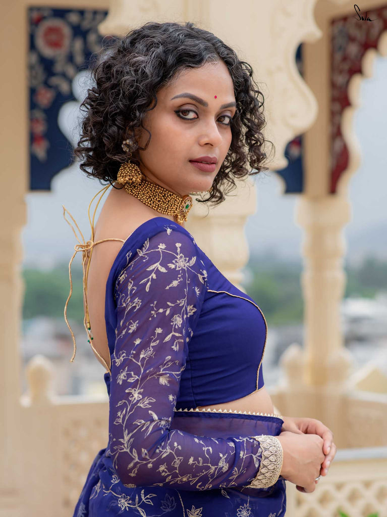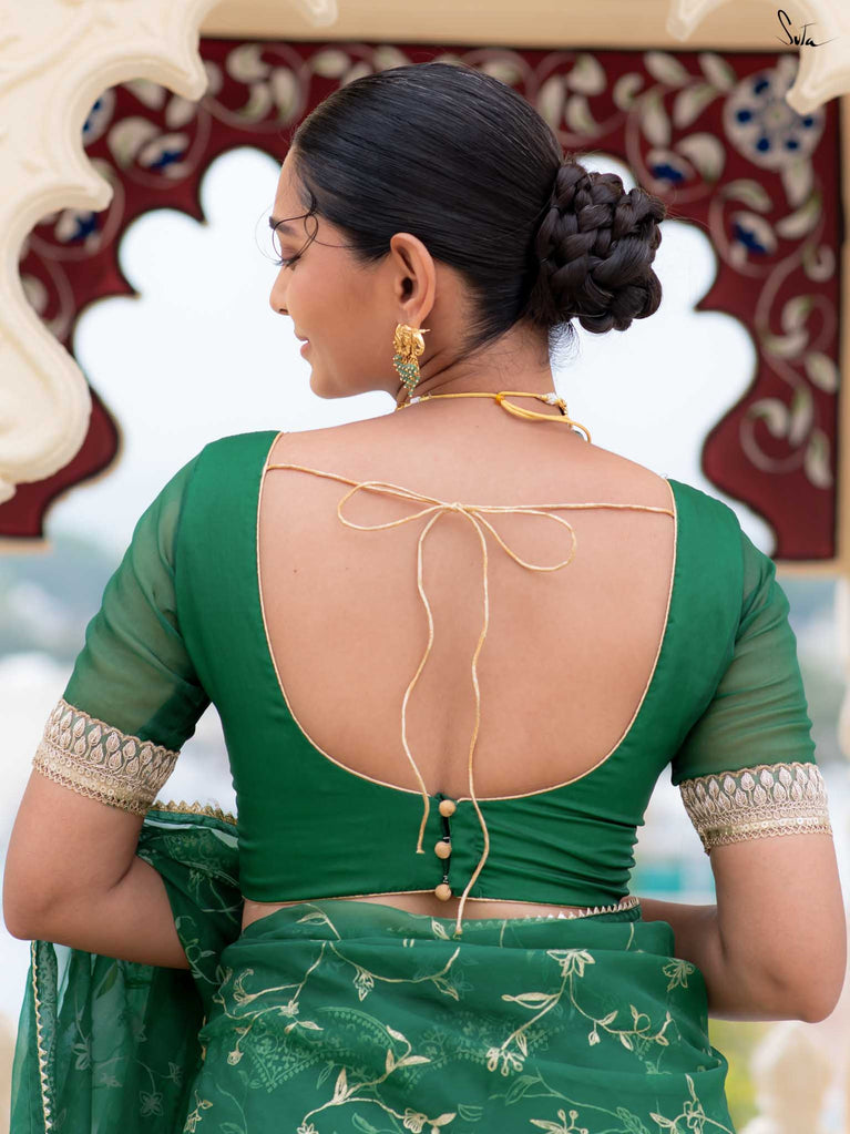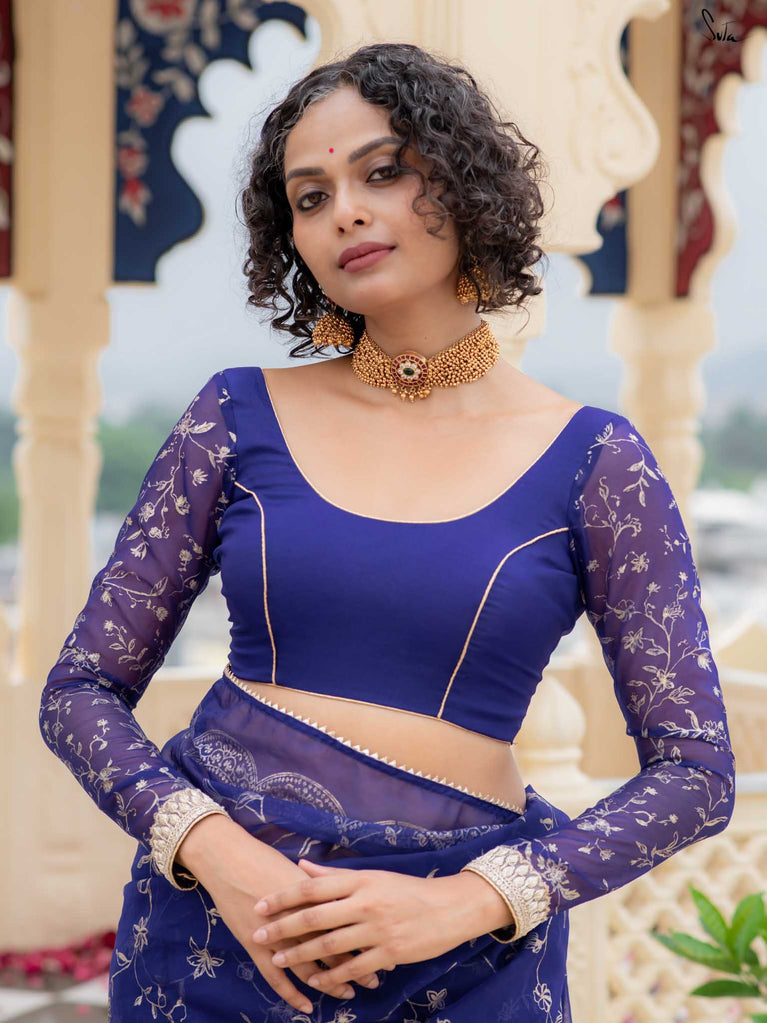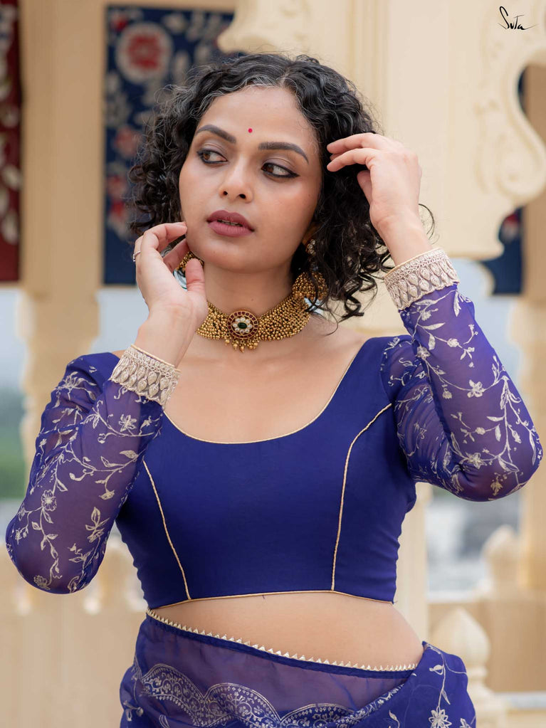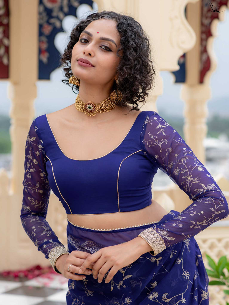 Designed with sheer sleeves, light padding, and a back hook-and-knot closure, this blouse pairs beautifully with matching sarees, adding twirl-worthy glamour and elegant charm to every occasion.