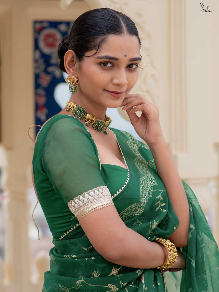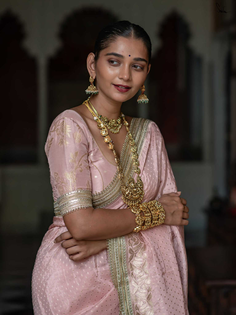 The model is wearing size S blouse and the saree is Gulabi Foil