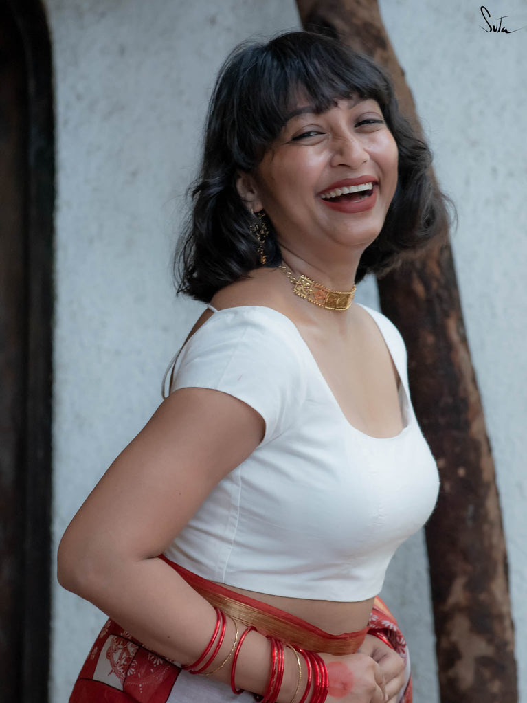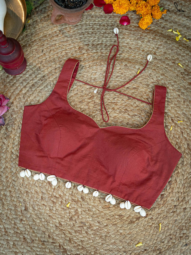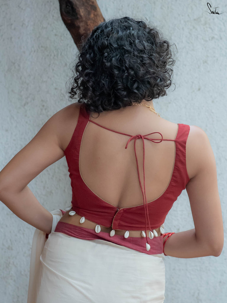 Designed with Pujo days in mind, this maroon cotton blouse with a refined dome neckline and sleeveless cut is all about keeping you chic and comfortable. The breathable cotton keeps you cool when the pandal crowds get overwhelming. It’s the kind of blouse that lets you move, laugh, eat, dance, and join the adda without a second thought. Pair it with your favourite saree and you’re set for long, joy-filled Pujo days—no fuss, just full carefree abandon.