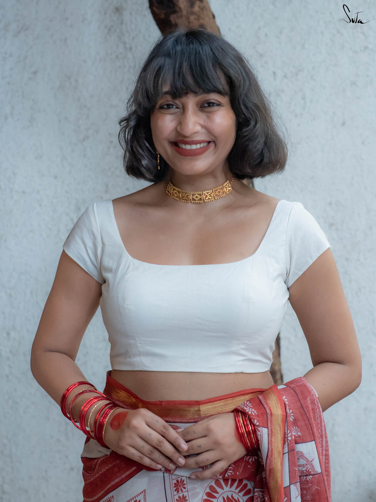 Simple never looked this striking. This white cotton blouse with a clean U-neckline is that quiet essential every Pujo wardrobe needs. Breathable, easy, and endlessly versatile, it slips into your festive line-up without asking for effort.