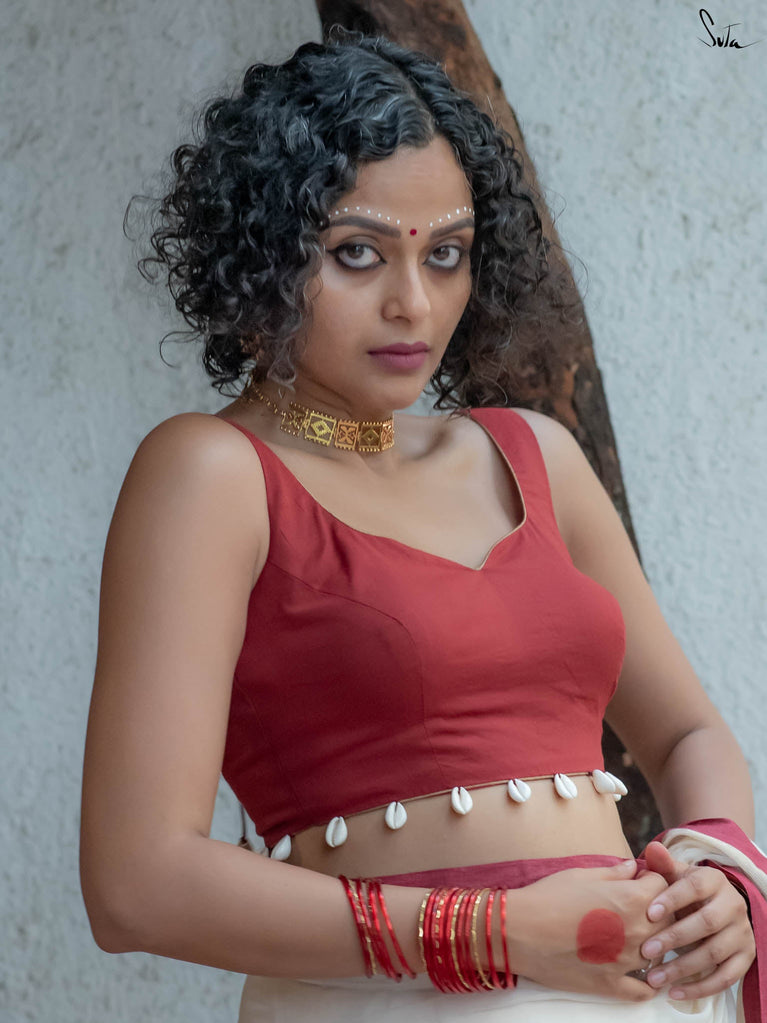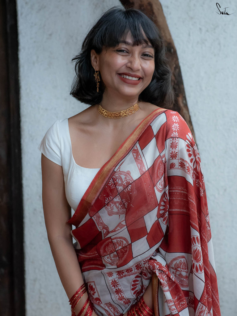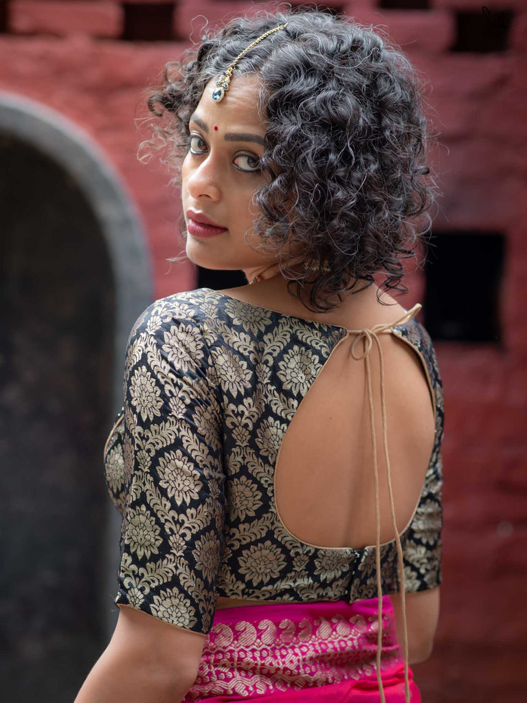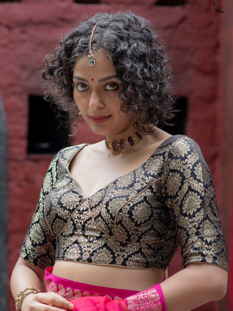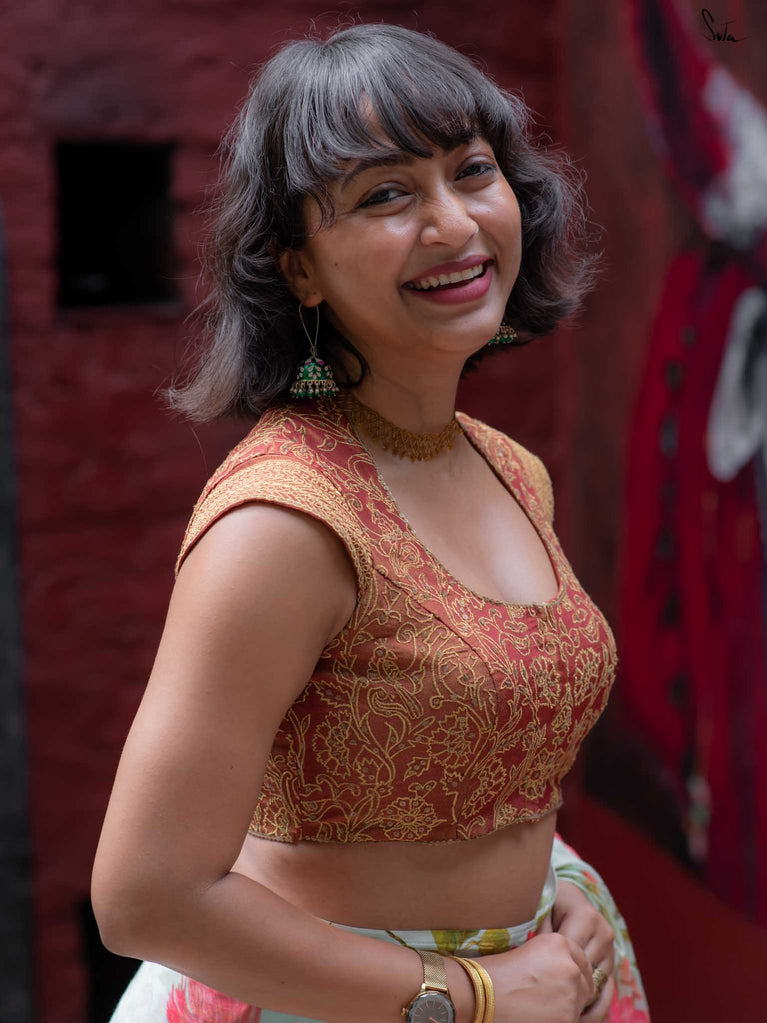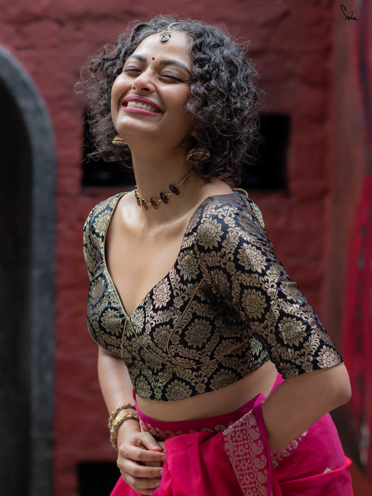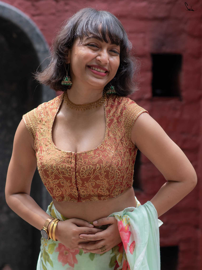 Named after Debjani’s endearing charm, this wine art silk blouse made by her is a must have. The dome neck and sleeveless cut flatter your shoulders, while the floral embroidered buttis add a delicate, artisanal touch. Padded and crafted with side elastic, it fits beautifully.