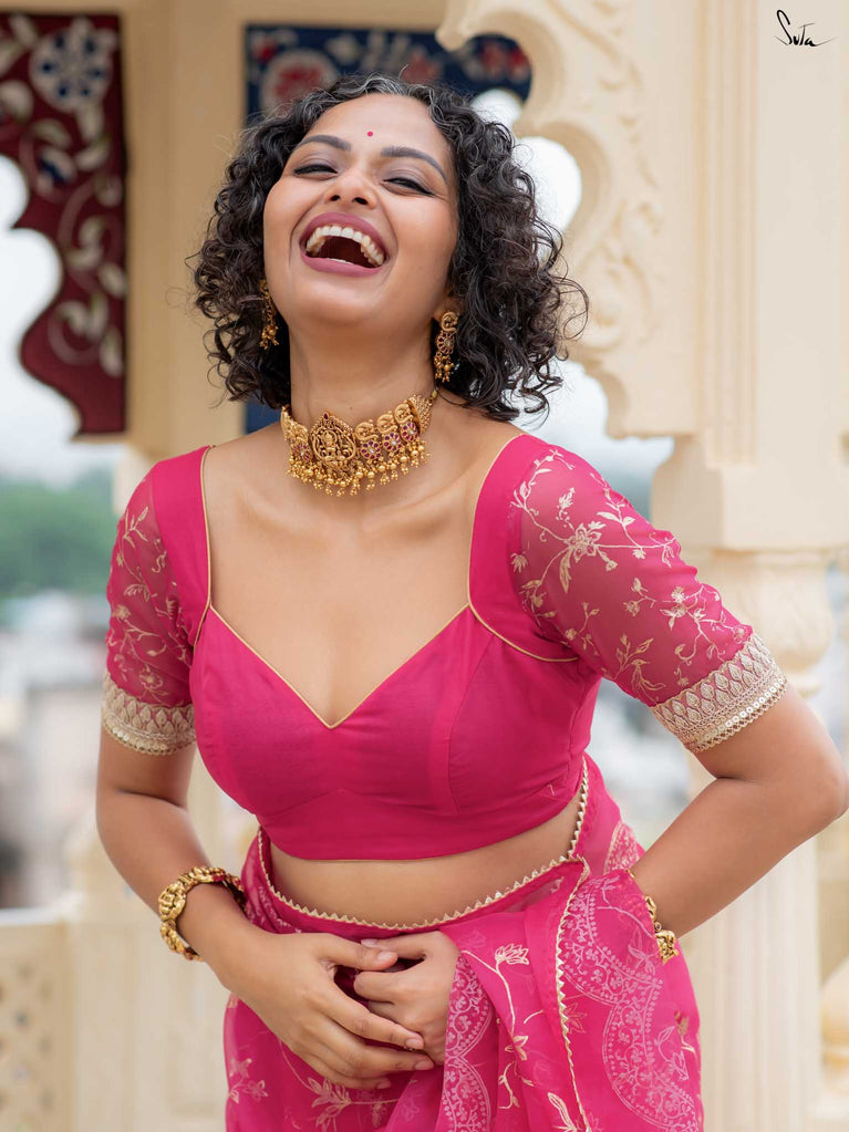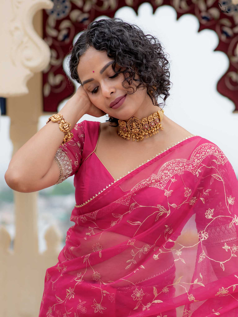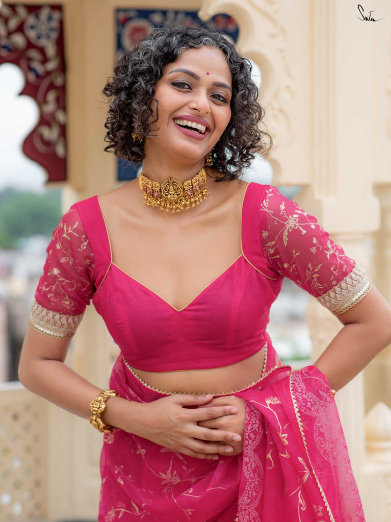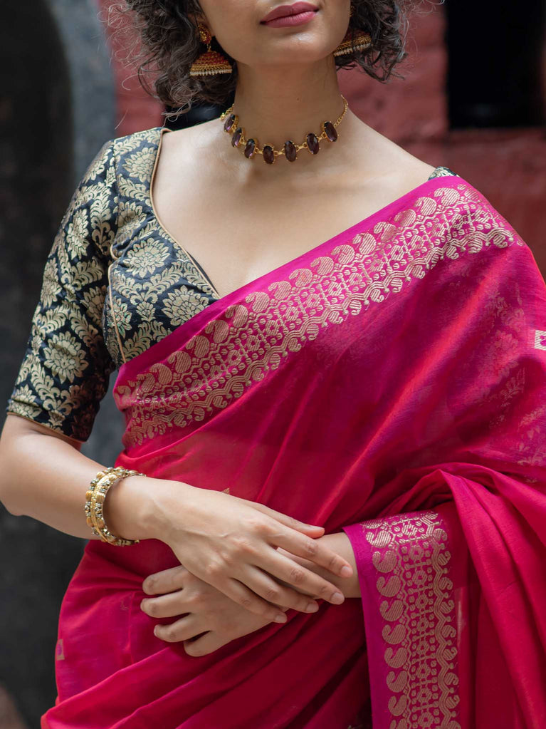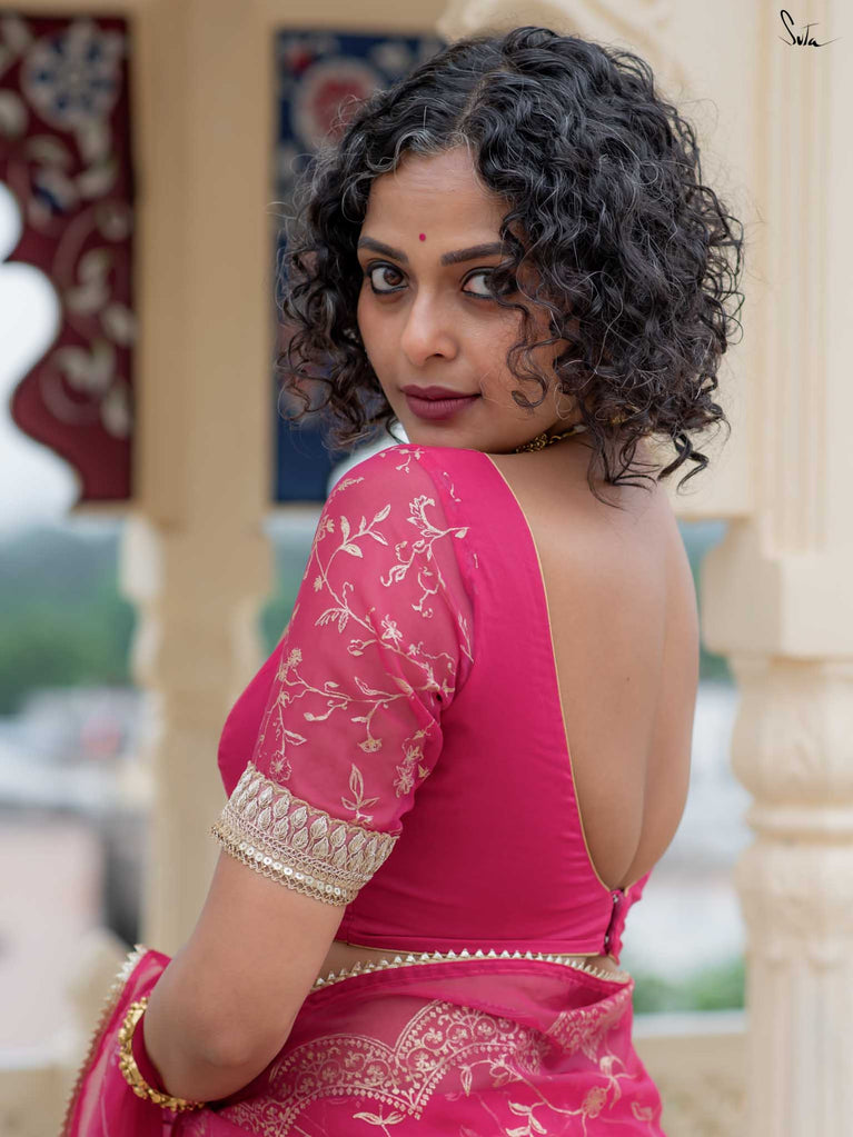 Bright pink viscose blouse with intricate zari embroidery. Modern cuts designed to flatter your silhouette perfectly. Soft fabric keeps you cool and comfortable all day.