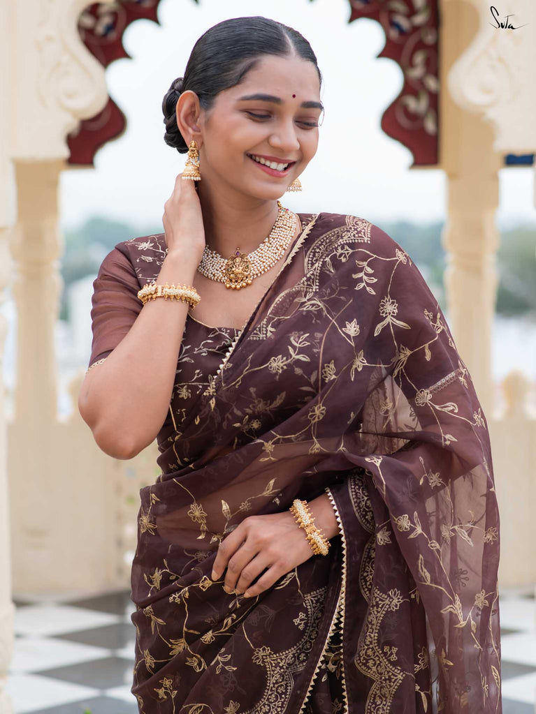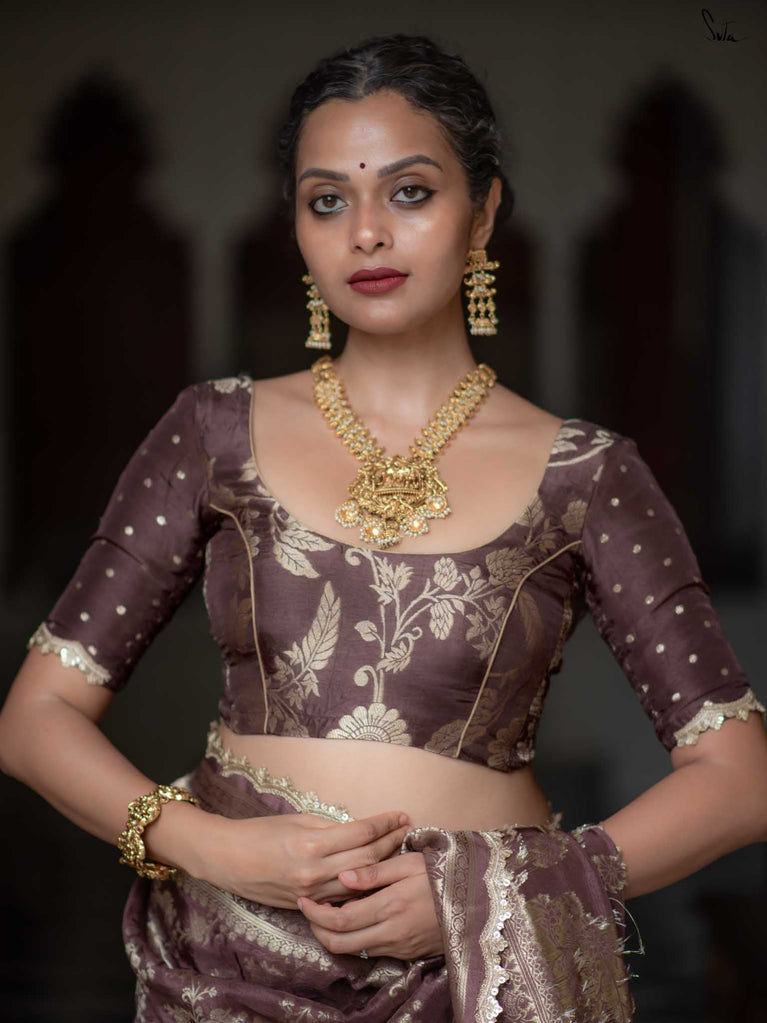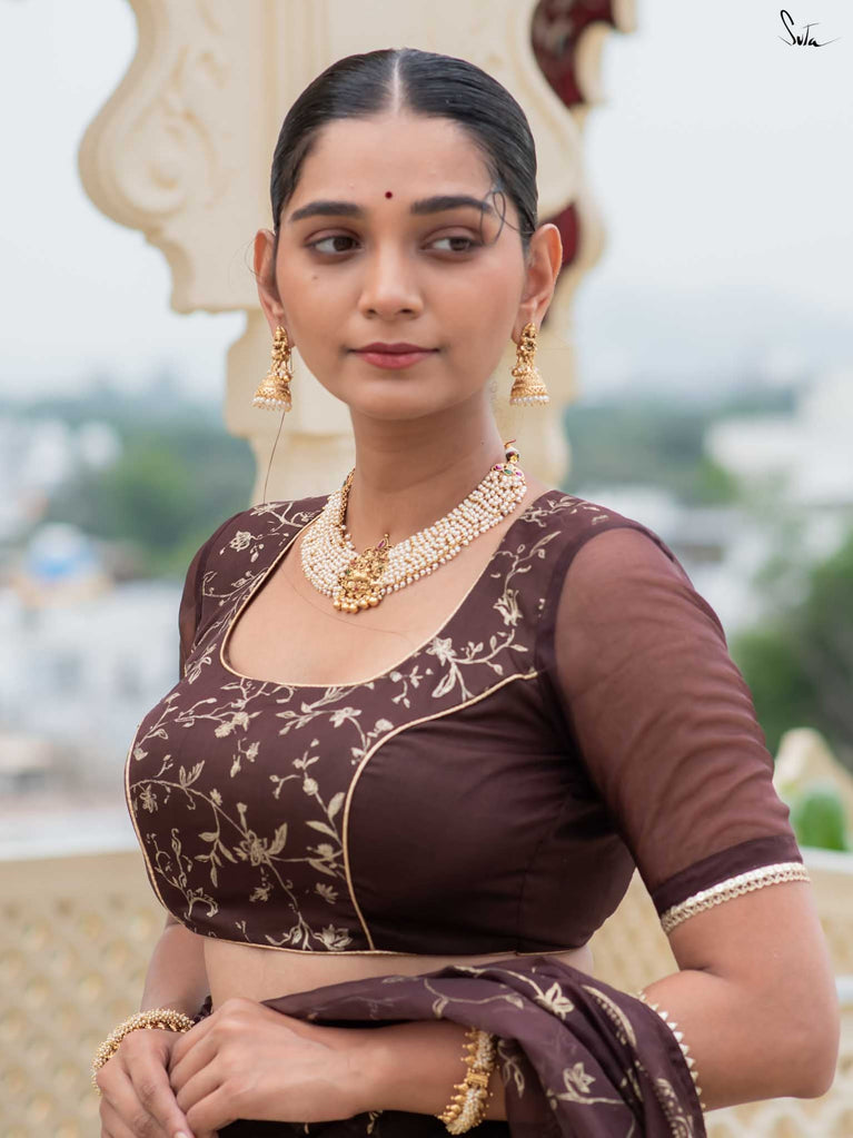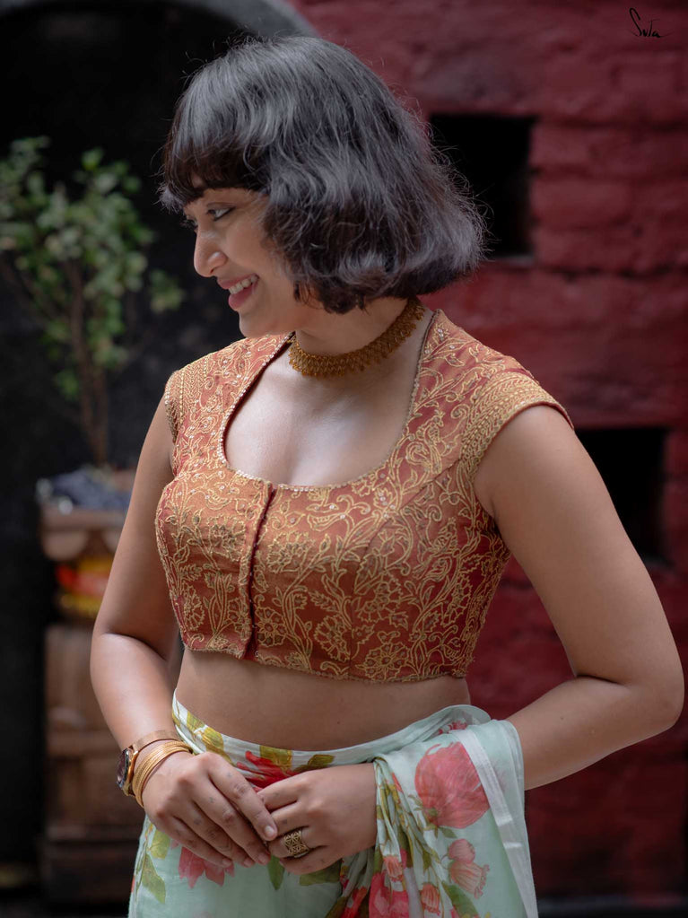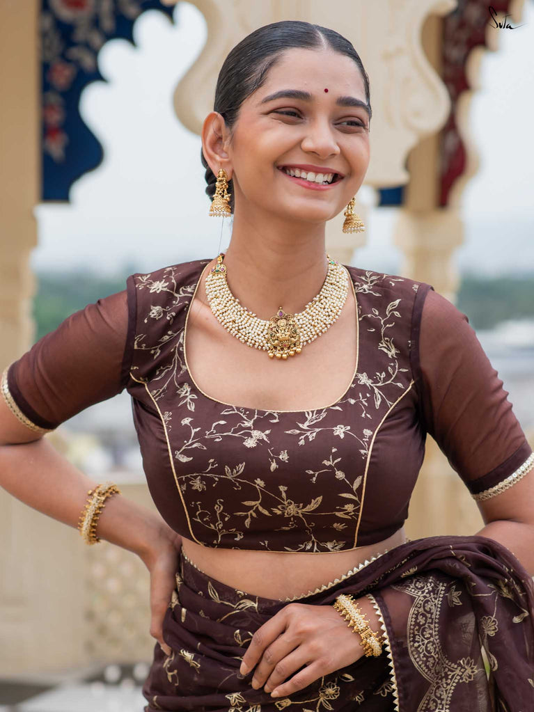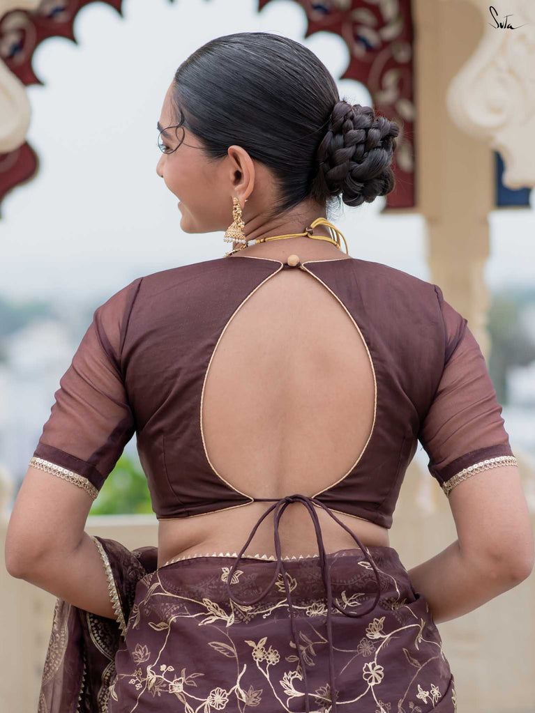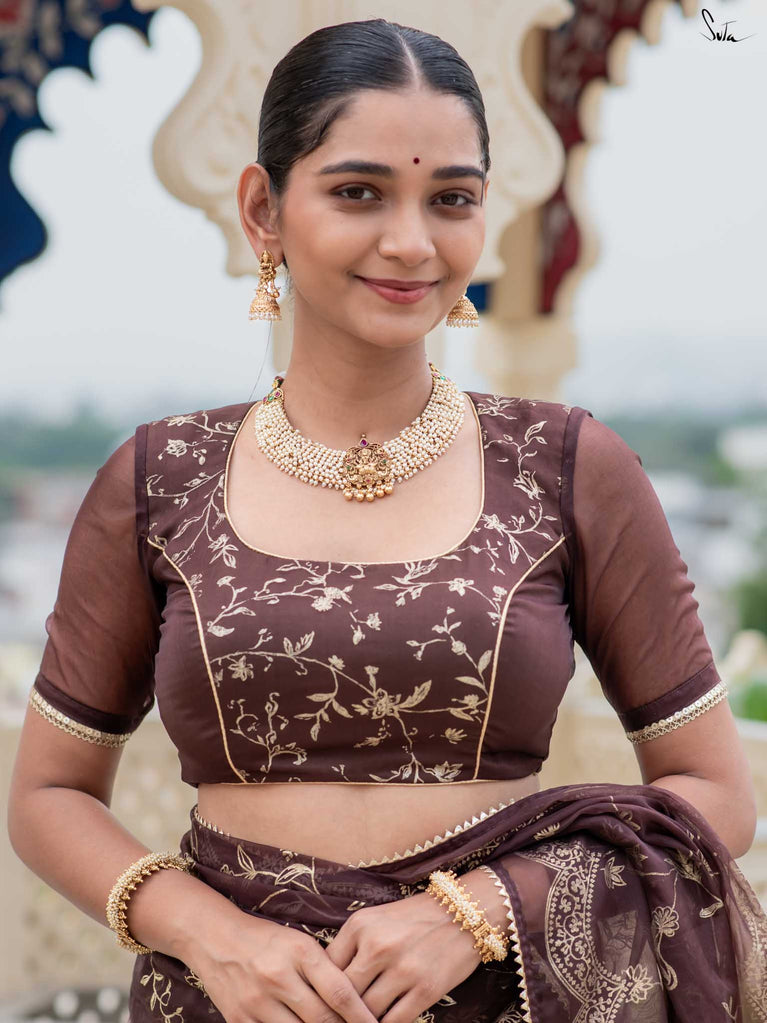 Elevate your festive and wedding look with Caramel Twist, an elegant half-sleeve blouse in rich brown foil organza. Adorned with delicate golden floral foil prints and intricate lace detailing, it exudes understated glamour with every twirl.