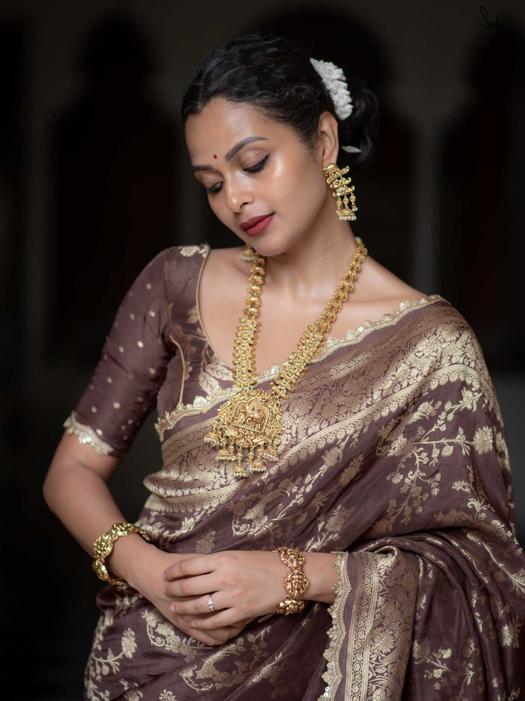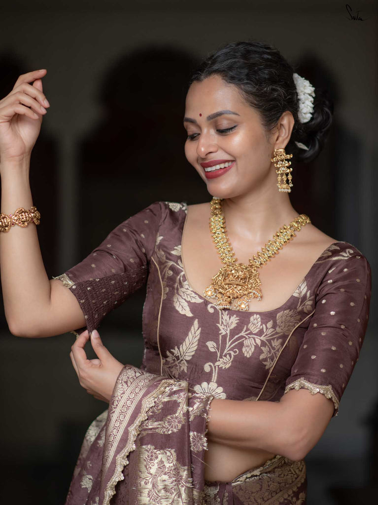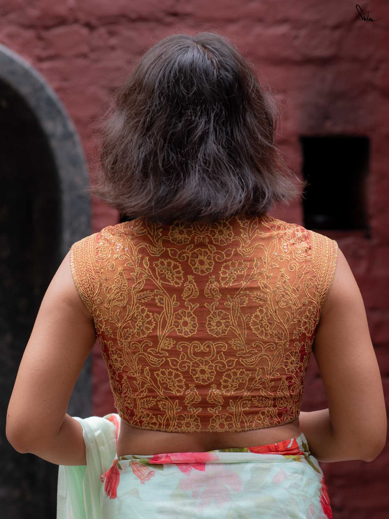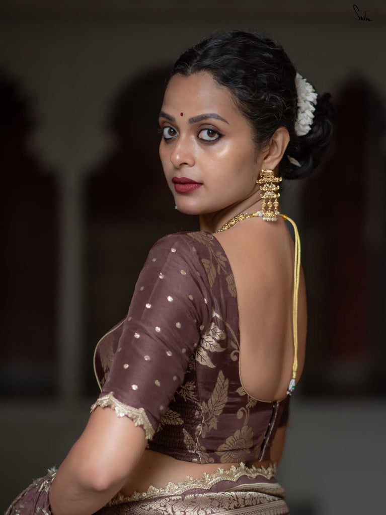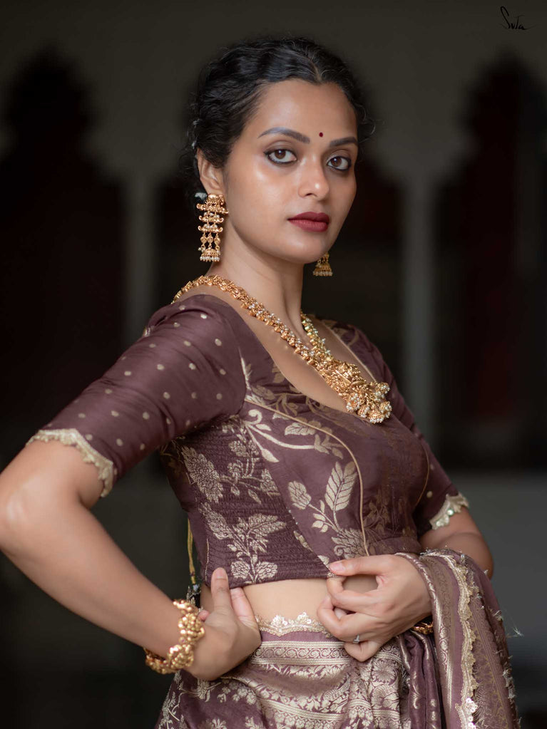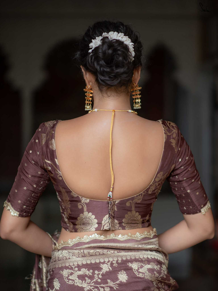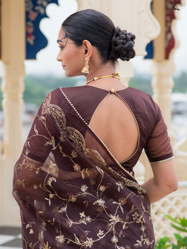 Elevate your festive and wedding look with Caramel Twist, an elegant half-sleeve blouse in rich brown foil organza. Adorned with delicate golden floral foil prints and intricate lace detailing, it exudes understated glamour with every twirl.
