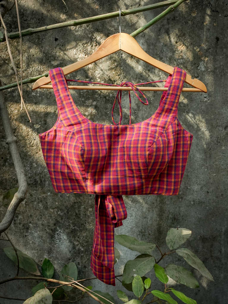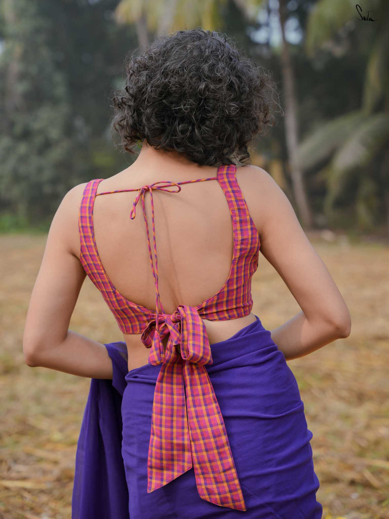 Playful yet polished, this multicolored checkered sleeveless blouse is a cheerful nod to the carefree spirit of Holi. With a chic back knot opening it fits like a glove, giving you comfort and confidence as you dance through the colors of the season. The cotton design ensures a perfect fit that provides comfort without compromising style.