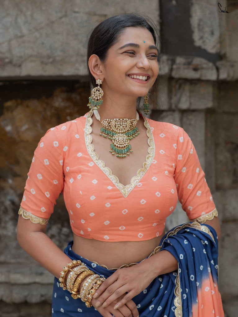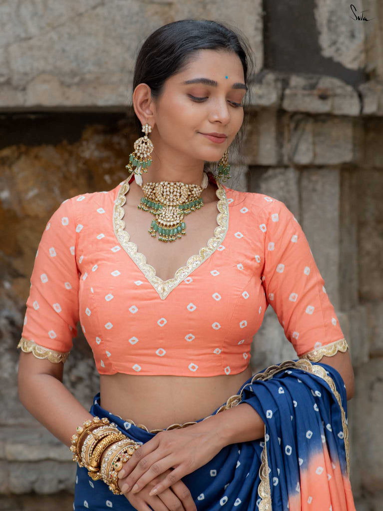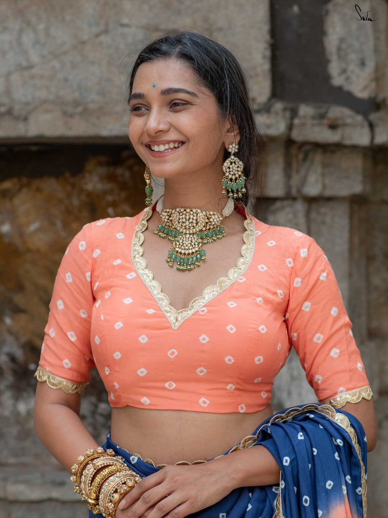 Blush is a sophisticated Orange blouse from the Rangrez collection, crafted to blend heritage artistry with modern elegance. Made in soft cotton muslin, it features traditional Bandhani tie-dye patterns and 1/4th sleeves with a classic collar neck. The gold lace detailing on the sleeves and neckline adds a subtle festive shimmer, making Blush a perfect companion for Rangrez sarees or as a standalone statement for celebrations.