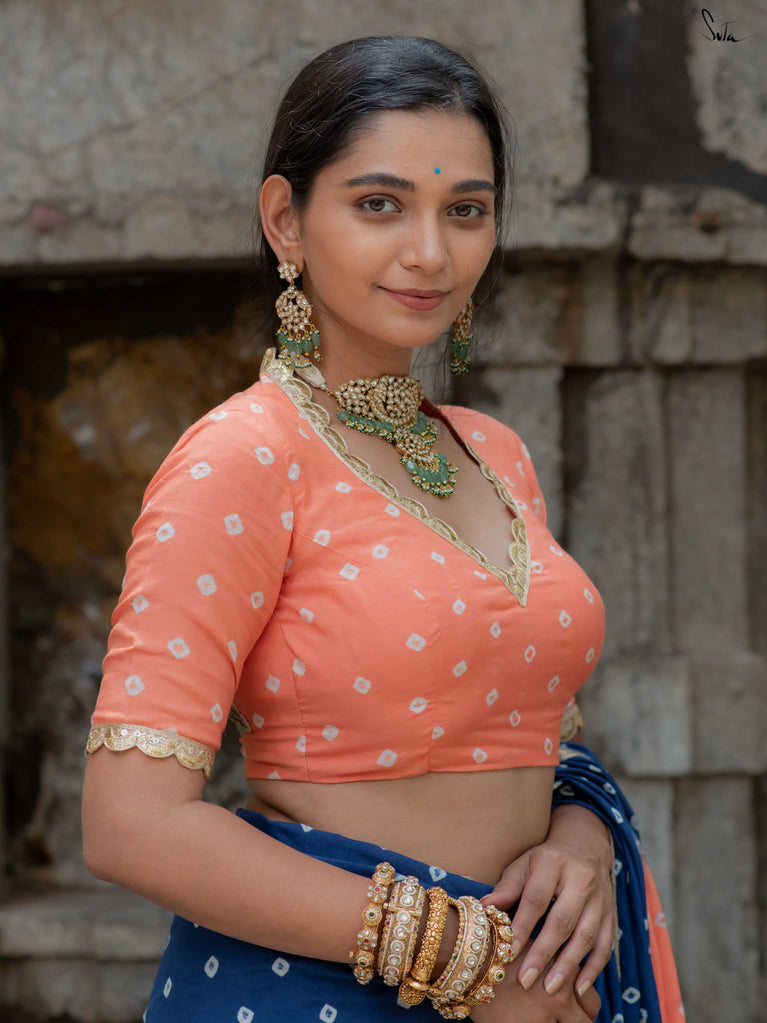 The model is wearing size S blouse and the saree is Ocean sa Bandhej