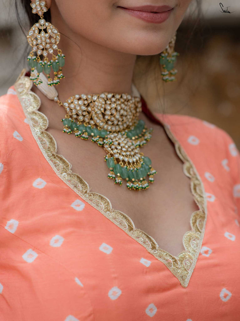 Bring a sparkling touch to your festive or wedding ensemble with Aam Panna Twist, a half-sleeve blouse in refreshing green foil organza. Featuring a sweetheart neckline and delicate golden floral foil prints with intricate lace detailing, it’s perfect for bridesmaids or festive celebrations.