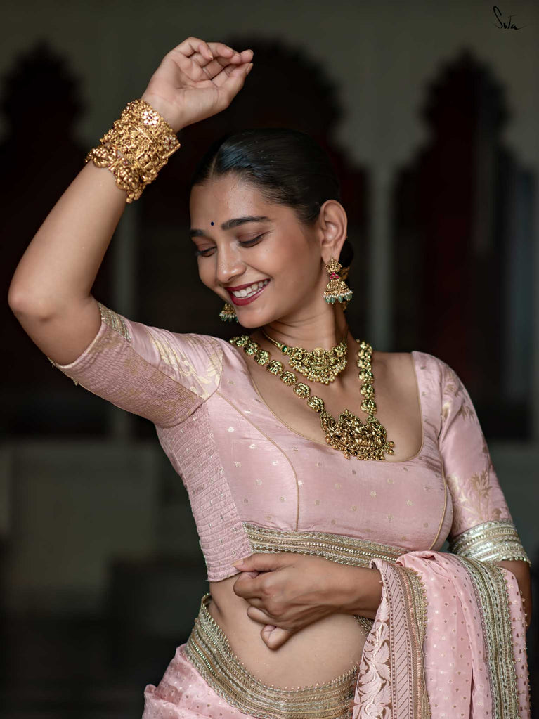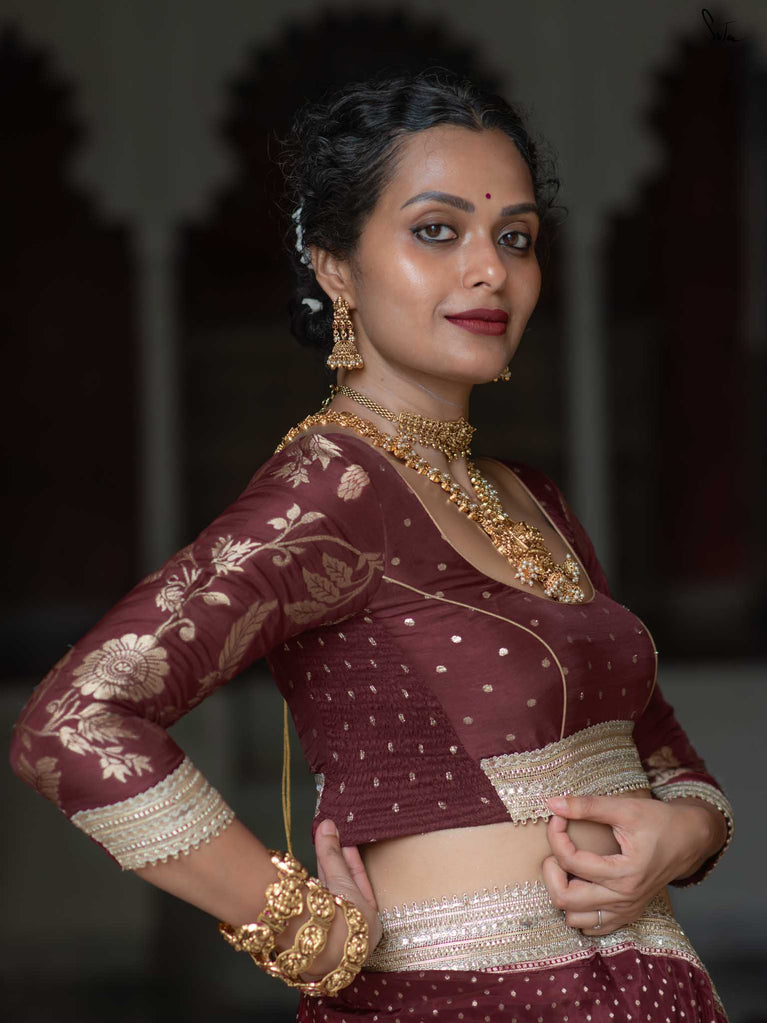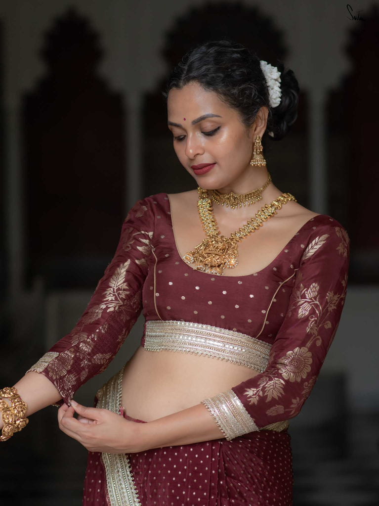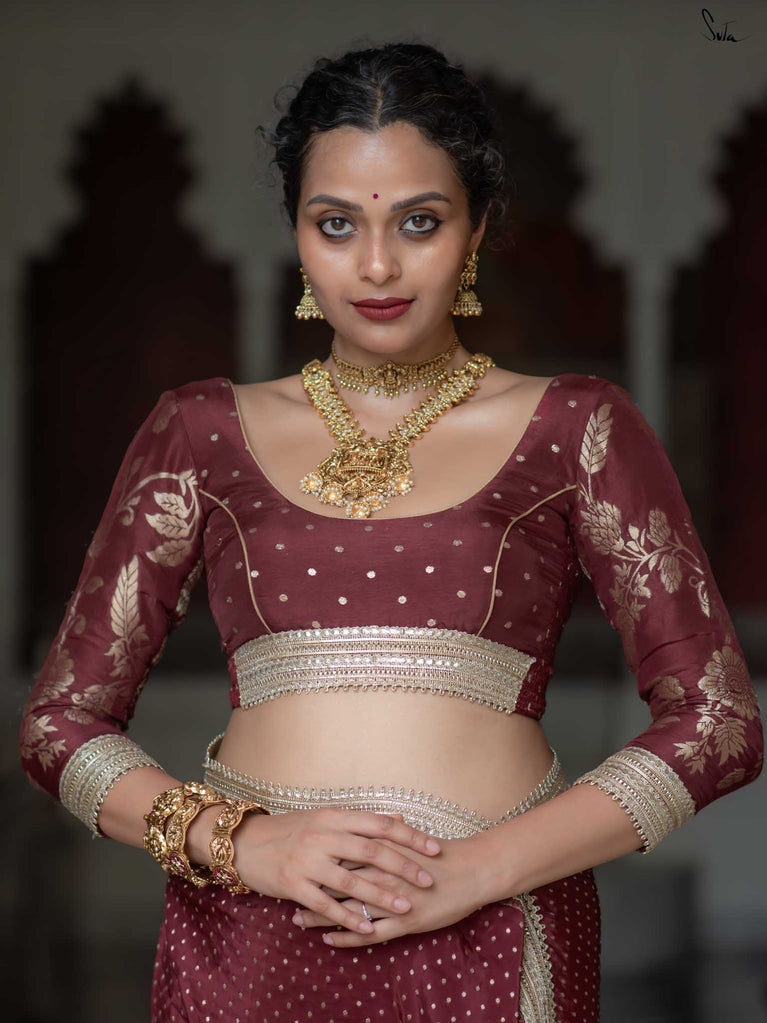 Rich in maroon and full of festive drama, Boondi Hai features a round neck, three-fourth sleeves, and embroidered lace on a woven polka and floral jaal base. The back round neck opening completes its classic look, making it a versatile choice for wedding sarees.