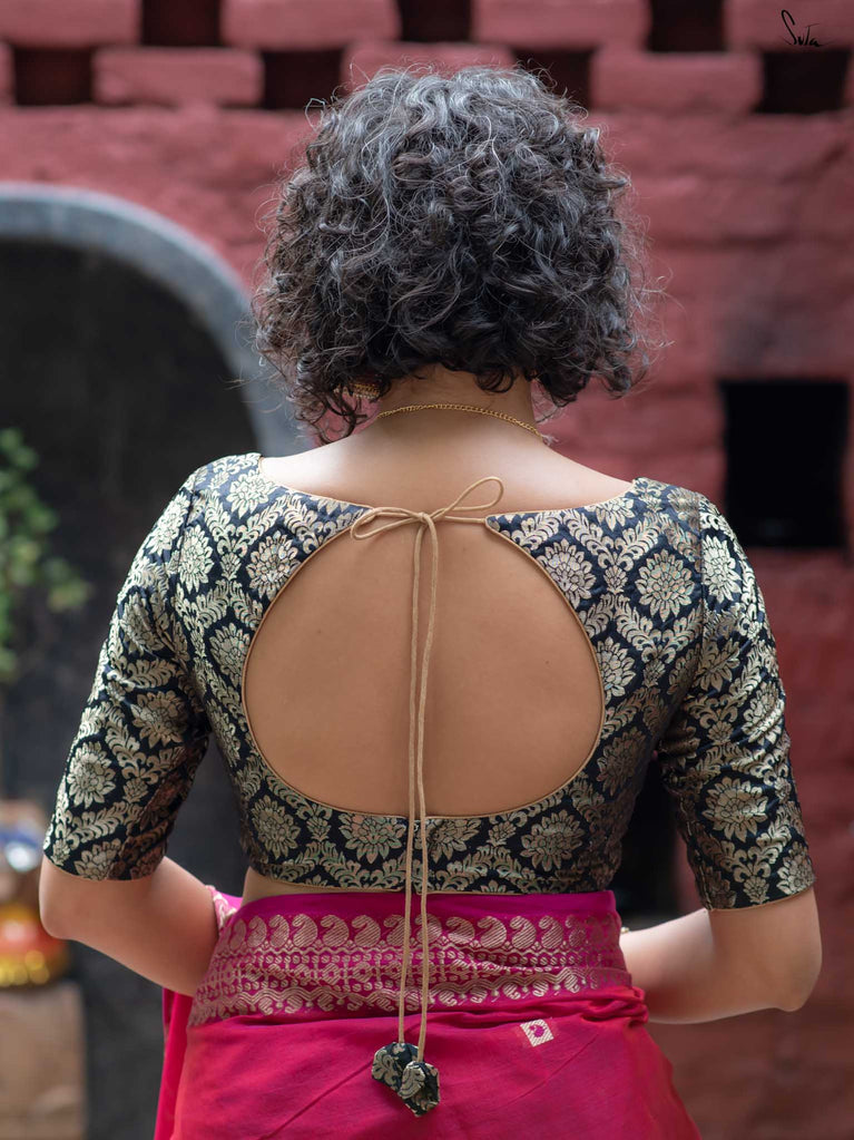 Designed with French seams and a back hook-and-knot closure, it combines comfort and elegance seamlessly. Ideal for pairing with matching sarees, this blouse adds effortless glamour to weddings, Diwali nights, or festive gatherings.