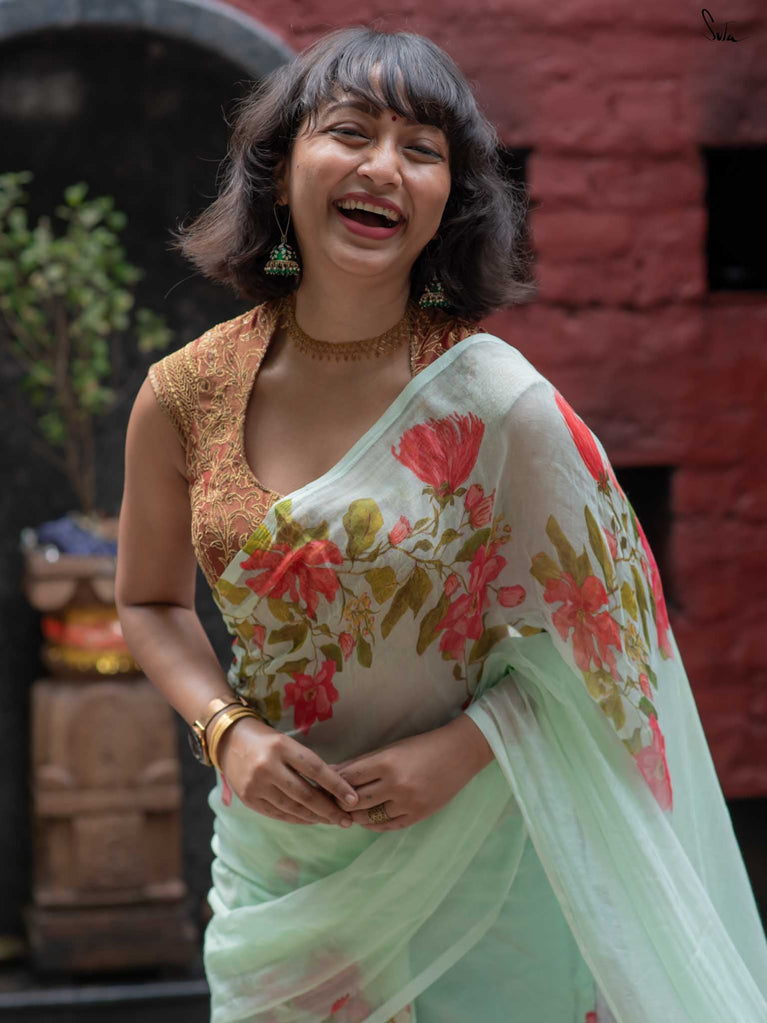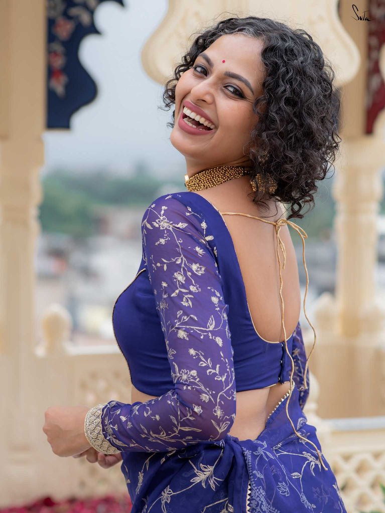 The model is wearing size S blouse and the saree is Shaadi Hai