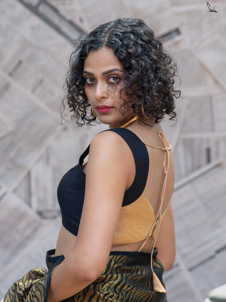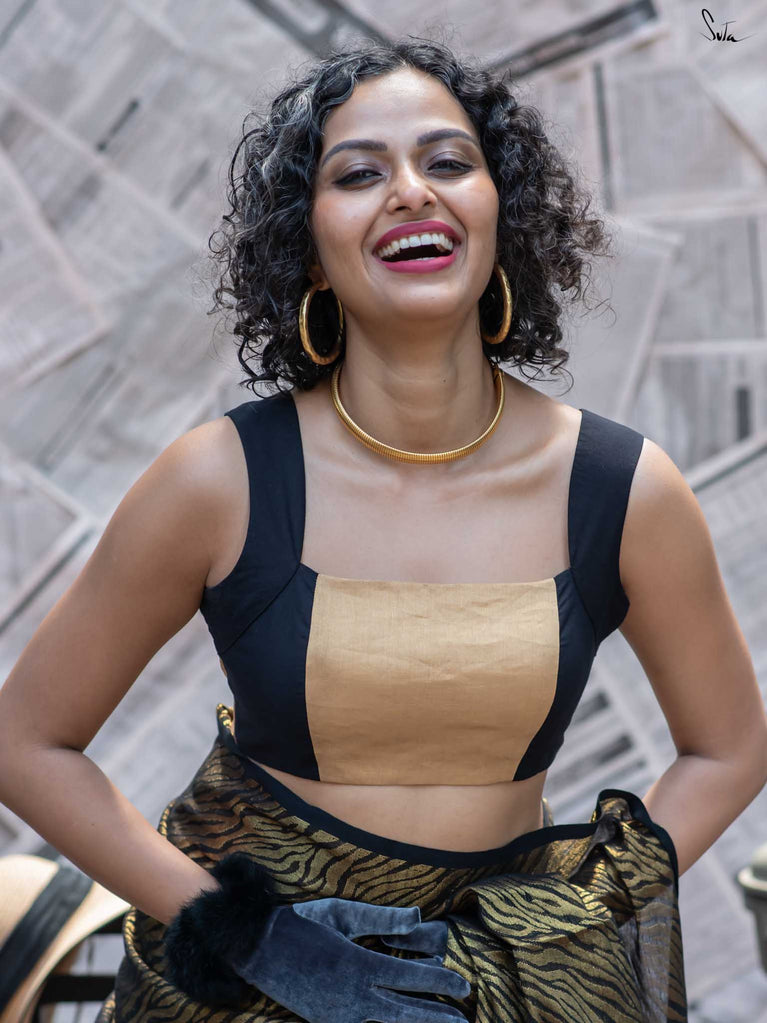 Gold meets black, bold and unforgettable. Sleeveless, padded blouse with an uber stylish square neckline. Back hook closure with tie-up adds the perfect finishing touch.