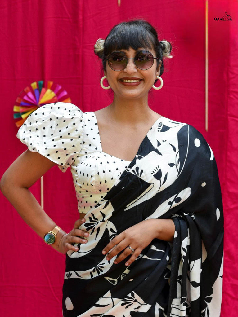 Su, the model is wearing size S blouse and the saree is Fireflies in the Garden Polka.