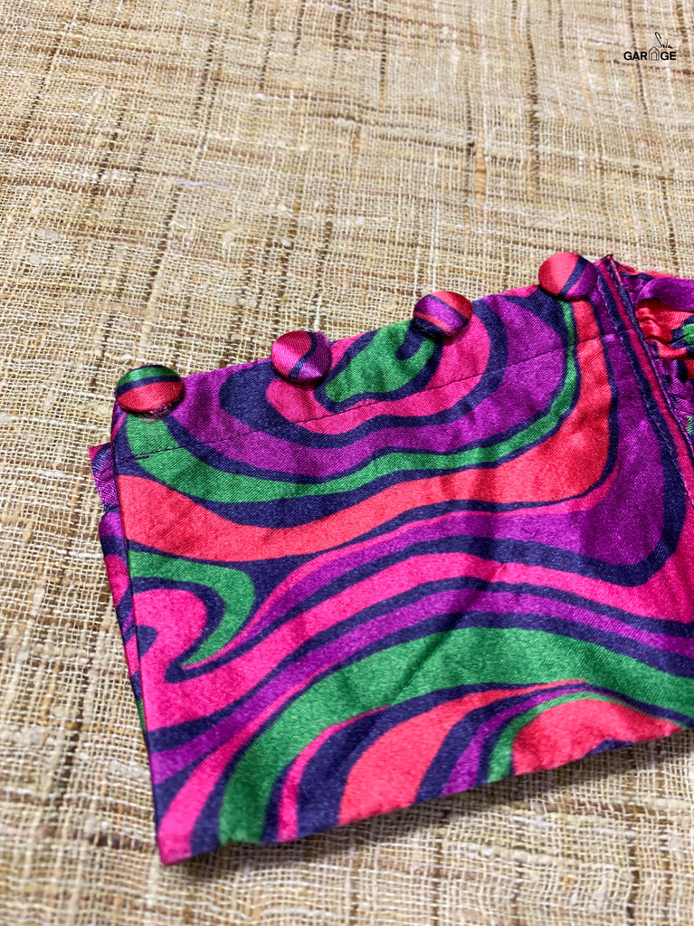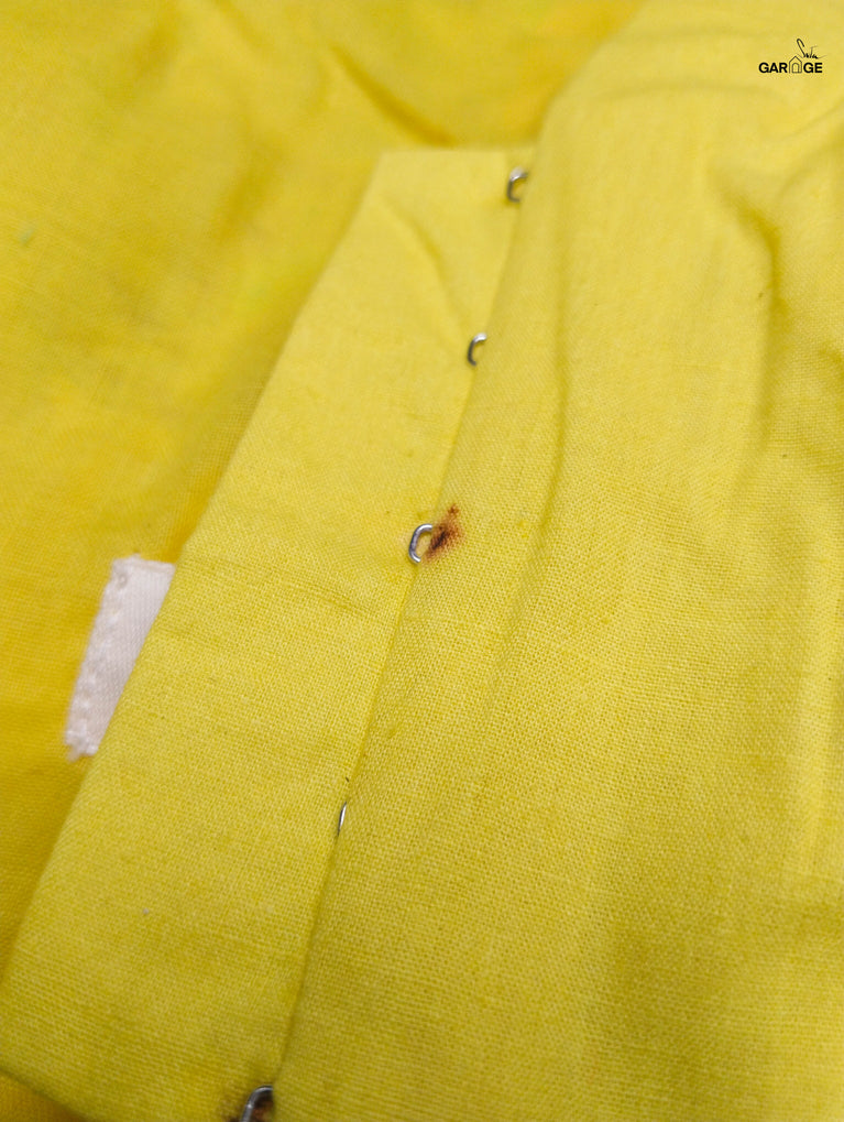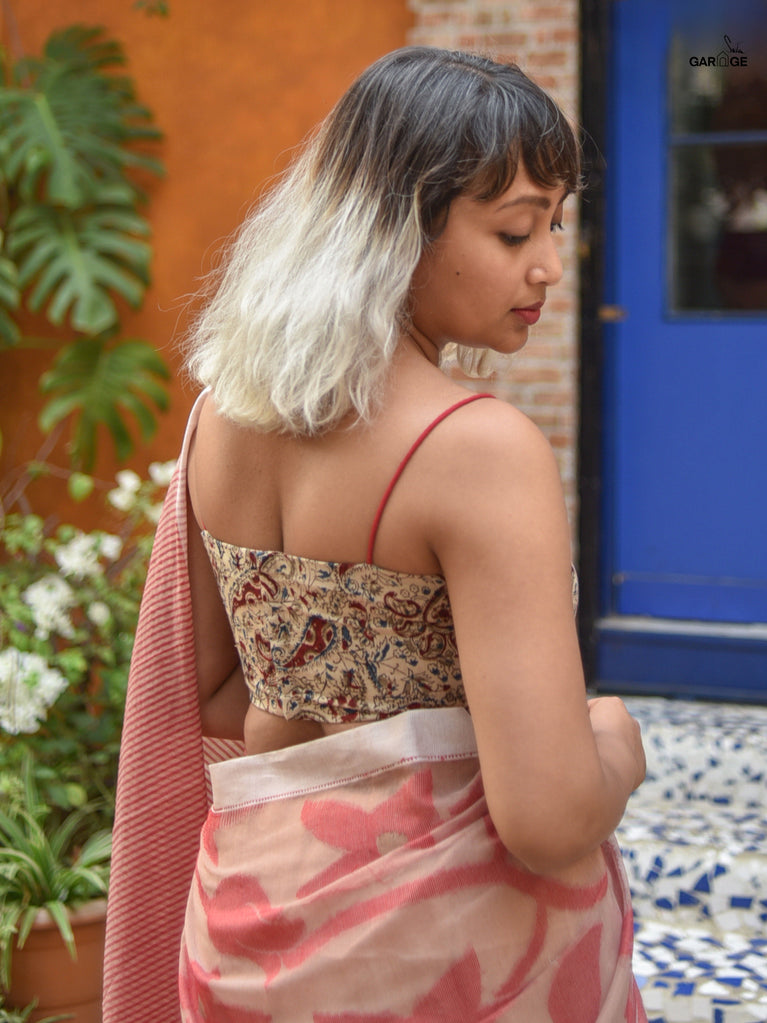 Cotton fabric dates back to some of the most ancient civilisations and it has a strong presence in the modern wardrobe as well. The incredible softness and lightness of cotton combined with its strength and versatility makes it one of the most popular choices, especially for the Indian climate. The comfort and the amazing feel that cotton offers in unparalleled! The fabric used for this blouse is a machine-embroidered cotton fabric which is also known as Hakoba cotton.The ruffle detailing on the blouse is made of organza fabric.Organza is a type of weave that creates light-weight, breathable, dreamy, translucent fabric that brings a certain ethereal charm to apparel. This weave also renders a characteristic stiffness, which beautifully comes together with the overall fluidity of the fabric. Organza can be made with different types of fibres. For this blouse, the organza weave is made of polyester.