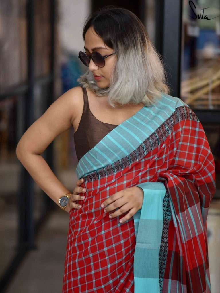 Su, the model is wearing a size S blouse and the sarees are Spiced Orange Pickles and Vivacious-O-Clock