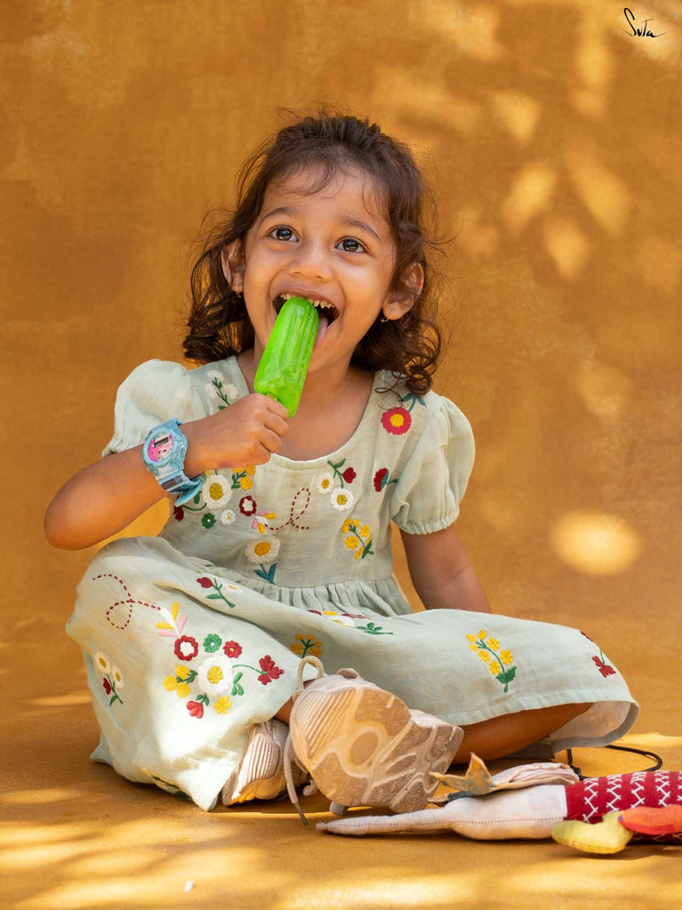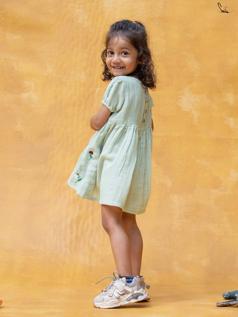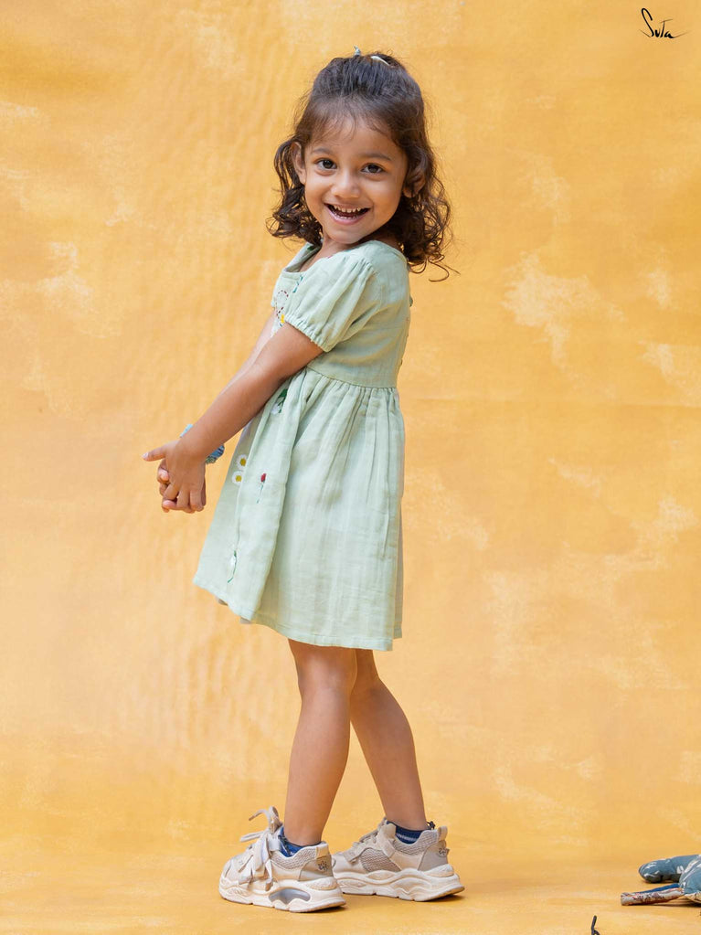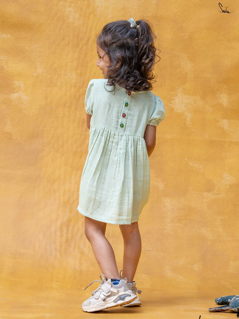 “It’s raining clouds, not cats and dogs!” Say hello to this little bunch of clouds stitched into a frosted mint daydream. This fully embroidered dress floats in with a sky full of whimsy, crafted from cloud-soft double-cloth cotton and sprinkled with magic from top to hem. Delicate buttons peek from the back like hidden stars, perfect for moonlit pirouettes and twinkly bedtime tales.