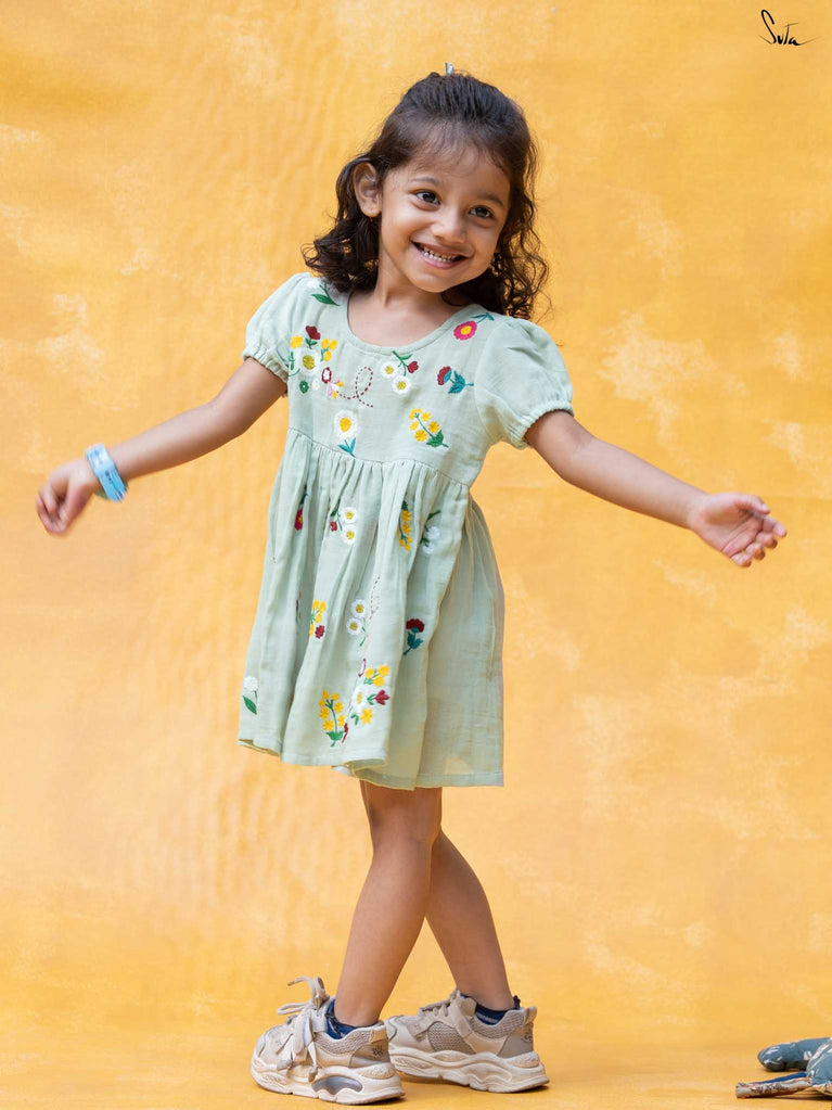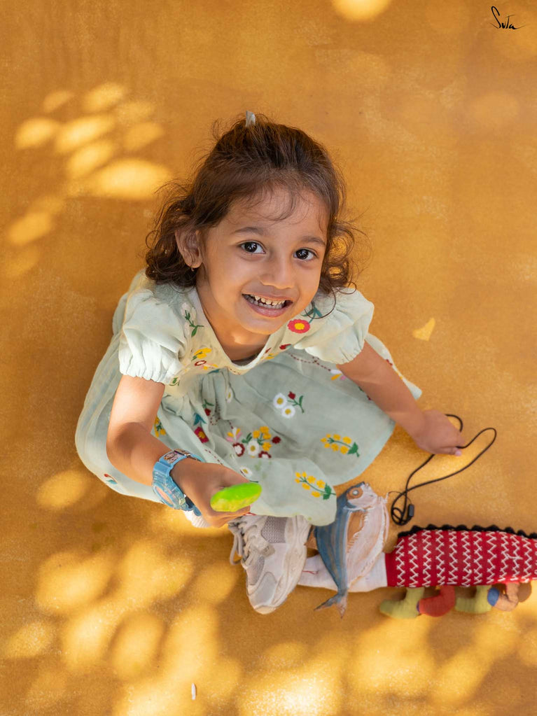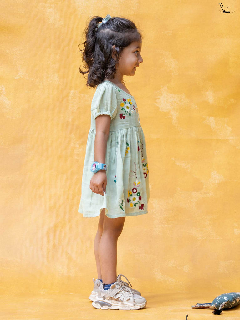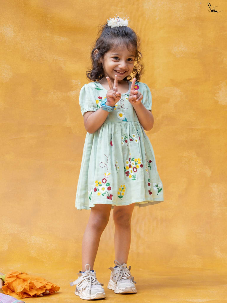 “It’s raining clouds, not cats and dogs!” Say hello to this little bunch of clouds stitched into a frosted mint daydream. This fully embroidered dress floats in with a sky full of whimsy, crafted from cloud-soft double-cloth cotton and sprinkled with magic from top to hem. Delicate buttons peek from the back like hidden stars, perfect for moonlit pirouettes and twinkly bedtime tales.