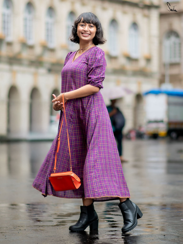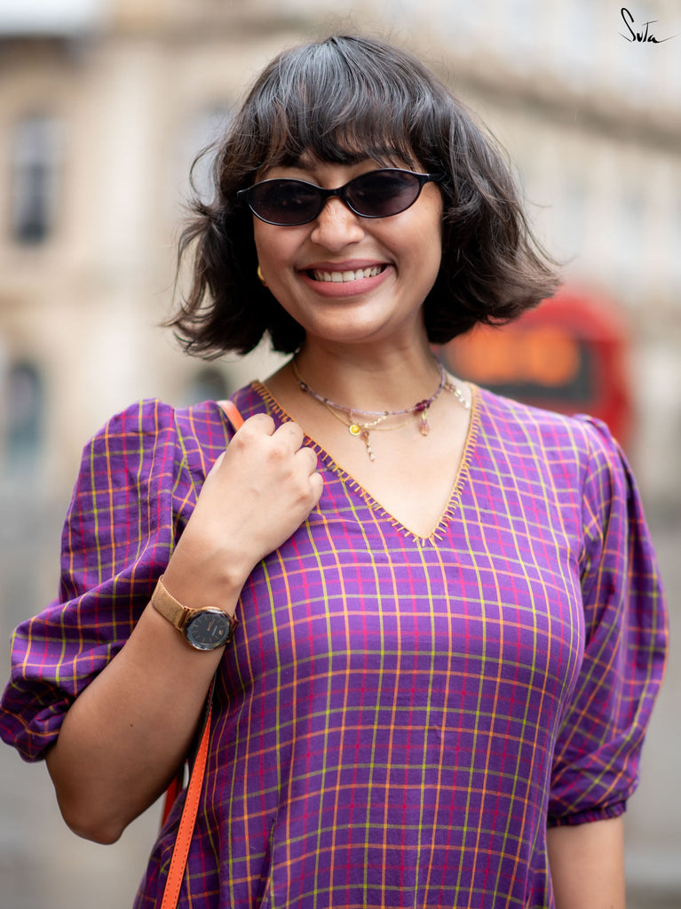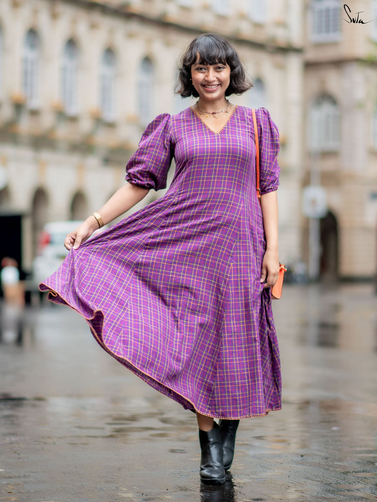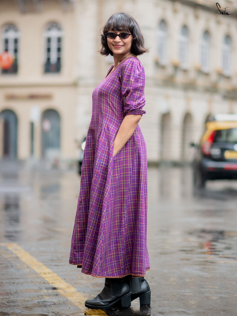 Checks with a twist! This purple cotton midi dress redefines a classic in V-neckline with contrasting mustard blanket stitches, a design detail that subtly draws attention. The breathable cotton keeps it summer-ready, while the puff sleeves and easy flare make it an all-day comfort pick. It’s your go-to for market strolls, casual catch ups, or just feeling cute on a weekday.
