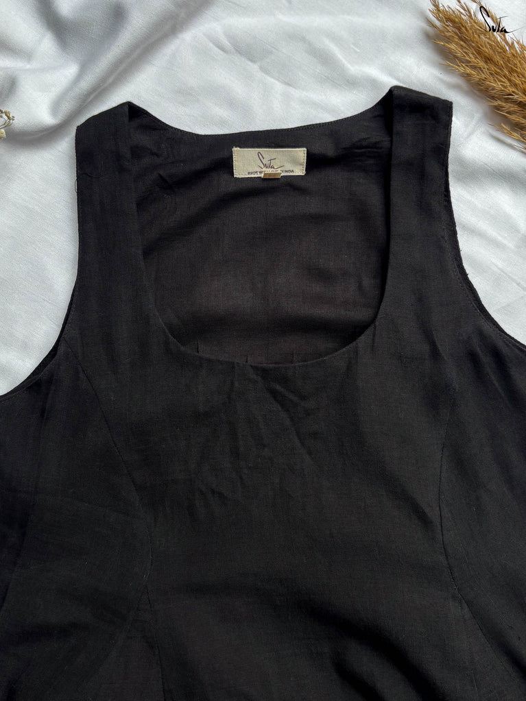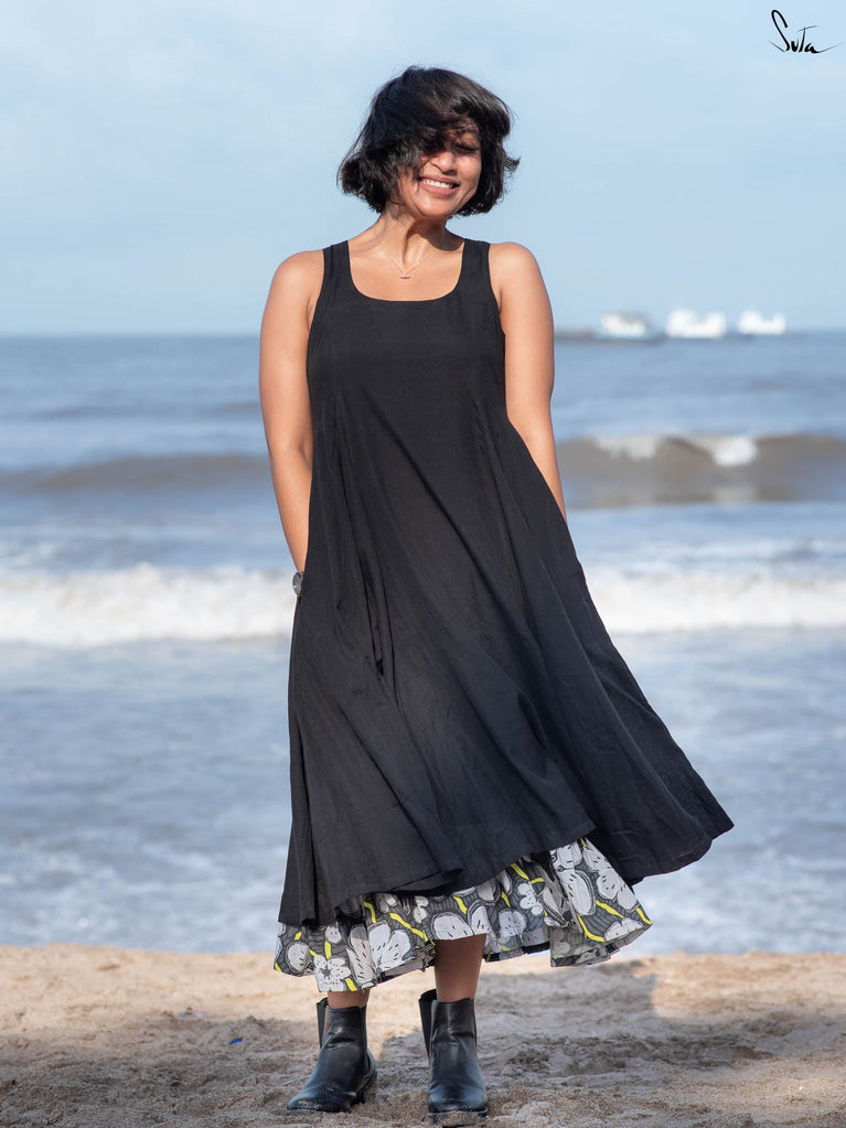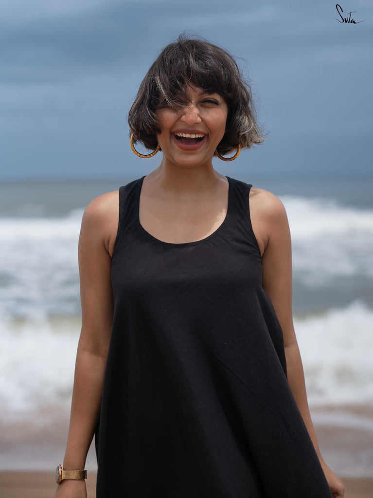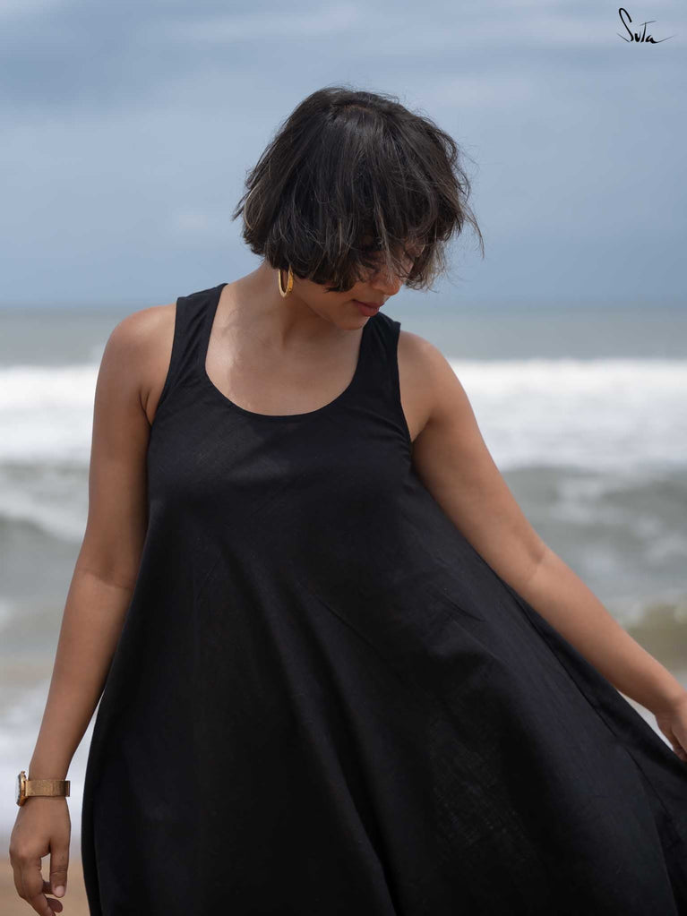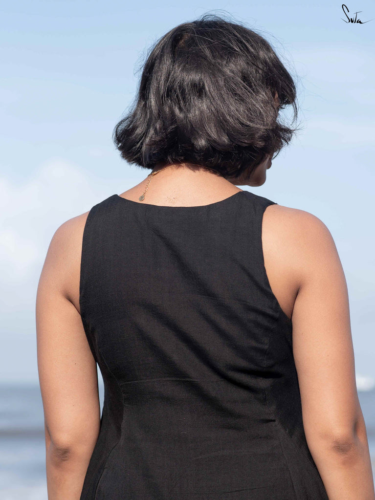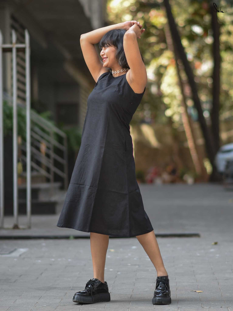 Own the spotlight with a dash of drama, draped in the stylish "Ebony Escape". The black sleeveless cotton dress consists of a chic U-neckline and back button opening, inviting freedom of movement. Its sleek silhouette and sophisticated details evoke a sense of calm, making it a perfect choice for events that demands effortless elegance!
