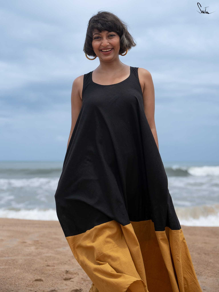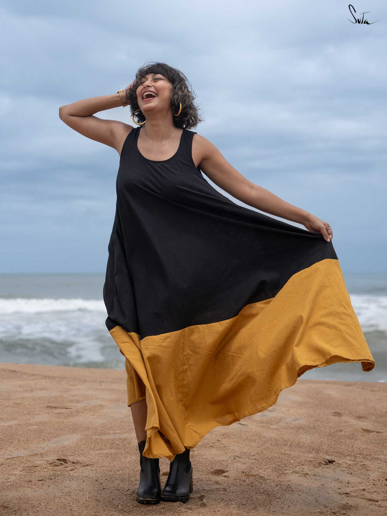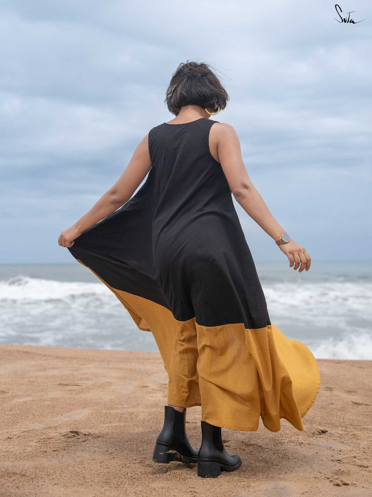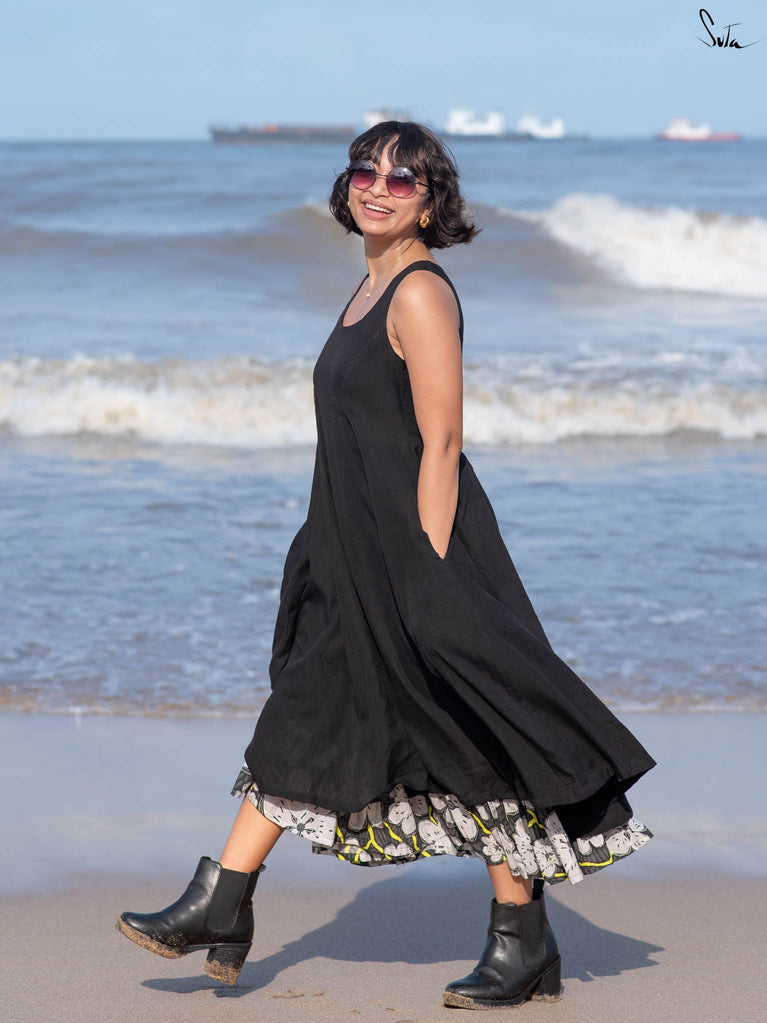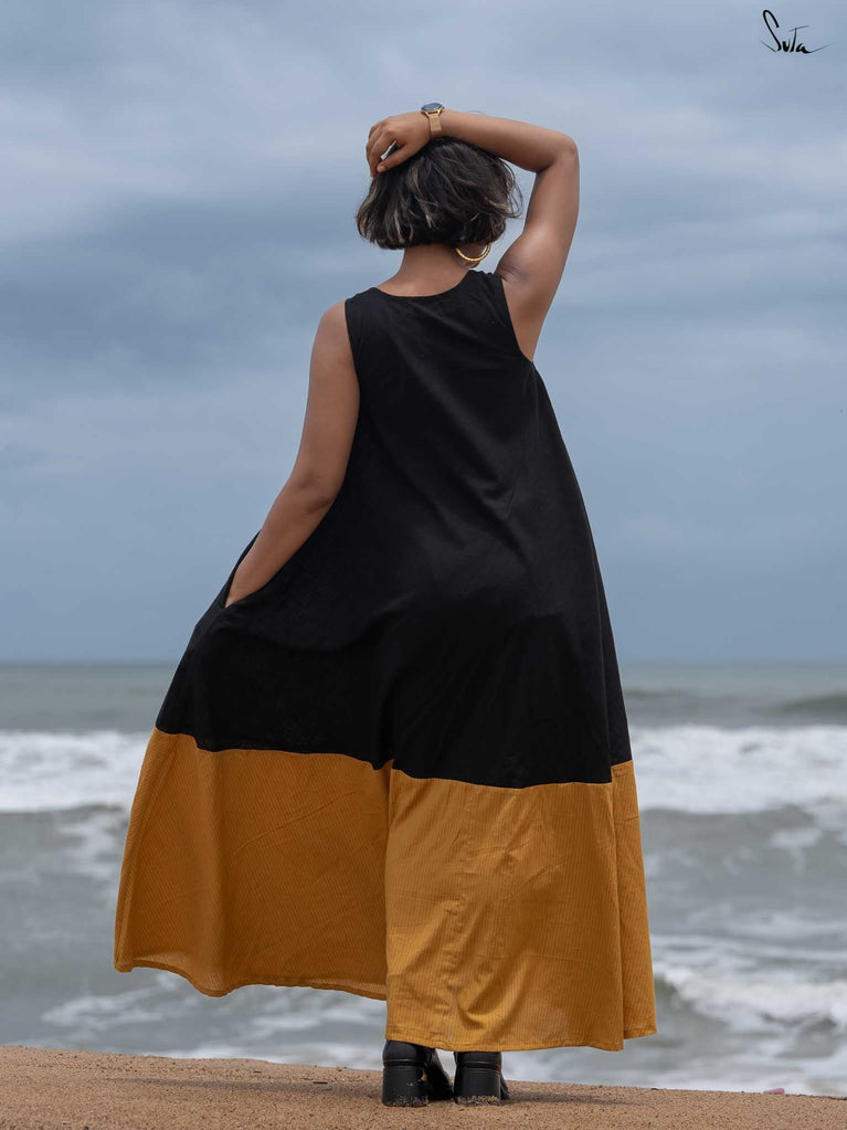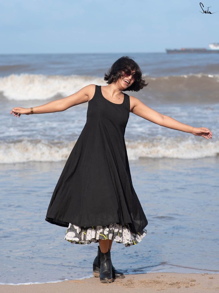 Own the spotlight with a dash of drama, draped in the stylish "Ebony Escape". The black sleeveless cotton dress consists of a chic U-neckline and back button opening, inviting freedom of movement. Its sleek silhouette and sophisticated details evoke a sense of calm, making it a perfect choice for events that demands effortless elegance!