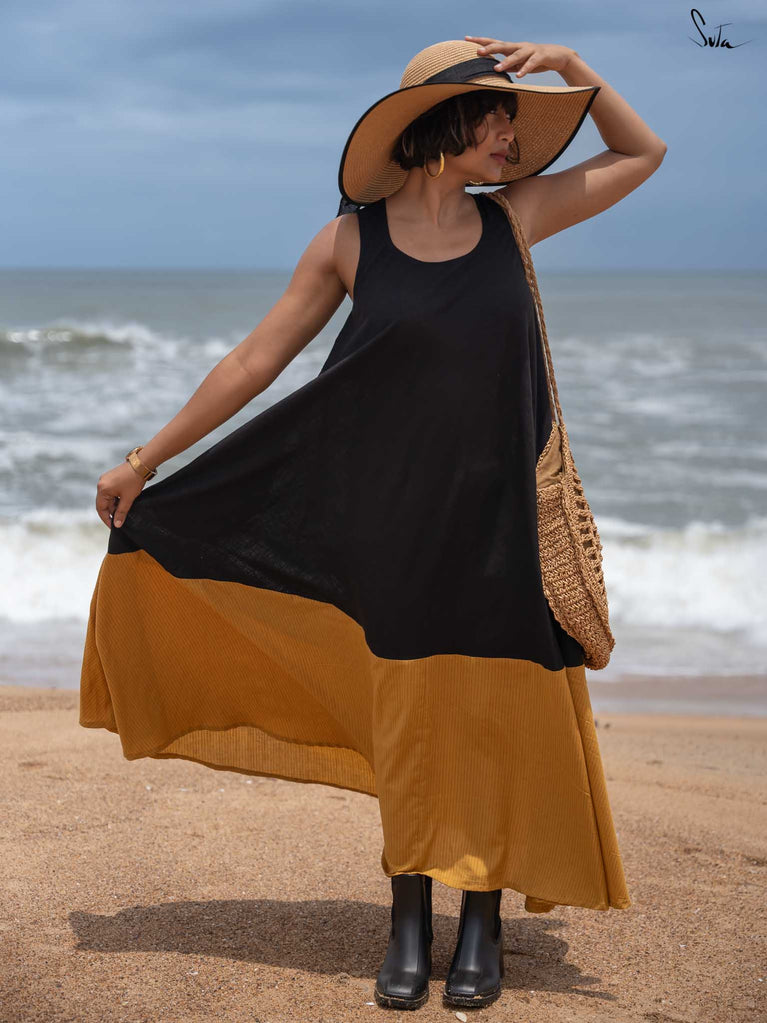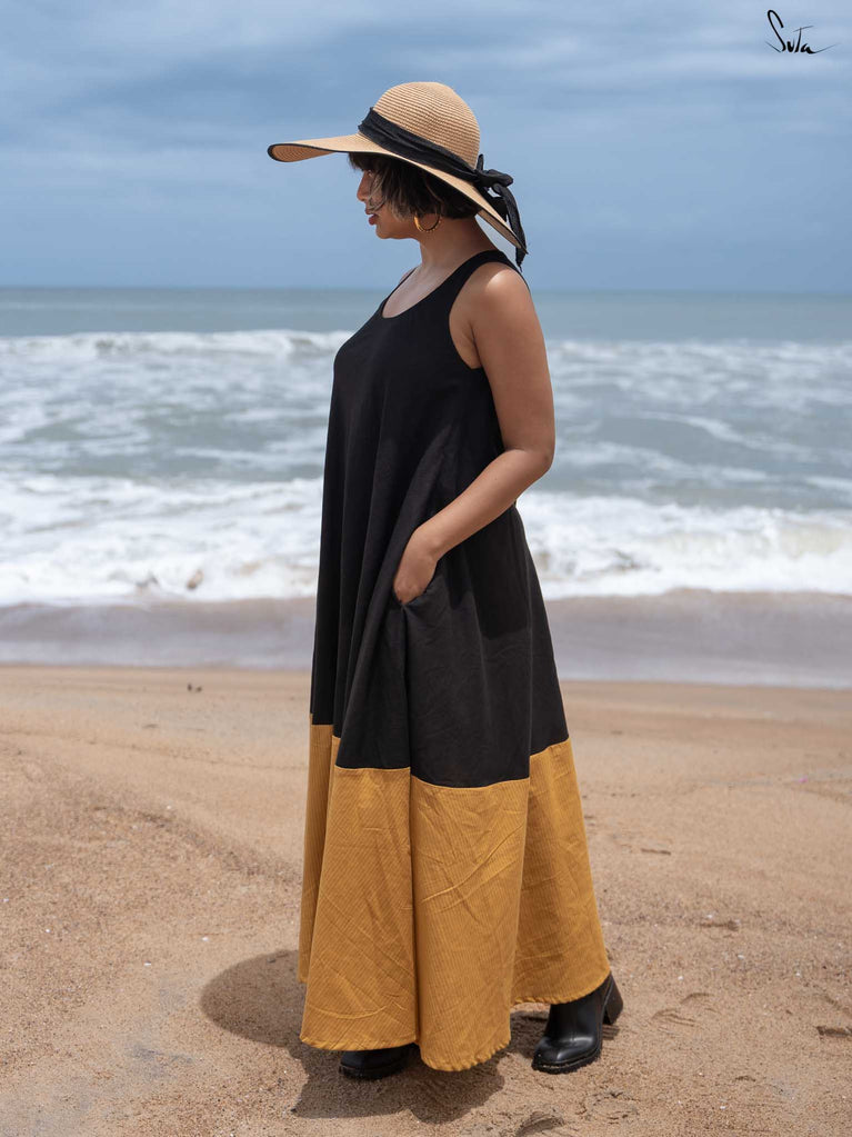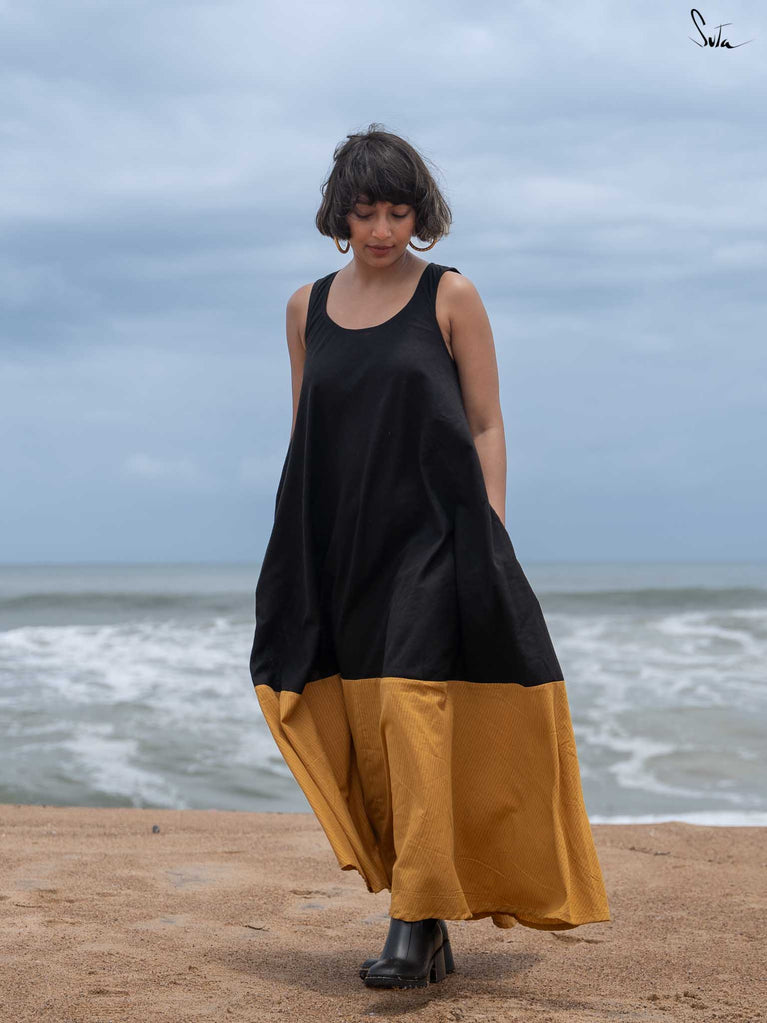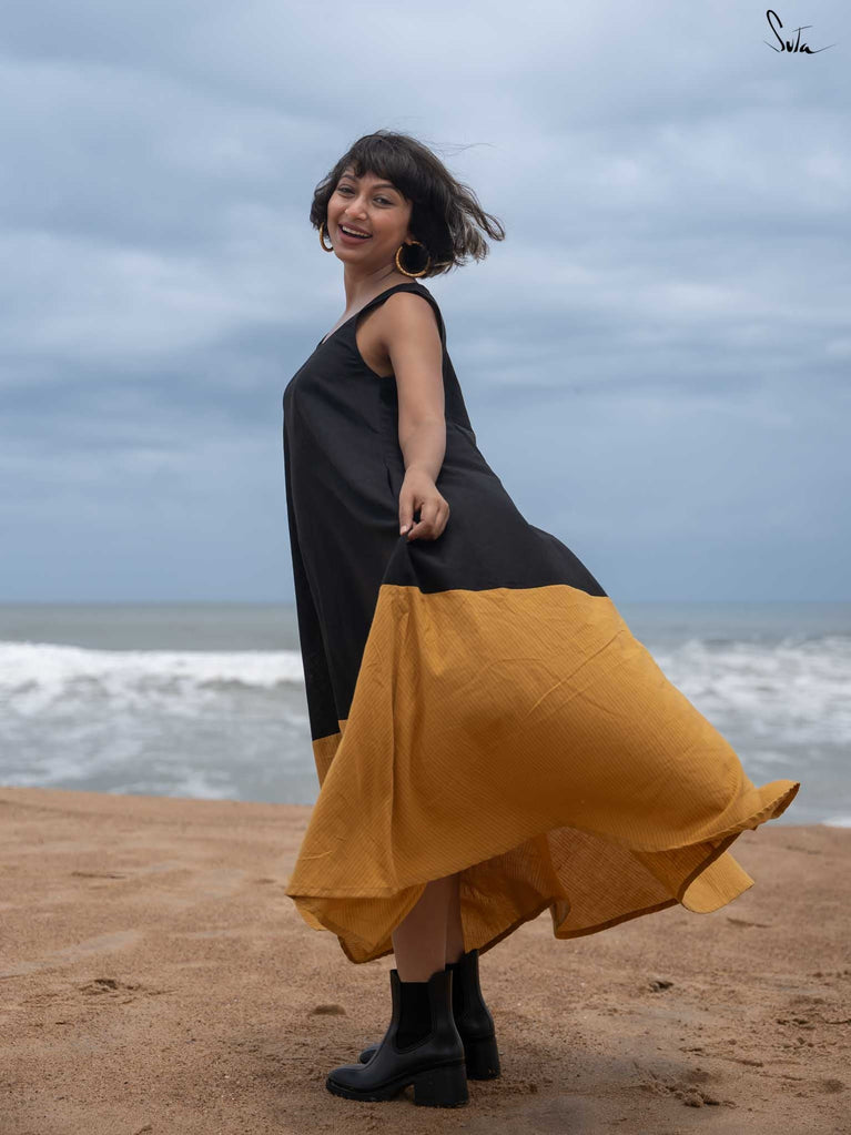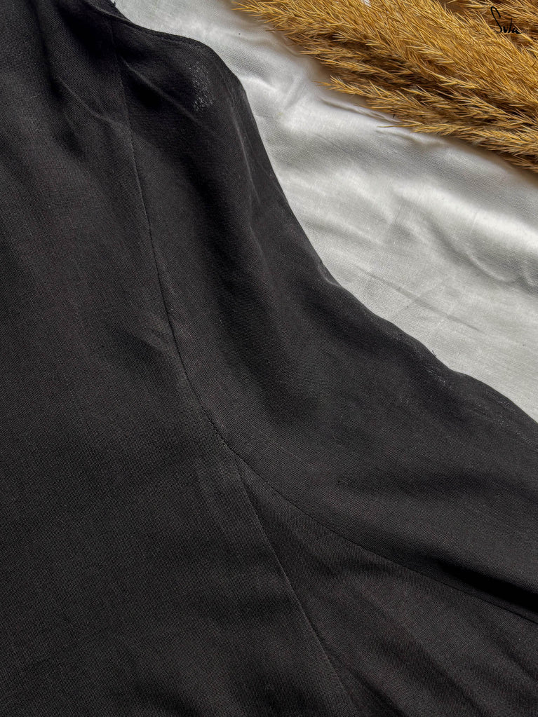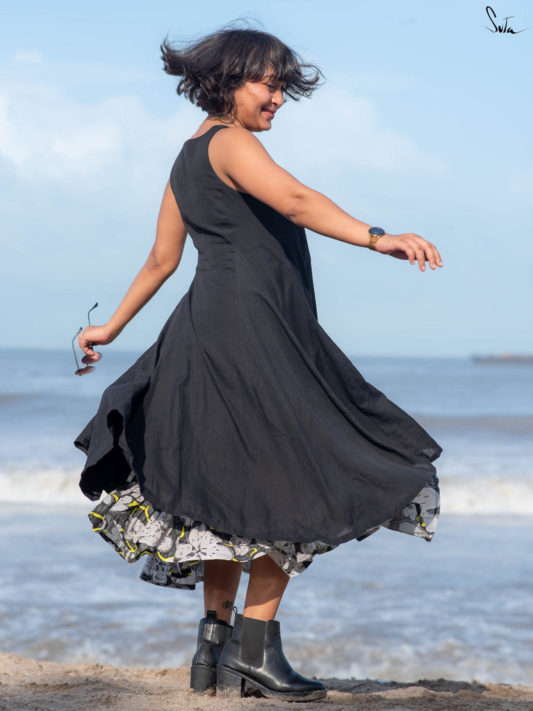 Own the spotlight with a dash of drama, draped in the stylish "Ebony Escape". The black sleeveless cotton dress consists of a chic U-neckline and back button opening, inviting freedom of movement. Its sleek silhouette and sophisticated details evoke a sense of calm, making it a perfect choice for events that demands effortless elegance!