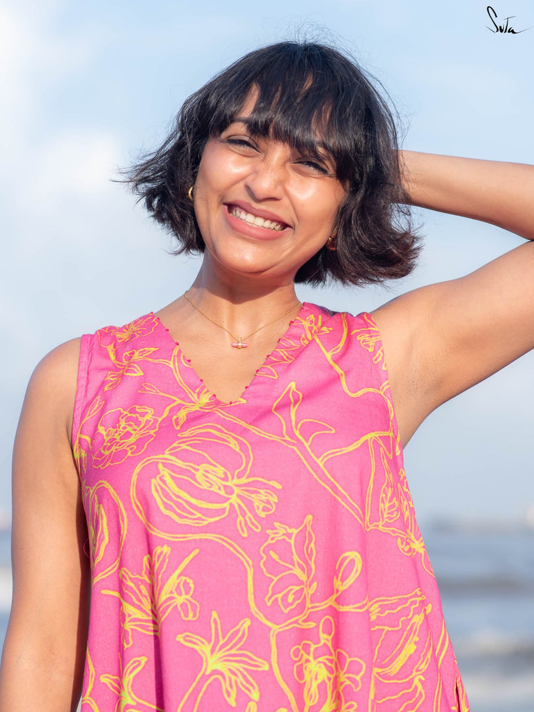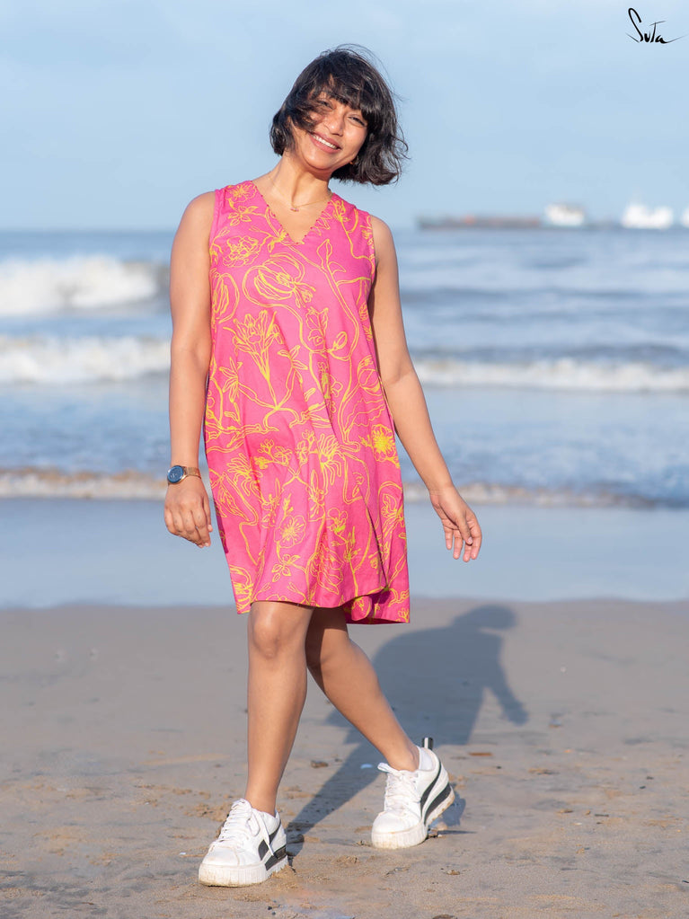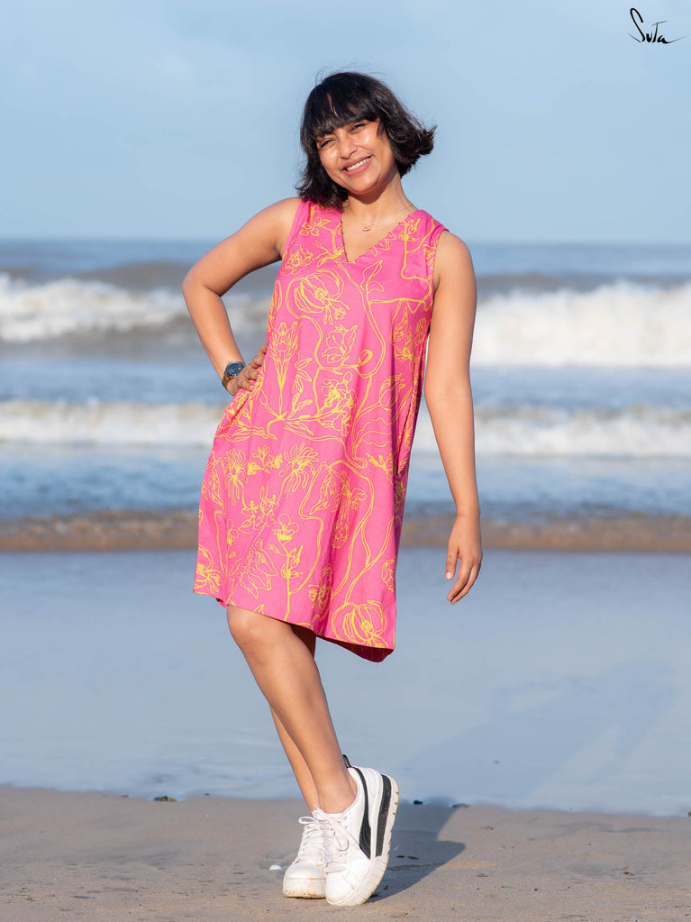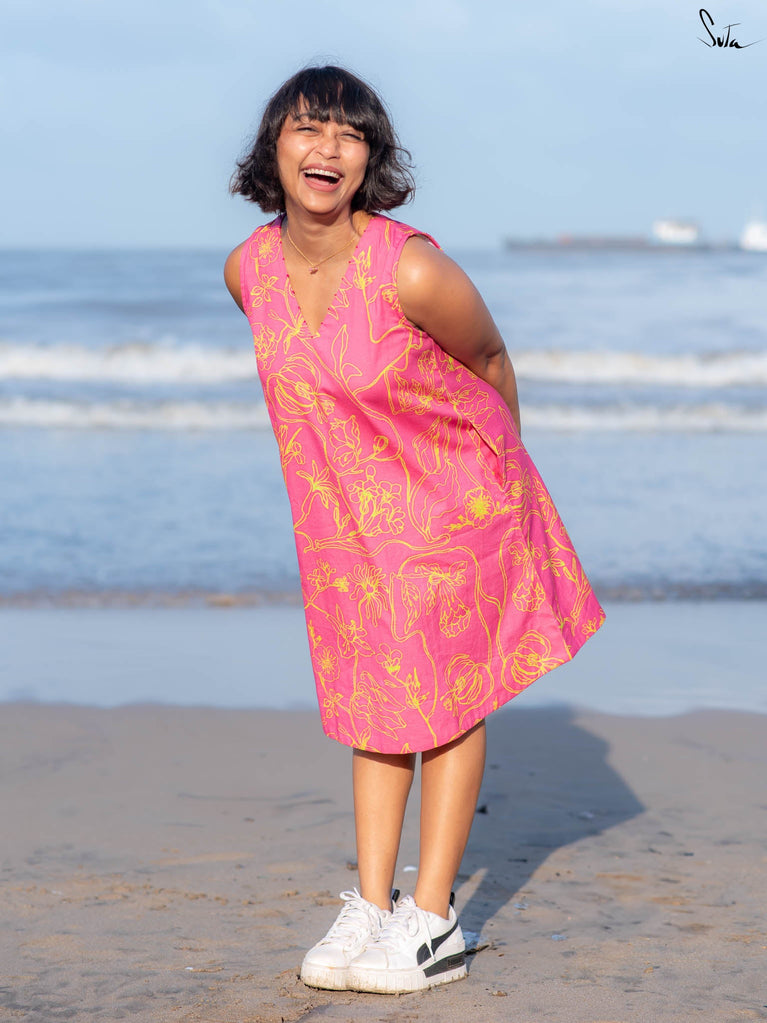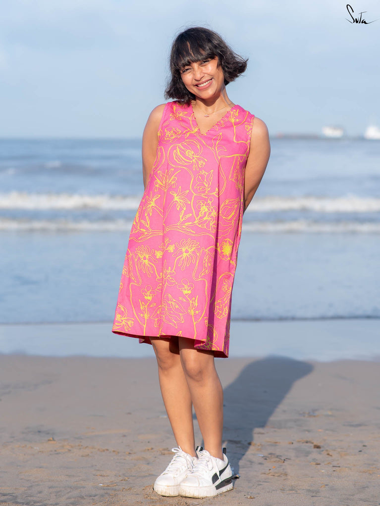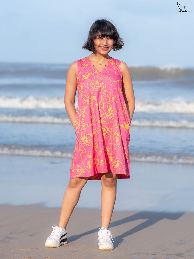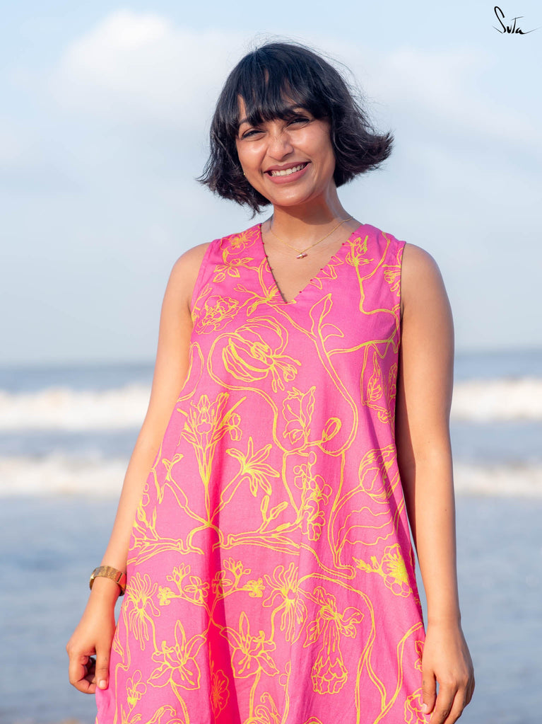 This digitally printed cotton dress is vibrant but wearable, think tropical florals with a sunlit edge. Cut in a sleeveless, V-neck silhouette with French knots stitched along the neckline, it pairs bold prints with subtle detail.