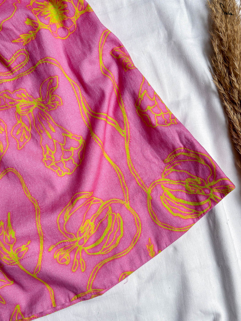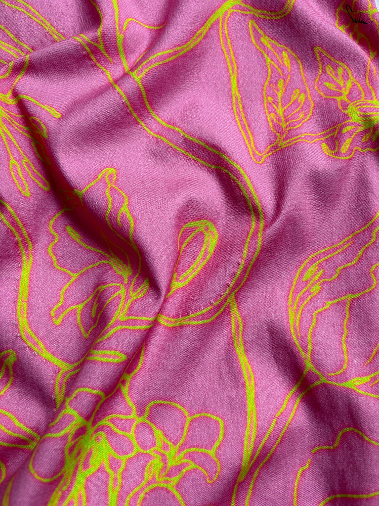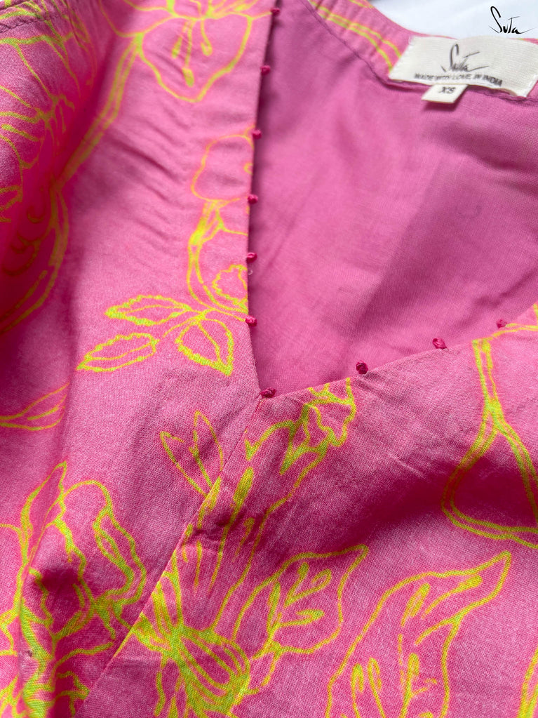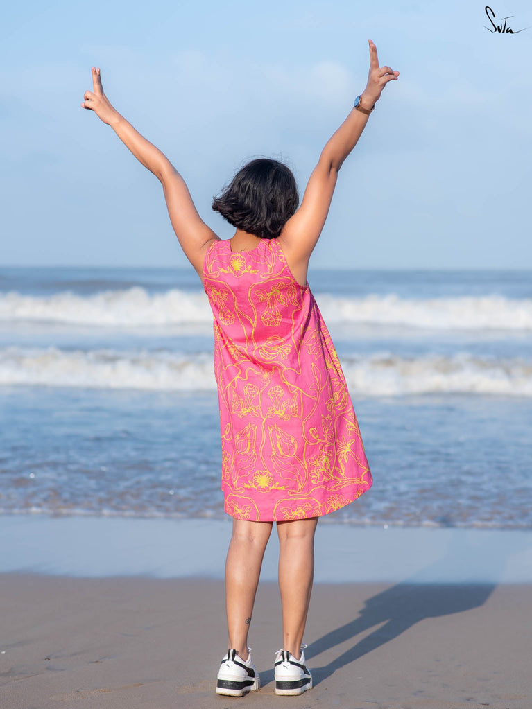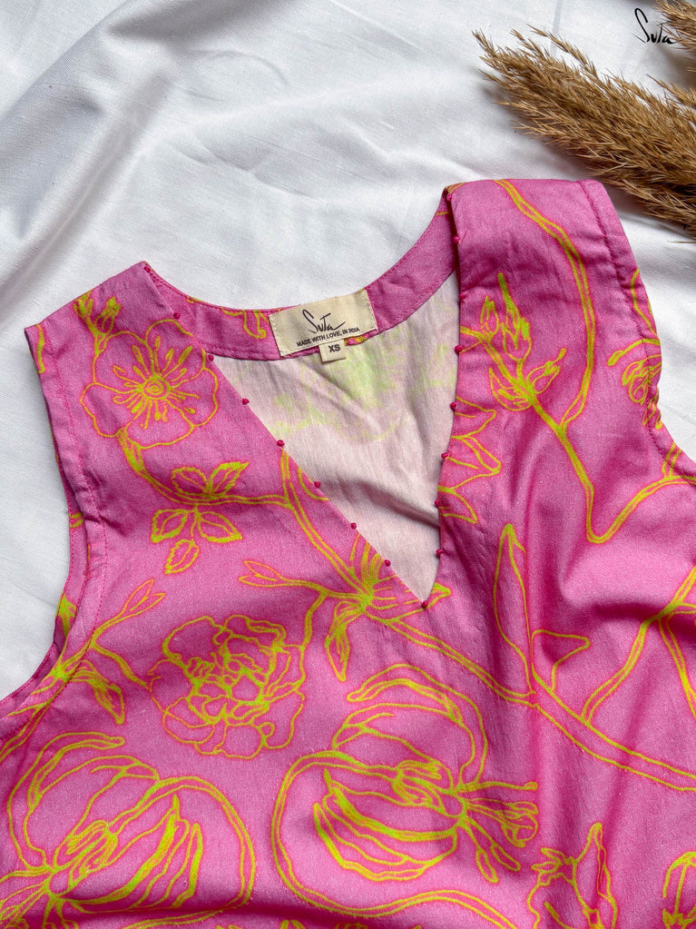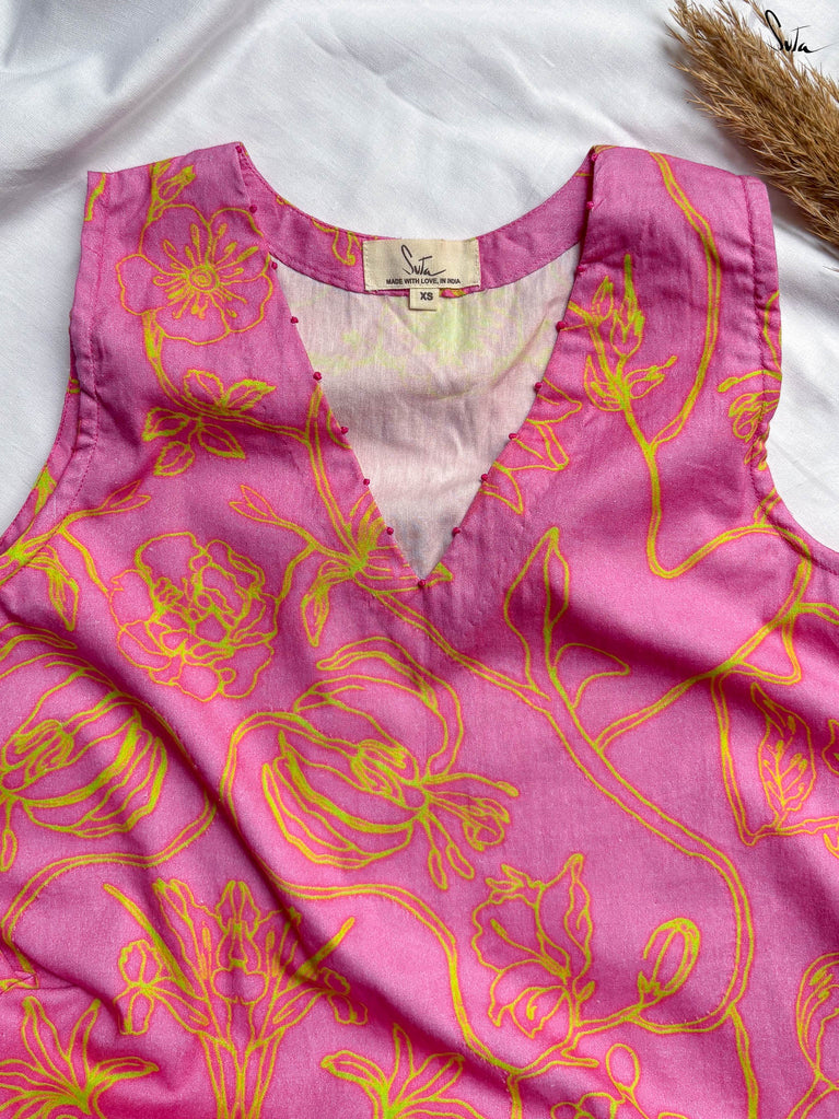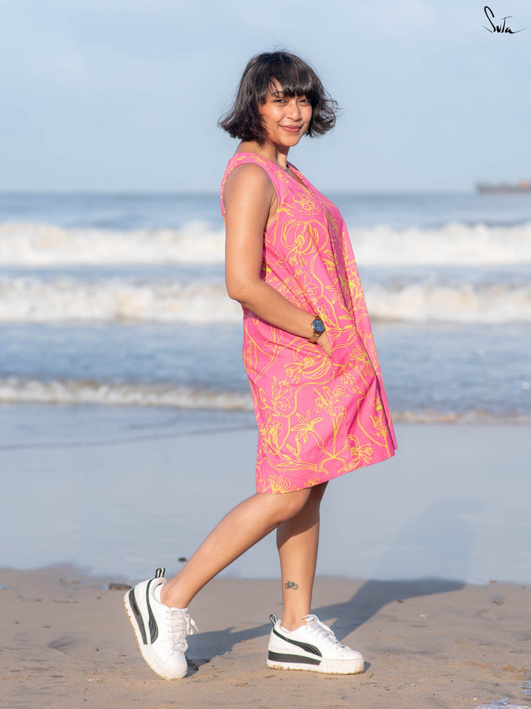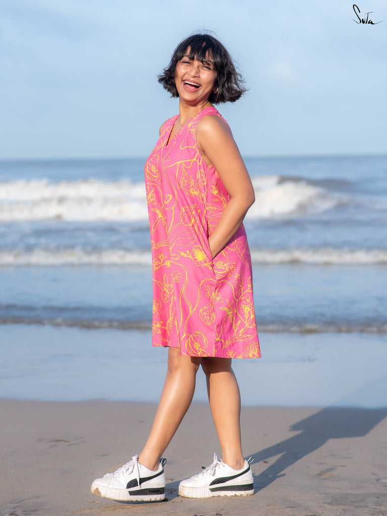 This digitally printed cotton dress is vibrant but wearable, think tropical florals with a sunlit edge. Cut in a sleeveless, V-neck silhouette with French knots stitched along the neckline, it pairs bold prints with subtle detail.