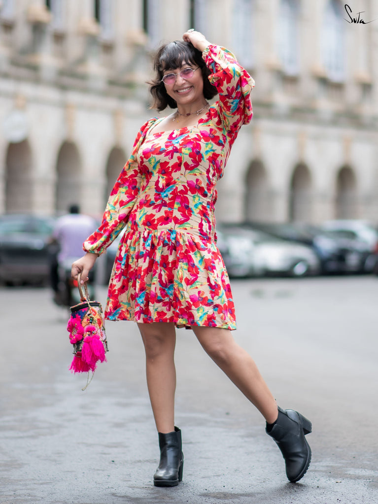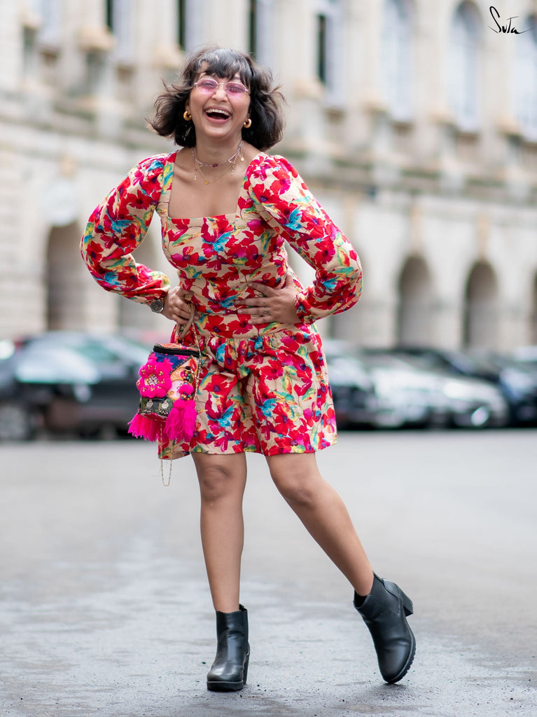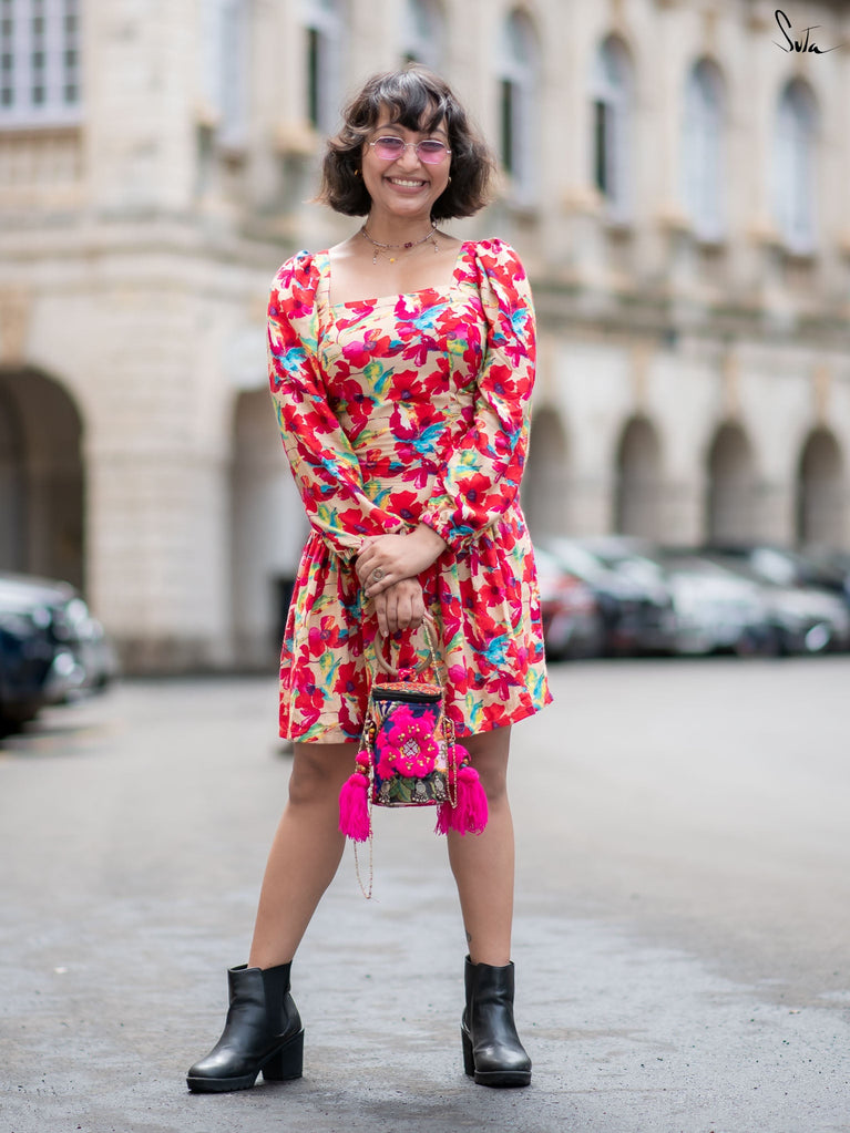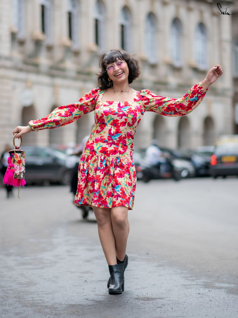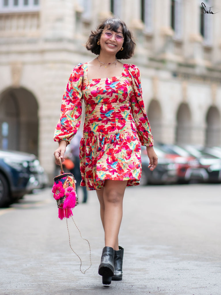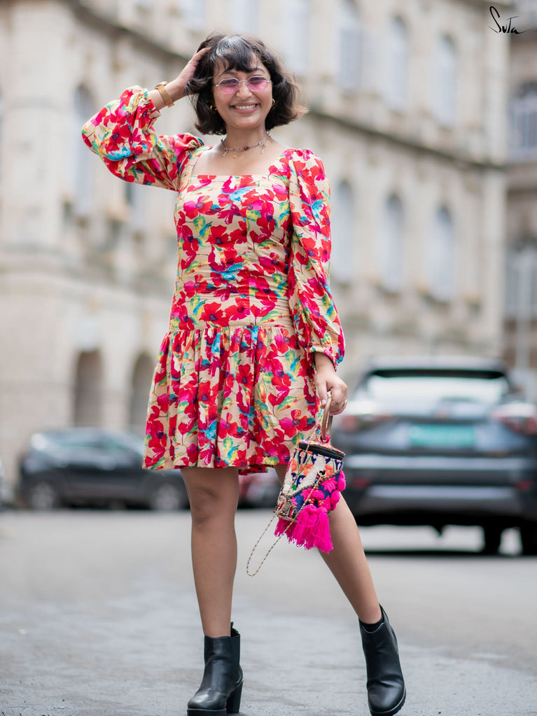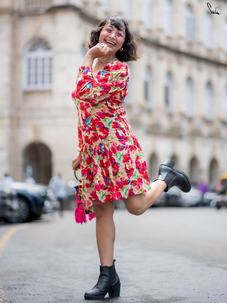 A blend of solid panels and floral print, this dress channels a carefree spirit rooted in balance. The digital artwork adds bursts of color without overwhelming, while soft frills at the hem bring gentle movement.
