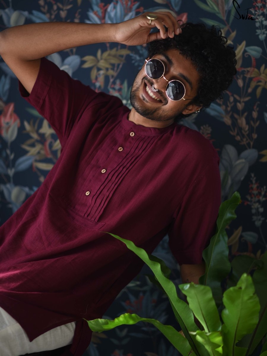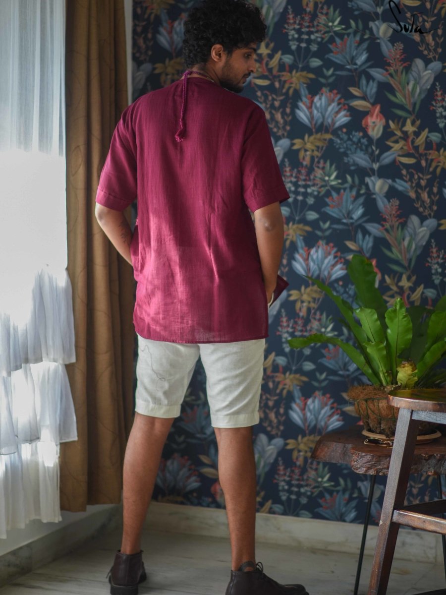 This maroon handloom cotton short kurta with half-sleeves is a breezy comfortable piece that will keep you at ease all day long and yet make a style statement.