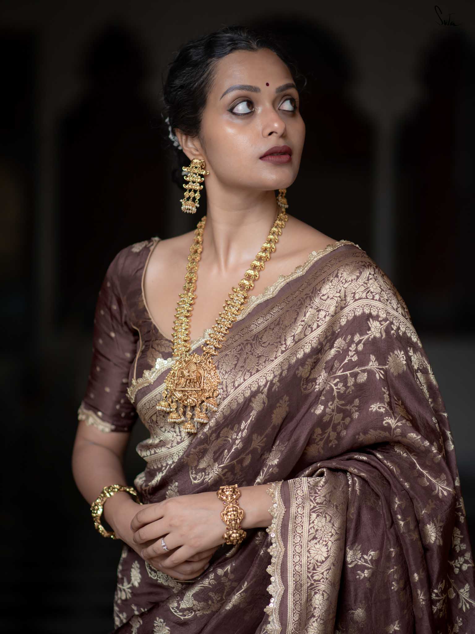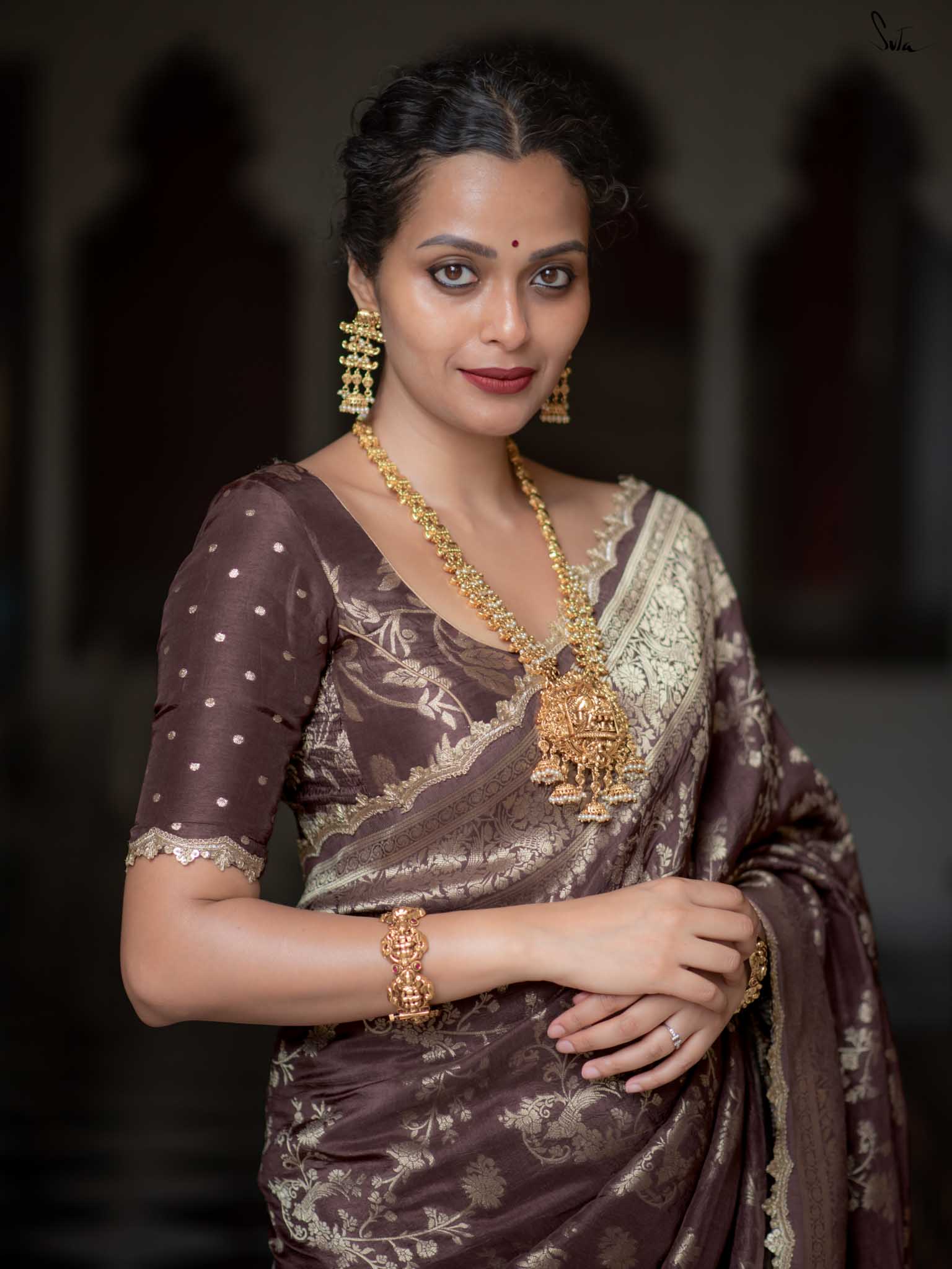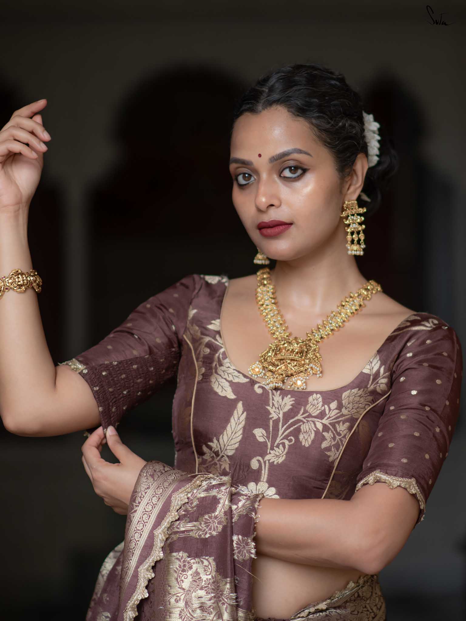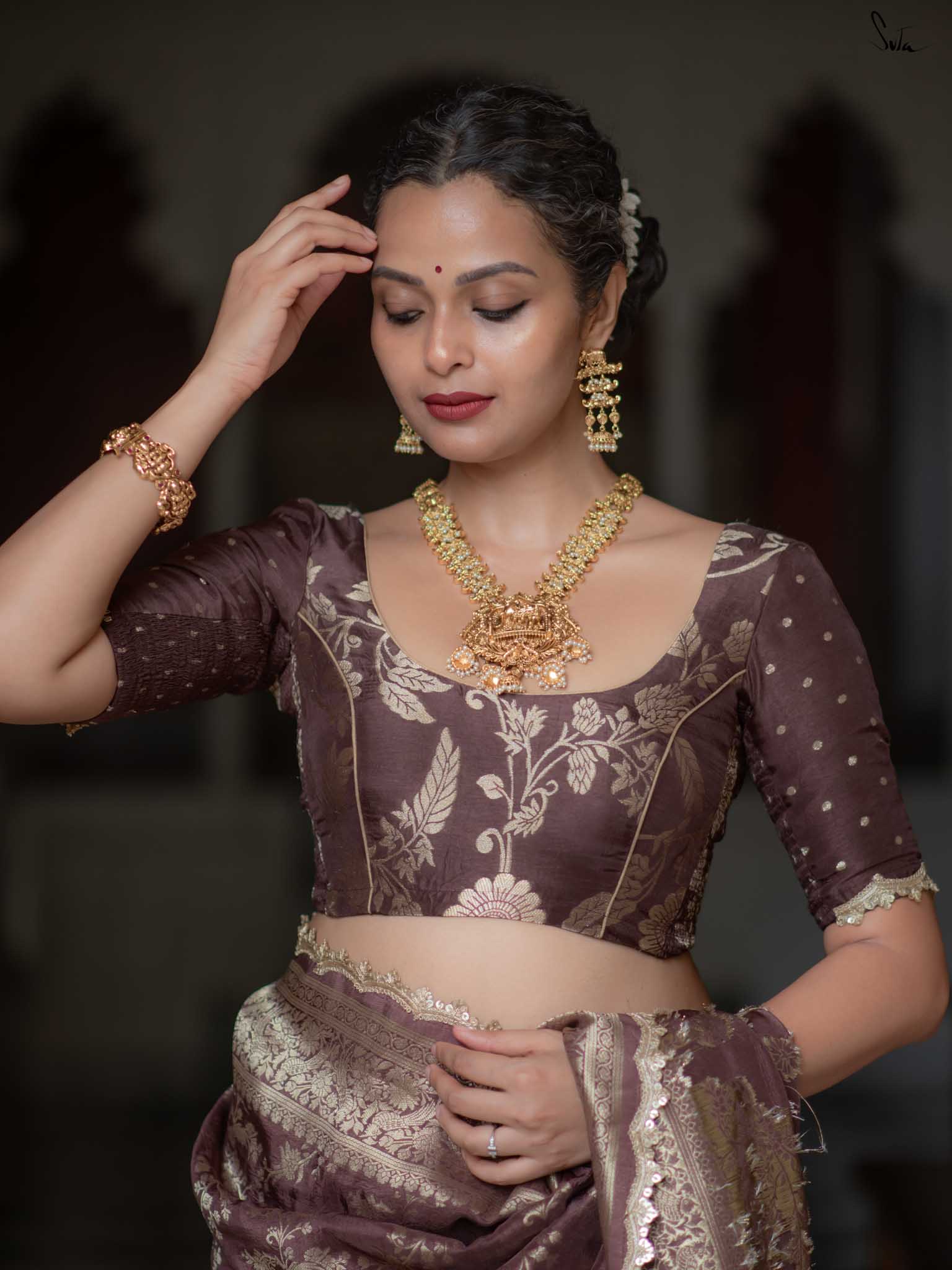 Grounded and graceful, Balushahi Hai in earthy brown viscose brings subtle glamour to every drape. With a round neck, elbow-length sleeves, and embroidered lace on jaal fabric, it balances tradition with understated style.