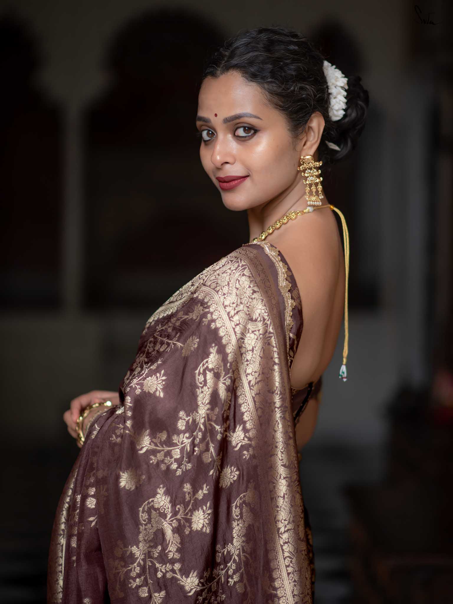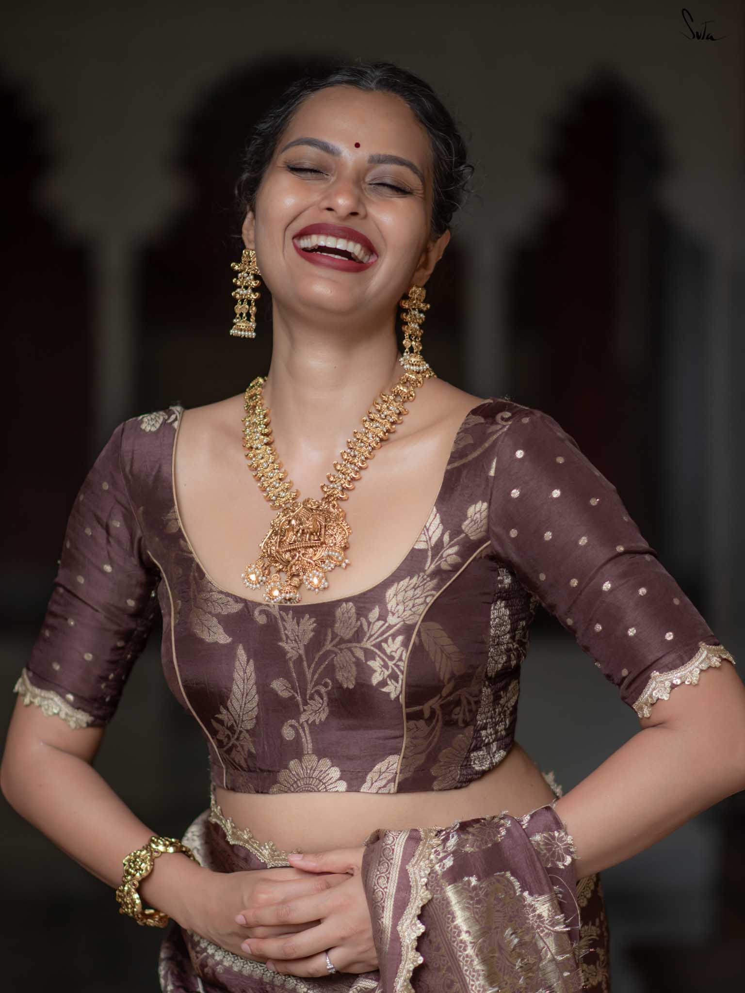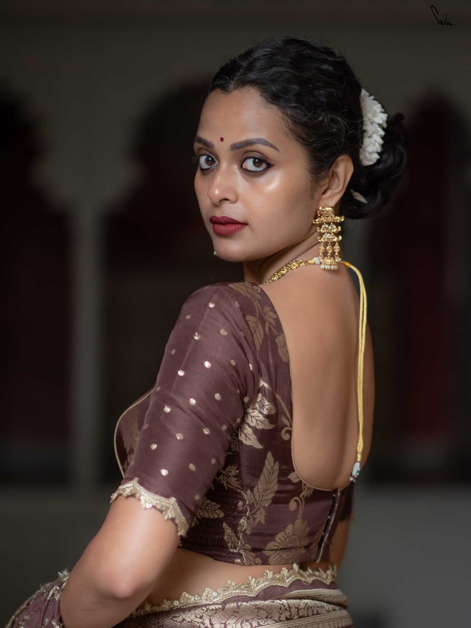 The model is wearing size S blouse and the saree is Patakha Hai