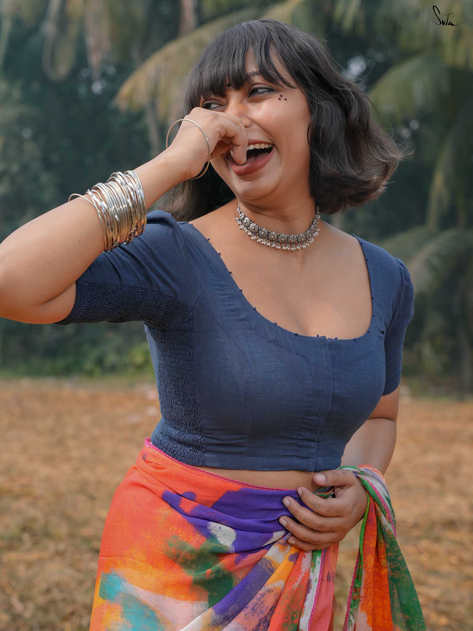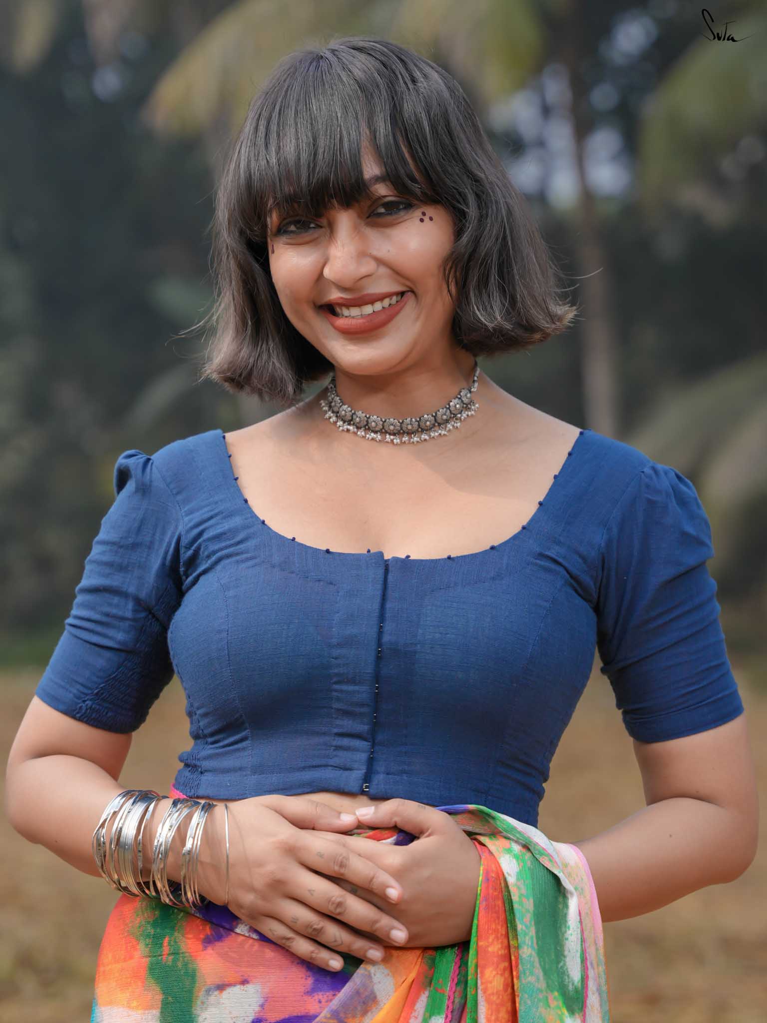 The model is wearing size S blouse and the saree is Dipped in Colours
