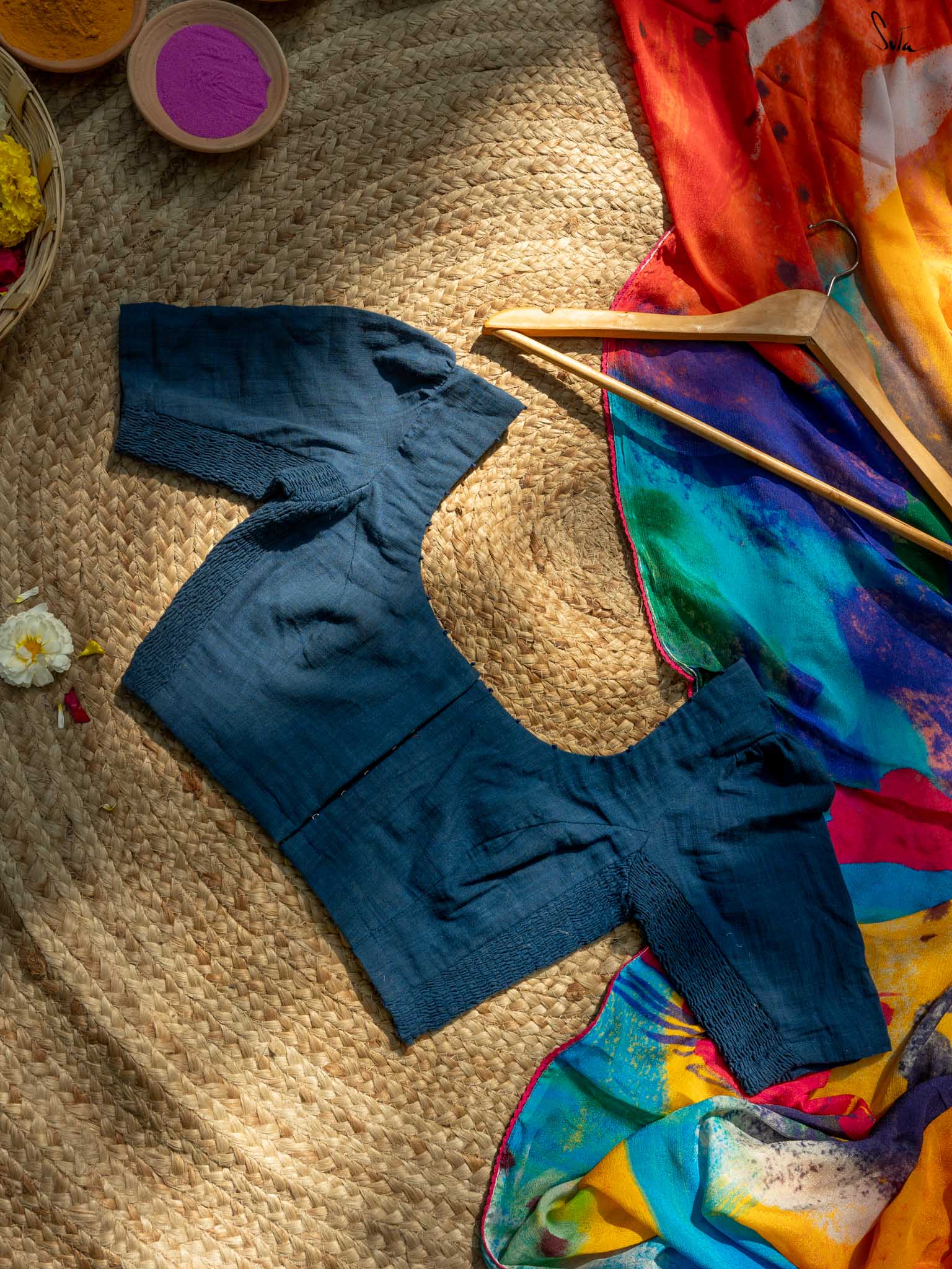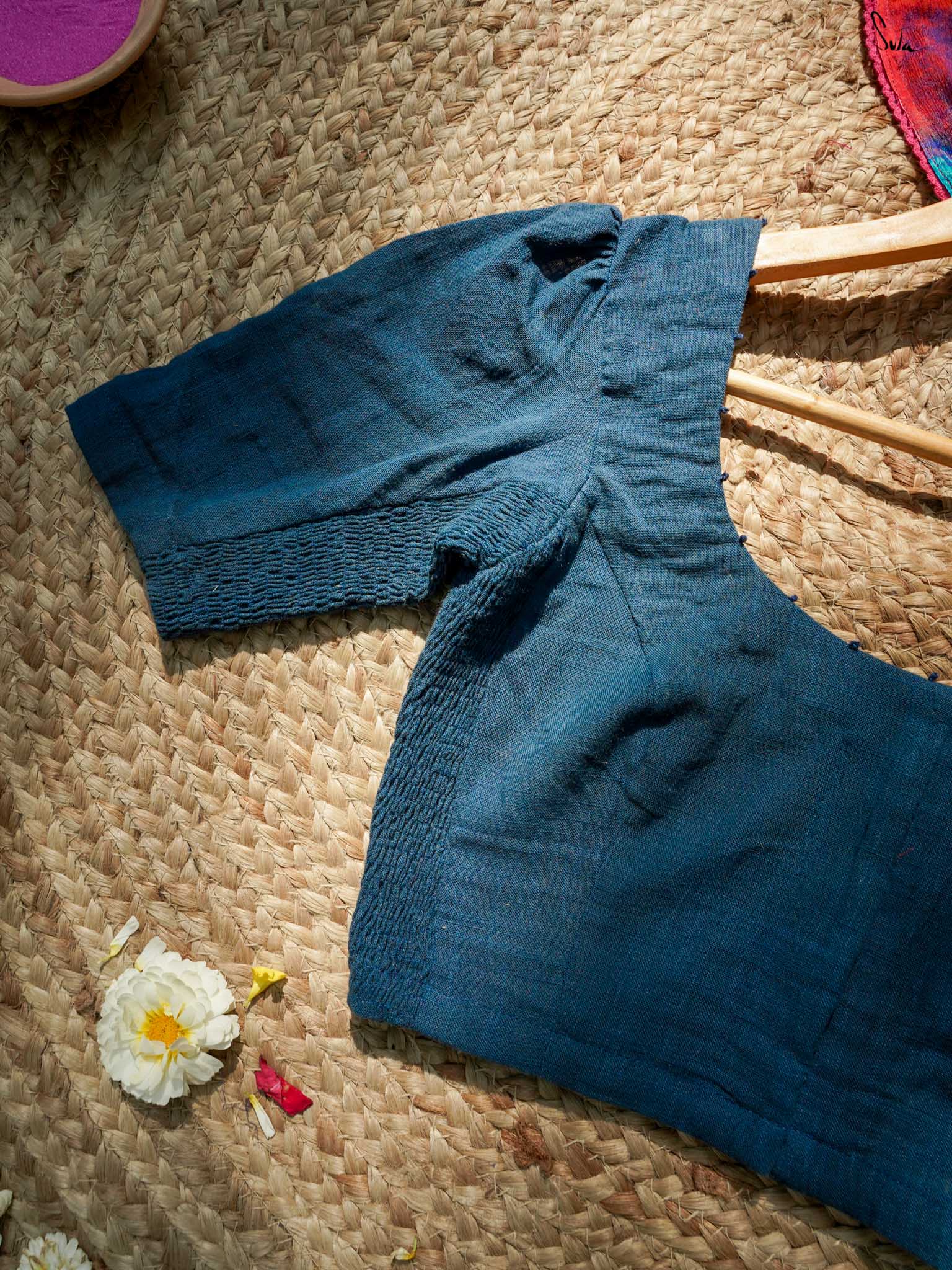 Timeless and graceful, this navy blue half-sleeved cotton blouse is your perfect partner for every Holi. The delicate French knot embroidery speaks of effortless charm, while the sleek U-neck and front hook opening make it as easy to wear as it is stunning. The Elas-Tech fit stretches to hug your body in a perfect fit, allowing you to move and revel in the festivities, wrapped in comfort and beauty. This blouse adapts to your movements, making you feel both stylish and at ease. For the ideal fit, we recommend shopping one size below, as it expands and molds to your body.