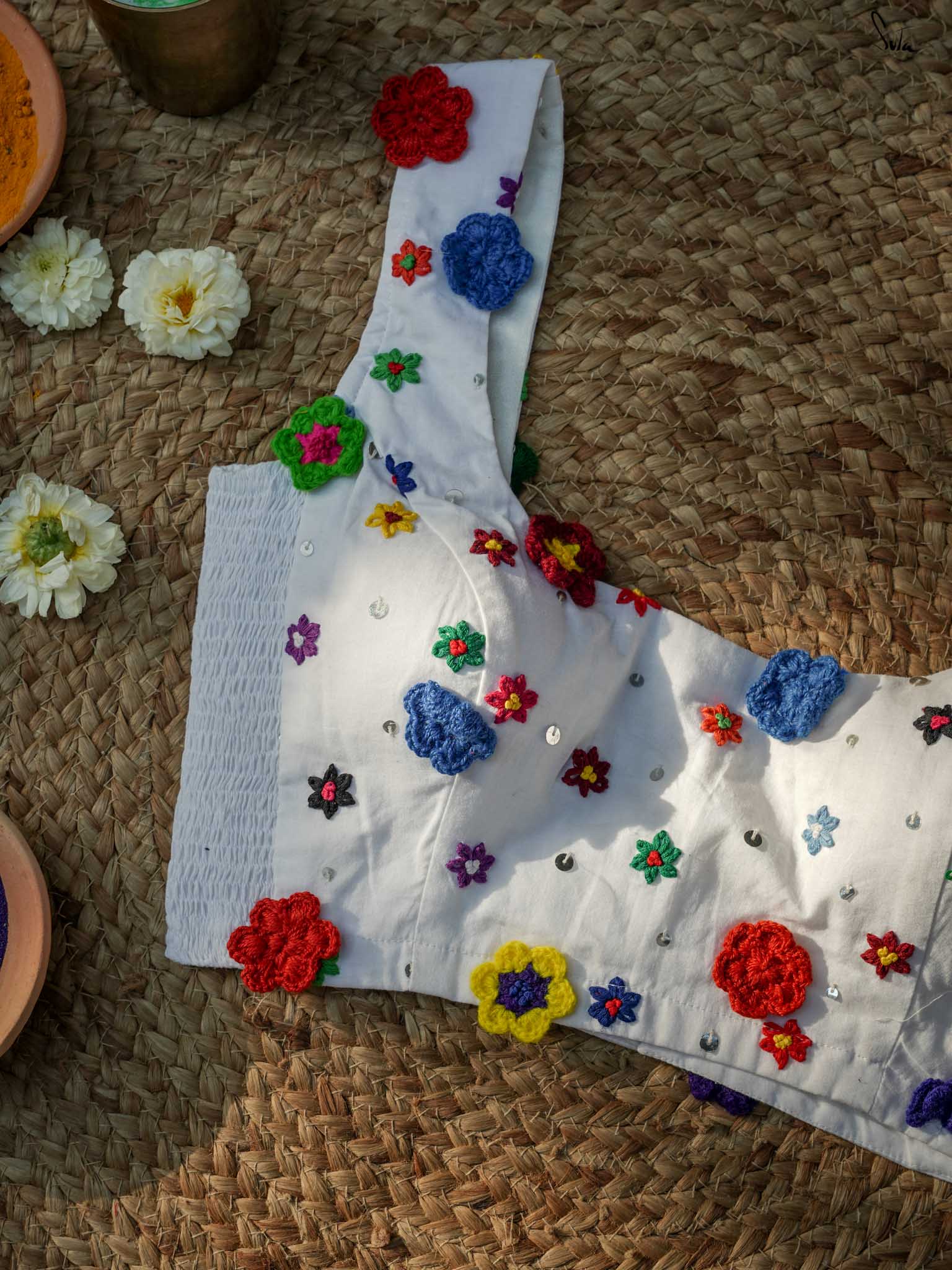 This white sleeveless cotton blouse is a floral fantasy, woven with the delicate magic of 3D crochet flowers. A symbol of blossoming joy, it hugs your body with the comfort of Elas-Tech, adapting to your shape like the festival itself, full of surprises. The 3-inch elastic shirring on both sides allows this blouse to stretch and move with you, providing both style and flexibility. The softback hook opening and U-neckline create a graceful, flattering fit, while the vibrant flowers dance like colors in the air. Wear it, and let the celebration begin. Shop one size below as it expands to fit your shape beautifully.