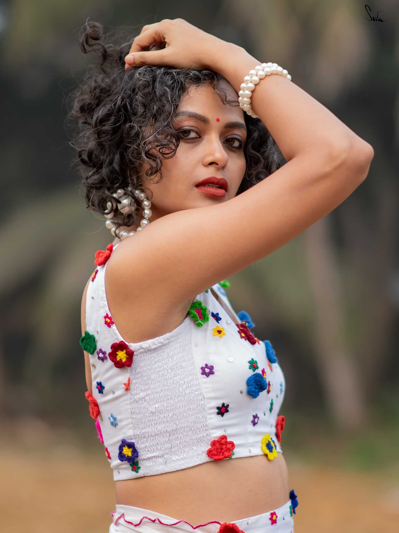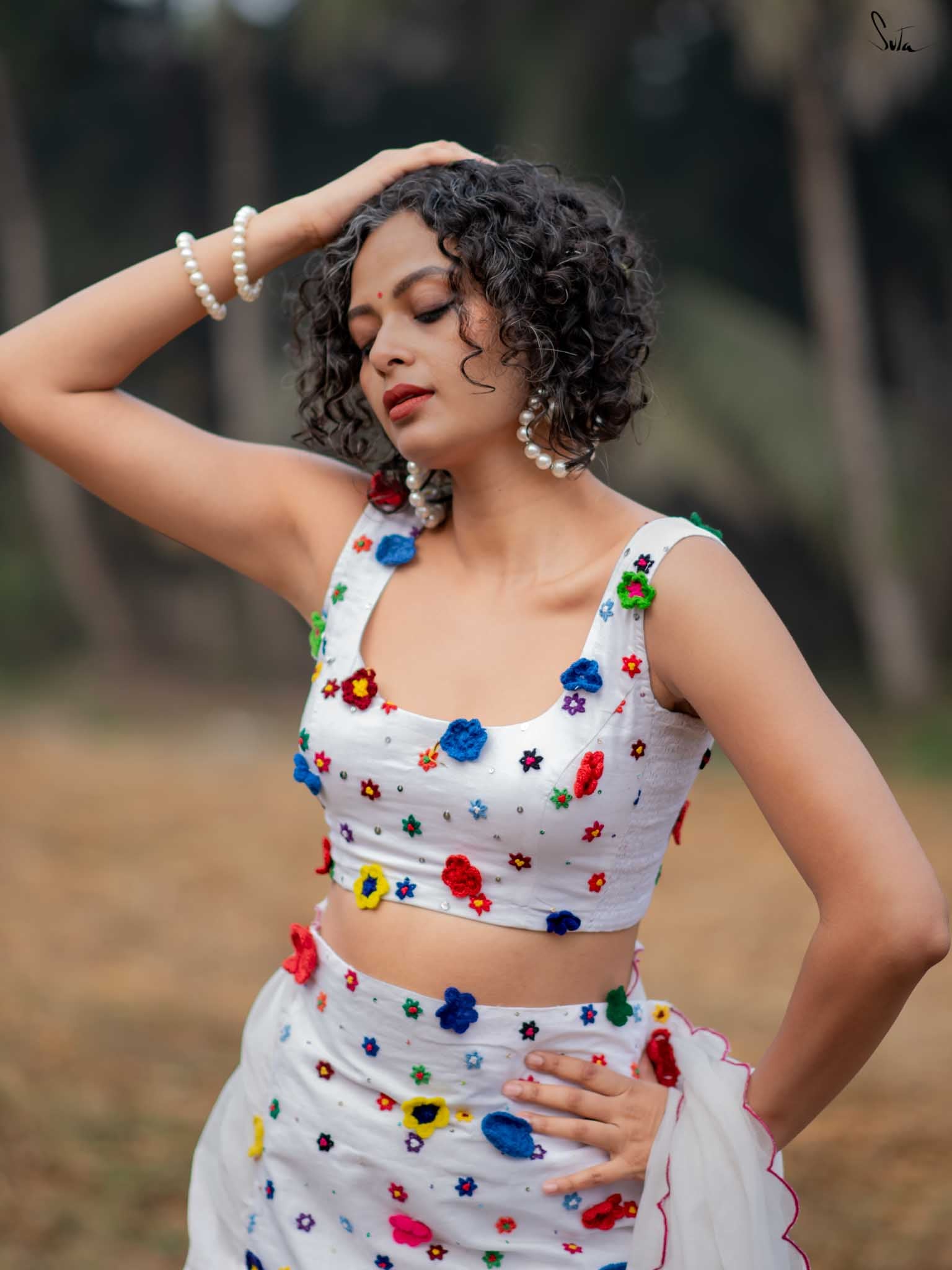 The model is wearing size S blouse and the saree is Dipped in Flowers