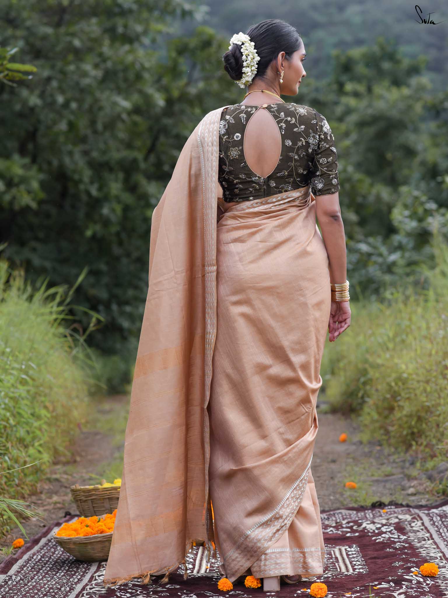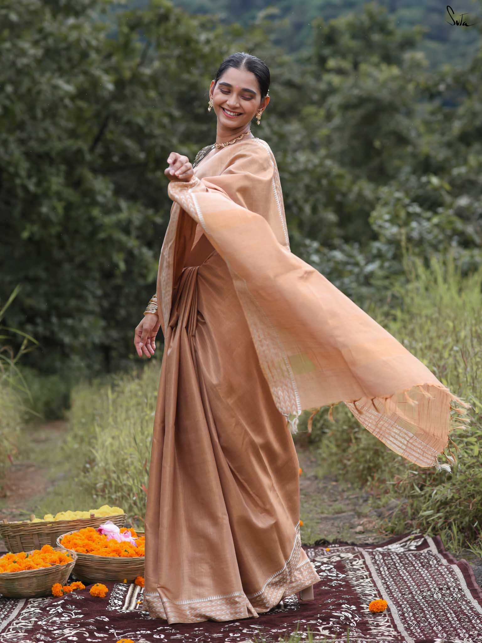 A gold saree that feels regal and luminous. The shade glows with liquid confidence and timeless charm. The geometric dobby border adds texture and balance, giving the saree a refined finish. Perfect for festive evenings that call for effortless elegance. Comes with a matching blouse piece, no fall.