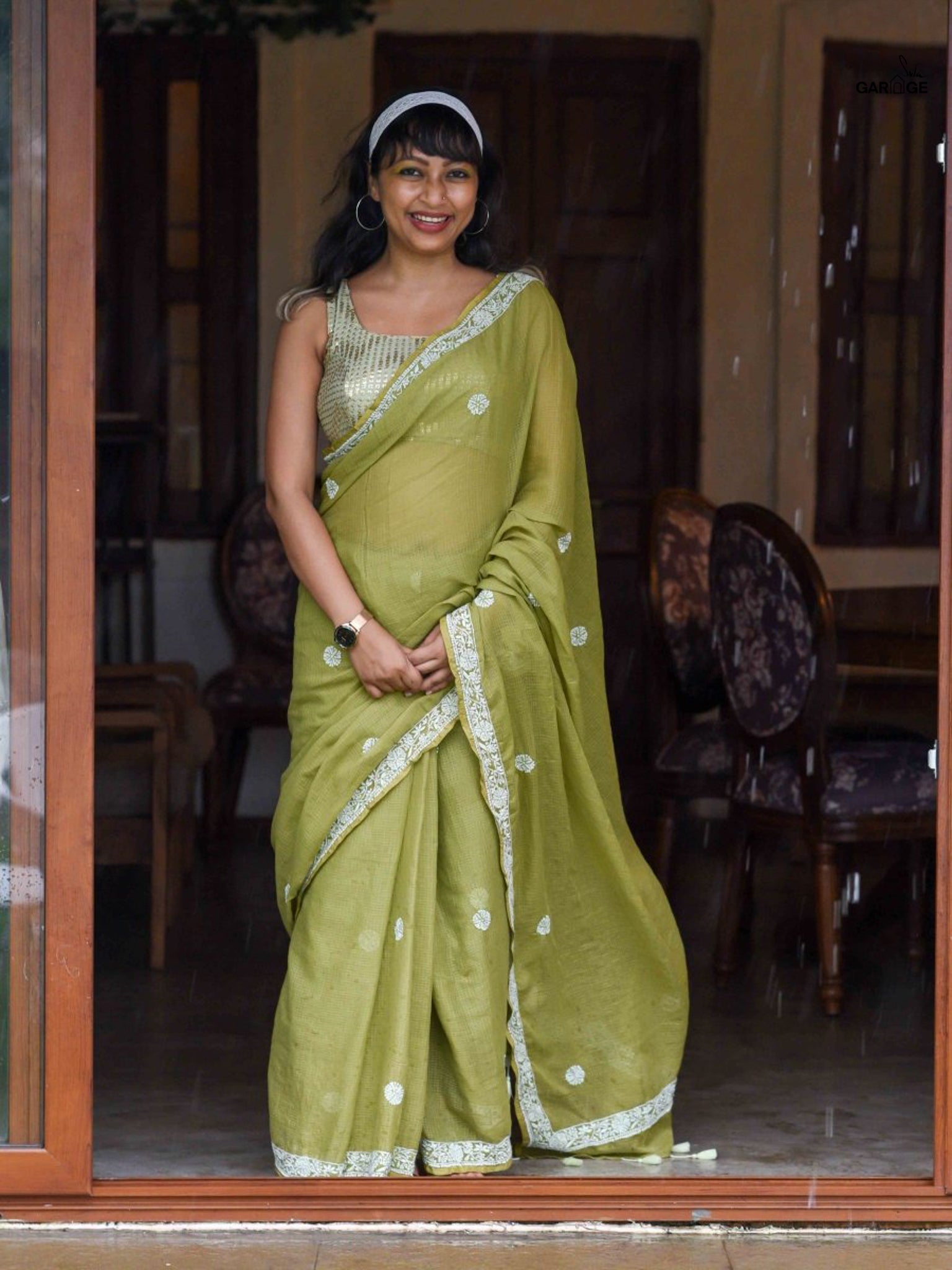 Kota cotton fabric is renowned for its softness, light weight and ease of wear. It is made using an open weave with fine checks, which are called ˜khats. This weave ensures that the resultant fabric is airy and comfortable. This Kota cotton fabric forms the base of these sarees, which are further embellished with Lucknowi chikankari work. Chikankari is a style of embroidery that has its roots in Lucknow, the capital of Uttar Pradesh. The word 'chikan' is derived from the Persian word 'chikeen'. In its most traditional form, chikankari work reflects the influence of the intricate carving patterns found in Mughal architecture. The legacy of chikan work in Lucknow dates back to more than 200 years.