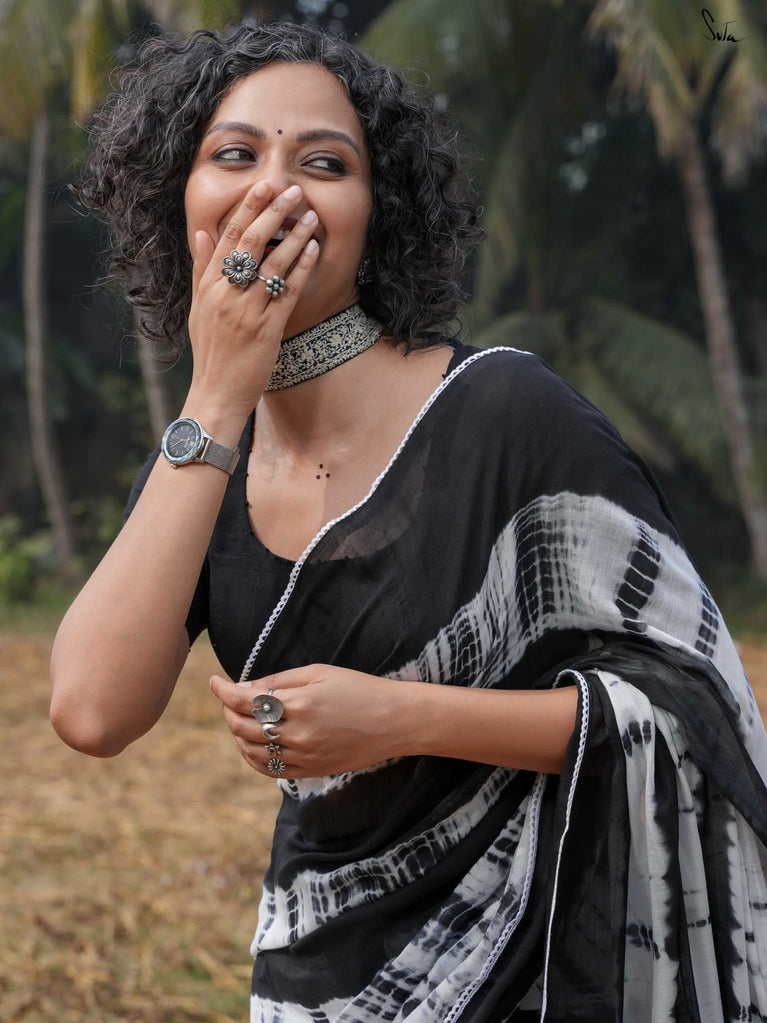 Under the moonlight, everything seems a little more magical like this black-and-white mul modal saree. Its tie-dye artistry and patchwork meet the quiet elegance of the night sky, where the stars shine in their subtle sheen. It’s a celebration of contrasts, dark and light, bold and soft capturing the essence of Holi when night falls, and the half half colors settle into the memories of the day. The lace, scalloped and soft, adds a celestial grace, while the jhalar tassels twinkle like stars in the night sky.