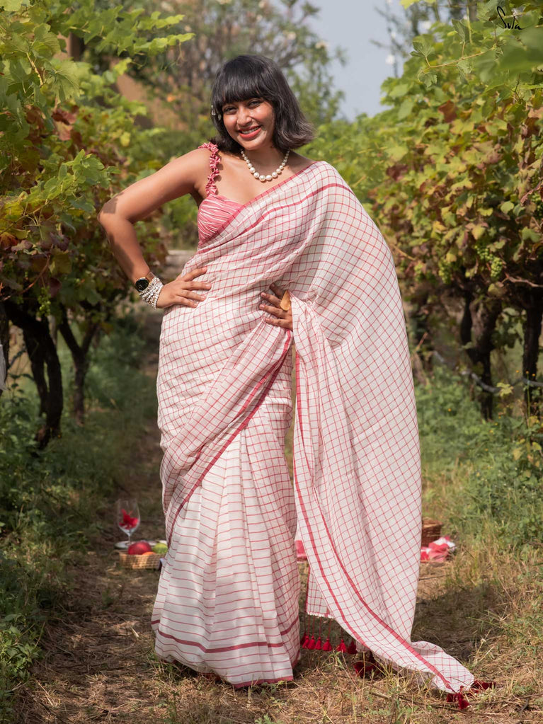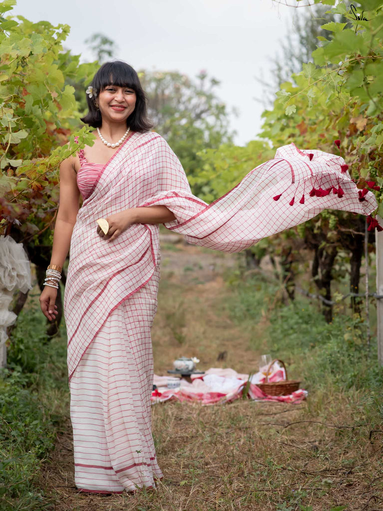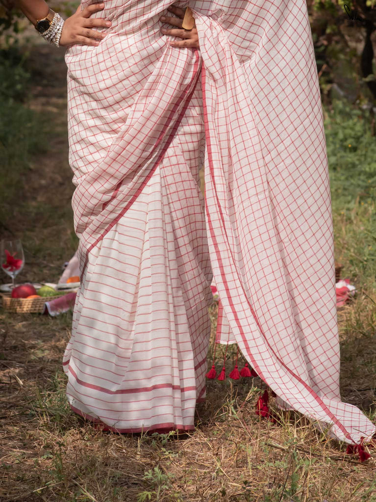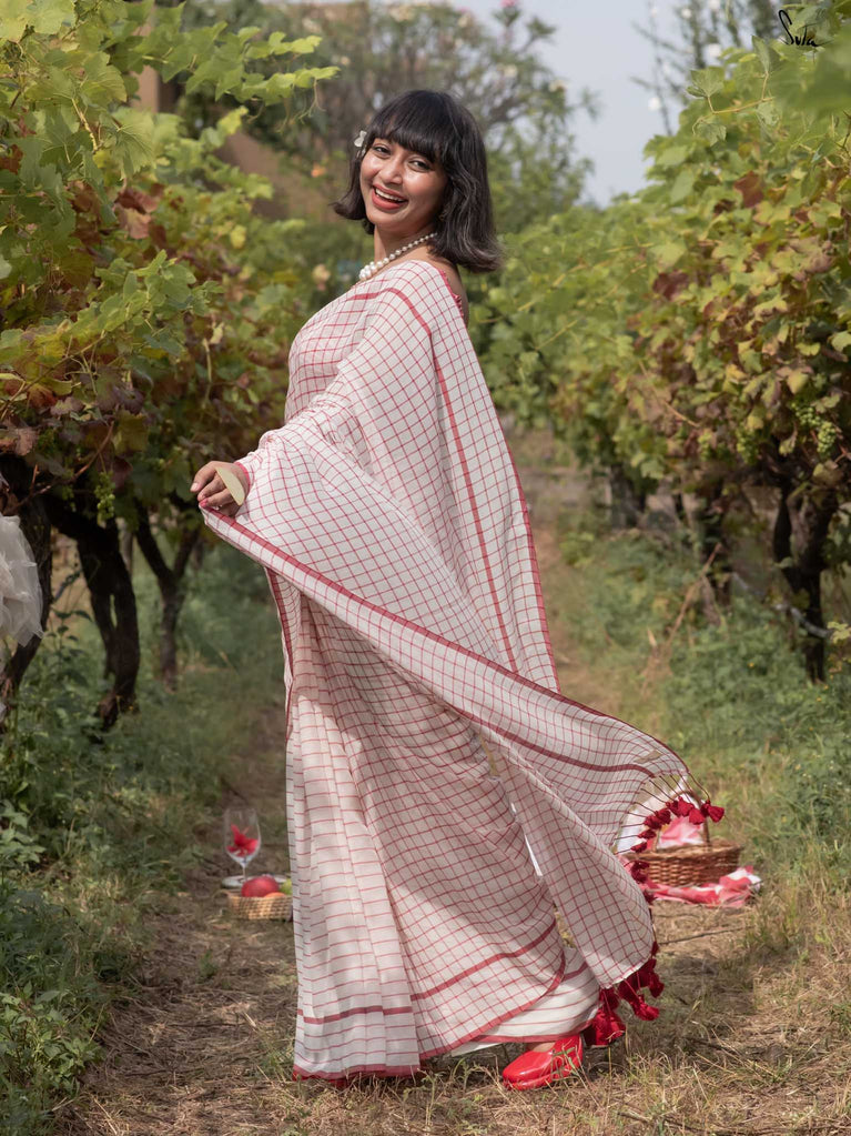 Imagine the flutter of a heartbeat that skips a beat, the rhythm quickening with every thought of love. Dil on Grid captures this very essence in its weave. Crafted from soft mul cotton, the saree features delicate off-white, maroon checks and stripes, coming together in a harmonious visual melody. Playful maroon tassels dance gracefully along the pallu, bringing a hint of charm to the ensemble. This saree comes with a matching striped blouse piece attached.