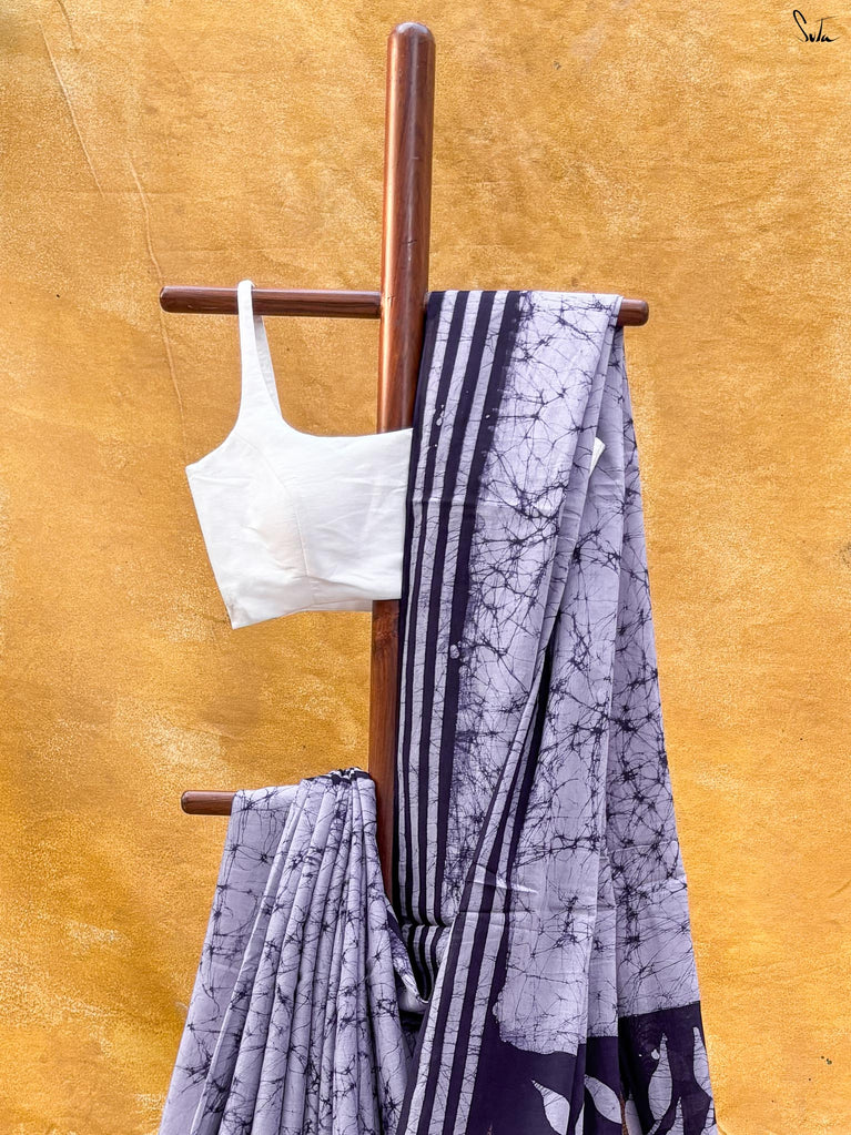 Calm, composed, and quietly elegant - Ash Phool is summer cotton at its most understated. Crafted in soft mul cotton, this bluish grey saree drapes lightly and feels feather-soft on the skin. A classic gold zari border adds a gentle shimmer, keeping the look timeless and refined.Perfect for long days, subtle dressing, and effortless repeats, Ash Phool is comfort with a touch of glow.