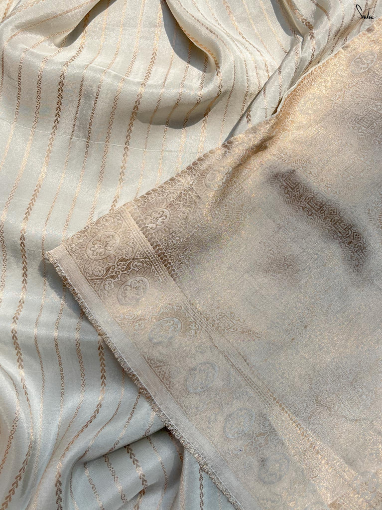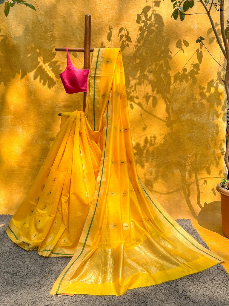 Some colours don’t just meet, they hum together softly. This crushed viscose zari saree pairs the brightness of yellow with the charm of pink, creating a contrast that feels lively and full of warmth. The crushed texture of the viscose lends the saree a beautiful fluidity, making the drape feel effortless and graceful. Decorative gold lace along the borders adds a delicate shimmer, bringing a subtle festive touch to the vibrant colours.