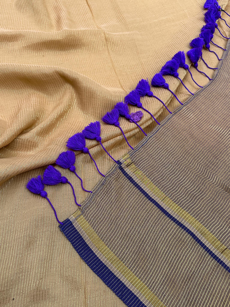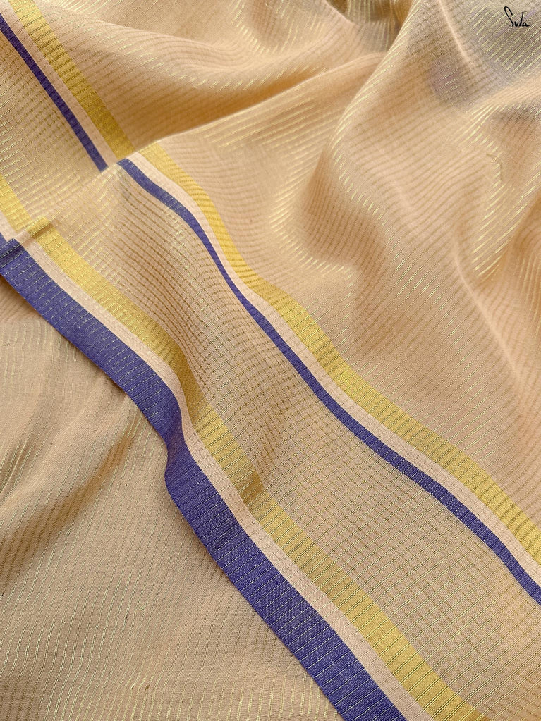 Two colours meet like melodies in conversation. This crushed viscose zari saree brings together the warmth of mustard and the depth of purple, creating a striking contrast that feels both bold and harmonious. The textured crush of the viscose lends the drape an effortless fluidity, while delicate gold lace along the borders adds just the right hint of festive shimmer.