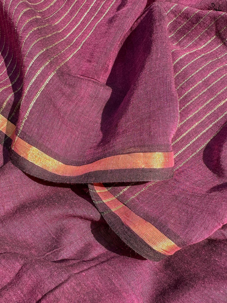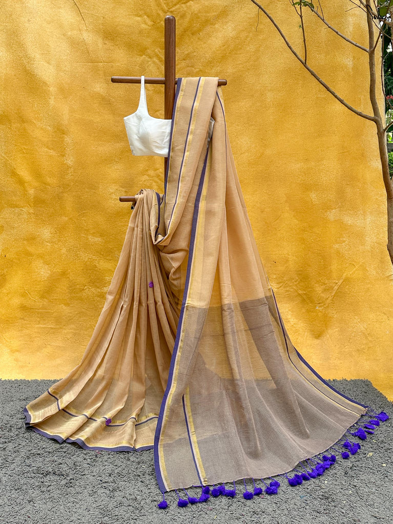 Warm, grounded, and quietly elegant - Clove Phool is summer cotton in a deeper, richer tone. Crafted in airy mul cotton, this brown saree drapes softly and feels feather-light on the skin. A classic gold zari border adds just enough glow, keeping the look timeless and easy.It’s the kind of saree you reach for on long days, slow evenings, and everything in between - effortless, breathable, and endlessly wearable.