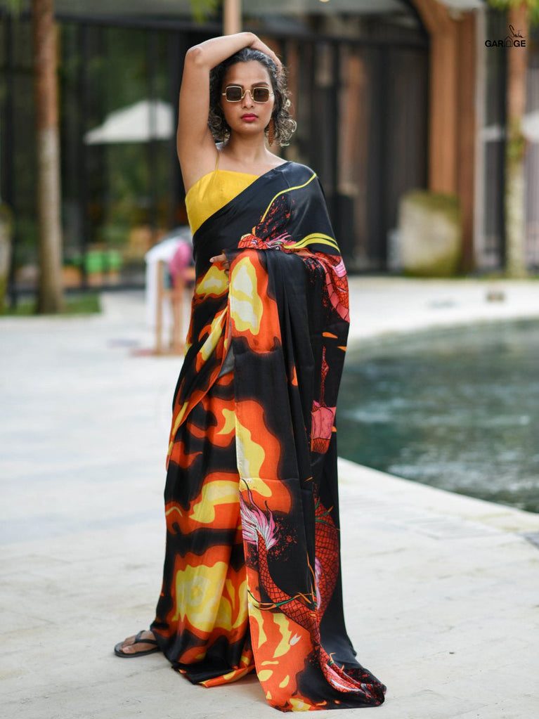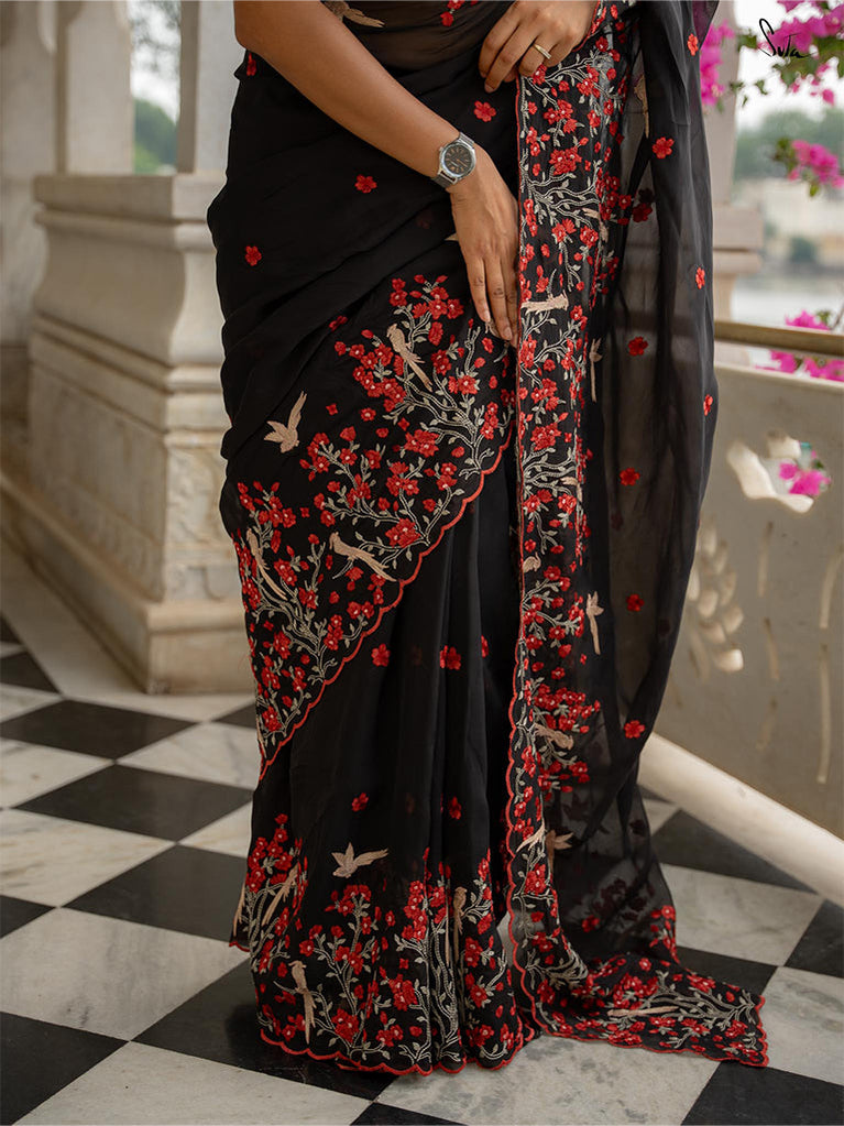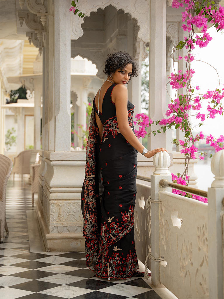 This black saree is crafted from viscose organza fabric with intricate embroidery, depicting soothing scenes of cherry blossom trees and birds. The tiny red flower buttis dancing all over the saree is the optimal final touch.