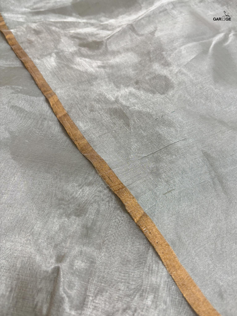 This saree has been handwoven by a master weaver in the Mashru tradition. The Mashru weave is said to have originated in West Asia, in the 19th Century. The fabric is woven with a silk weft and a fine cotton warp. It thus combines the ageless comfort of cotton and the timeless aesthetic of silk, elevated by the presence of gold and silver zari.