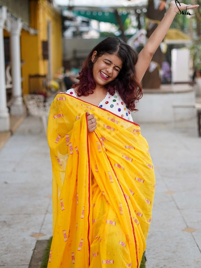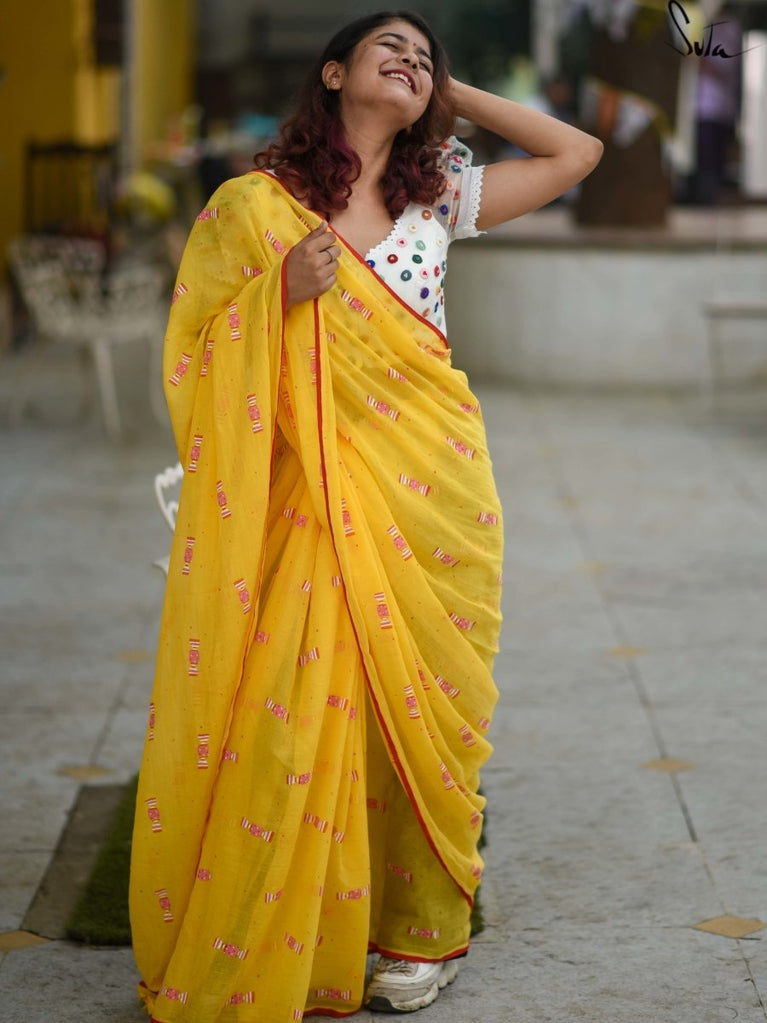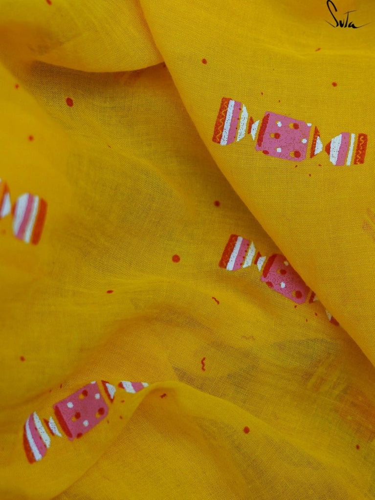 This gorgeous yellow-red mul cotton saree with screen-printed candy design on it calls out to the child in you!