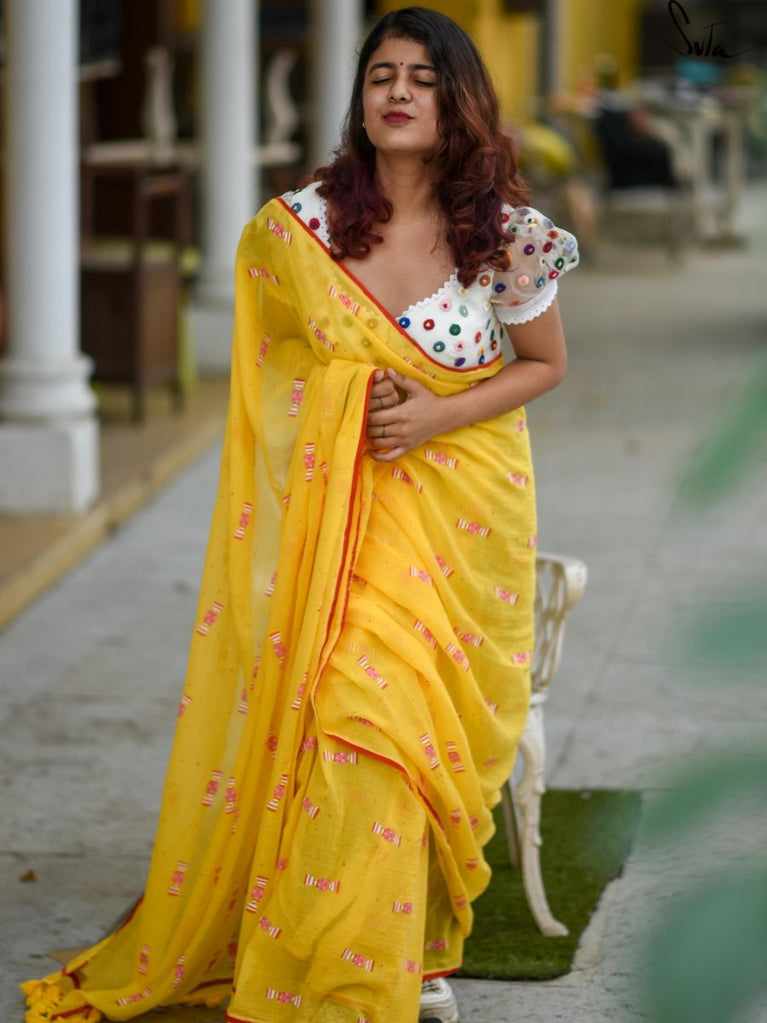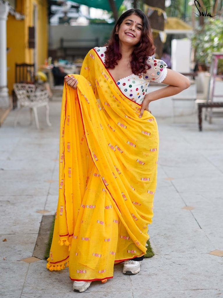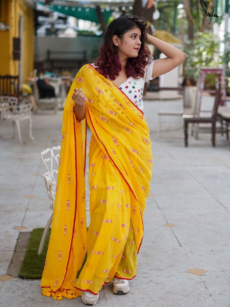 Let your light illuminate the path for everyone around you, when you wear this beautiful cotton saree embellished with zari and hand-embroidered chumkis (sequins).
