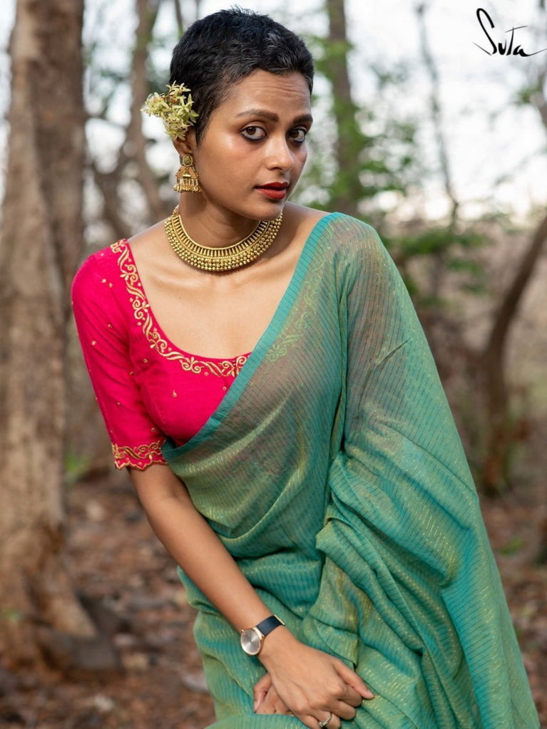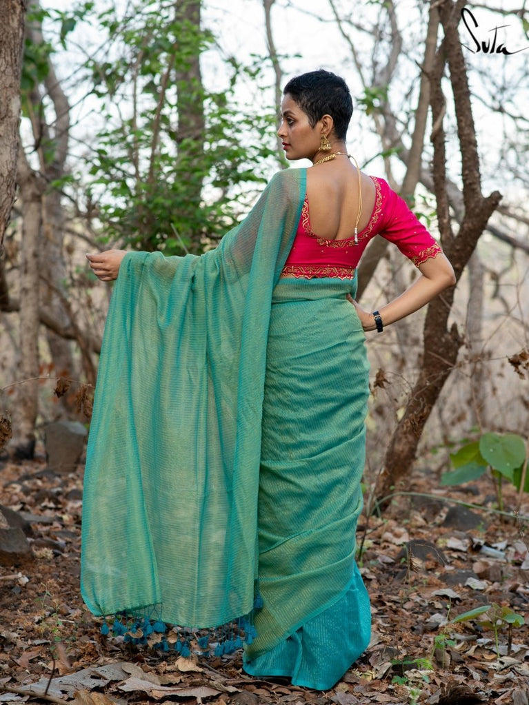 Embrace yourself as you are, for who you are, in this striking blue and green cotton saree with zari detailing.